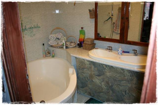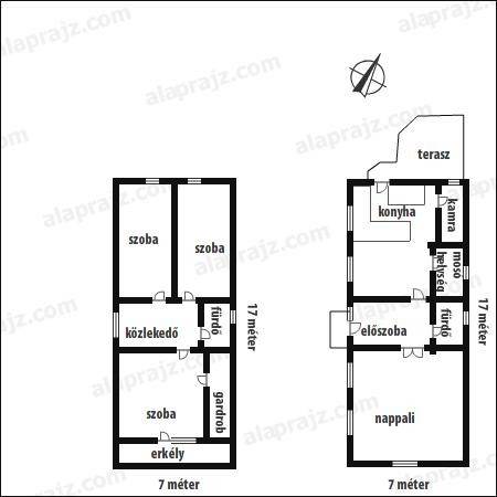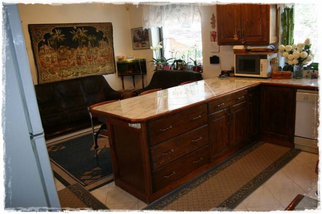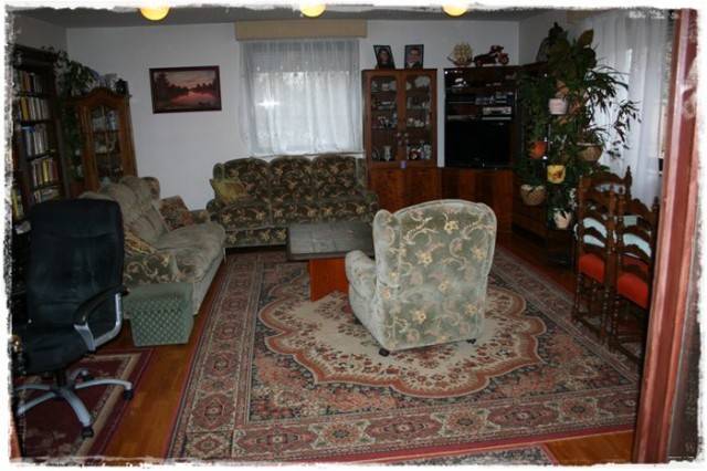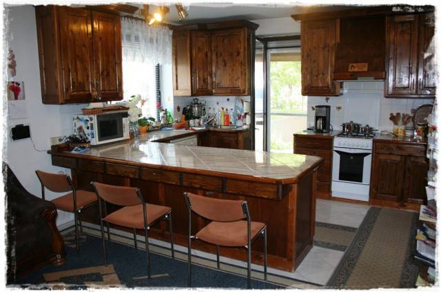 Az első épület földszintjén 12 m2-es előszoba, 30 m2-es konyha + étkező (amerikai stílusban), 3,5 m2-es éléskamra, 5 m2-es mosókonyha, 6 m2-es sarokkádas fürdőszoba + WC és egy 42 m2-es nappali van. A konyhában, étkezőben és a nappaliban lévő bútorok megegyezéssel átvehetők.