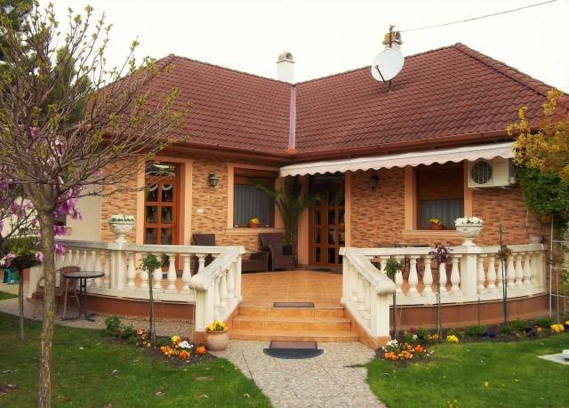 Kifogástalan állapotú, exkluzív családi házat kínálunk eladásra az alföldi kisváros csendes zöldövezetében. A családias hangulatú utcában álló ingatlan 1998-ban épült mediterrán stílusban, 38-as porotherm téglából, amelyet Terranova hőszigetelő vakolattal és Baumit színezővel láttak el. A különleges hangulatú, 140 nm hasznos alapterületű épület tágas, világos nappalit, a hozzá kapcsolódó három szintén tágas hálószobát, étkezőt, konyhát , kamrát, két fürdőszobát és wc-t foglal magában. A lakóhelyiségeket részben parkettával, részben modern kerámialappal burkolták, a falakat esztétikus tapétával fedték. Az összközműves családi ház fűtéséről energia takarékos Weissmann kazán, valamint egy hagyományos kandalló gondoskodik. A ingatlant klímával, ipari árammal, internettel, riasztó berendezéssel, elektromos kapuval és kamera rendszerrel is felszerelték. A gépkocsik tárolására két beállásos garázs szolgál. A 2.460 nm-es telken elterülő parkosított udvar, a számtalan dísznövény és a gondozott, termő gyümölcsfák öntözéséhez szükséges vízmennyiséget saját kútról oldották meg. A kert végében, a Fűzvölgyi Főcsatorna partján kiépített stég kiváló lehetőséget nyújt a gondtalan pihenésre, horgászatra.