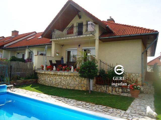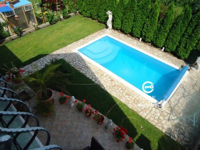 | riasztó, étkező, kaputelefon, amerikai konyha, saját parkoló, beépített konyhabútor, beépített szekrény, vízórás, kocsibeálló, garázs, terasz, internet, pince, parkettás, kábeltévé, kert, melléképület, erkély, medence, egyedi fűtés, összközműves, tégla |