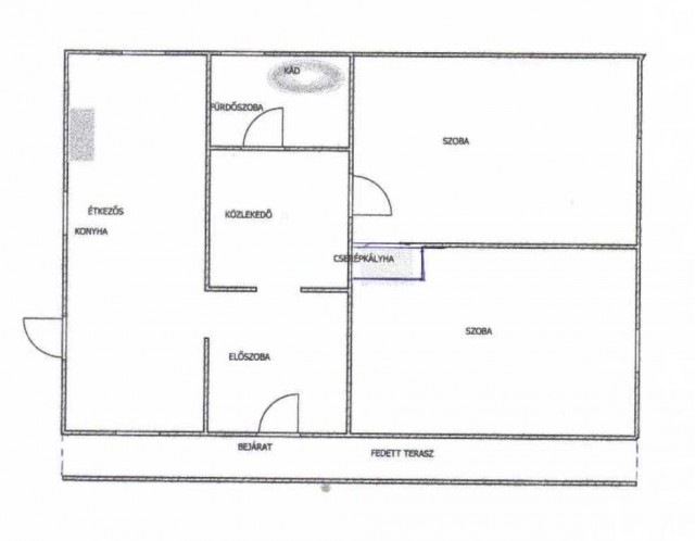 A lakóingatlanba fedett verandán keresztül jutunk be, ahol tágas el?szoba, kádas fürd?szoba, utcafronton két külön nyíló szoba valamint 19 m2-es bútorozott és gépesített étkez?s konyha található. Az étkez?s konyhából az elképzelés alapján kialakított teraszra jutunk. A két szoba között épített cserépkályha biztosítja a meleget. Az ingatlan melegvizét villanybojler biztosítja.