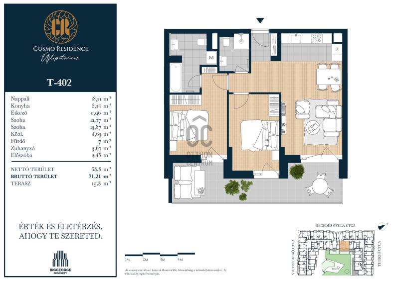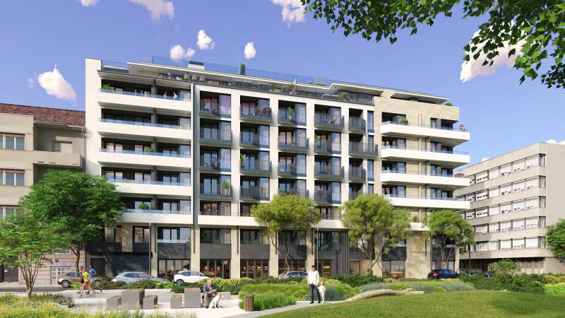 Projekt bemutatásaBudapest egyik legvonzóbb és legkeresettebb városrészében, Újlipótváros szívében egy új, exkluzív lakópark épül: az Cosmo Residence. A Hegedűs Gyula, Visegrádi, Victor Hugo és Thurzó utcák által körülhatárolt területen elhelyezkedő ingatlanfejlesztés a városrész ikonikus, nagypolgári hangulatát ötvözi, modern életstílussal, magas színvonalú építészeti megoldásokkal és első osztályú kényelemmel.A Cosmo Residence nemcsak egy újabb lakópark – hanem egy életstílus, amely a belvárosi pezsgést és a nyugodt, zöld környezetet egyaránt biztosítja lakóinak. Az ingatlan 2027. első felére készül el, és összesen 230 változatos méretű és elrendezésű lakást kínál, a 32 m2-es stúdiólakásoktól kezdve egészen a tágas, 125 m2-es, nappali + három hálószobás lakásokig. A legtöbb lakás erkéllyel rendelkezik, a legfelső szinten pedig exkluzív penthouse lakások várják azokat, akik a privát tetőterasz nyújtotta különleges panorámát szeretnék élvezni.A lakások tervezésekor több mint 4000 vevői visszajelzést vettünk figyelembe, így a terek és elrendezések maximálisan alkalmazkodnak a mai modern élet igényeihez. A belső kialakítások során lehetőség van egyedi igények figyelembevételére is, amit belsőépítészeti kollekciók segítenek. A 8 szintes épületben változatos méretű üzlethelyiségek is kialakításra kerülnek, melyek a földszinten kapnak helyet, további kényelmet biztosítva a lakók számára.A Biggeorge Property legújabb fejlesztése, a Cosmo Residence Budapest 13. kerületének közkedvelt helyszínén, Újlipótváros szívében épül, a Hegedűs Gyula, Visegrádi, Victor Hugo és Thurzó utca által határolt területen. A környék hangulatát tükröző épület 230 energiahatékony otthont kínál, amelyek megfelelnek a legújabb környezettudatos elvárásoknak. A fejlesztés részeként üzletek, tárolók és gépkocsi-beállók is kialakításra kerülnek, amelyek tovább növelik az épület lakóinak kényelmét.