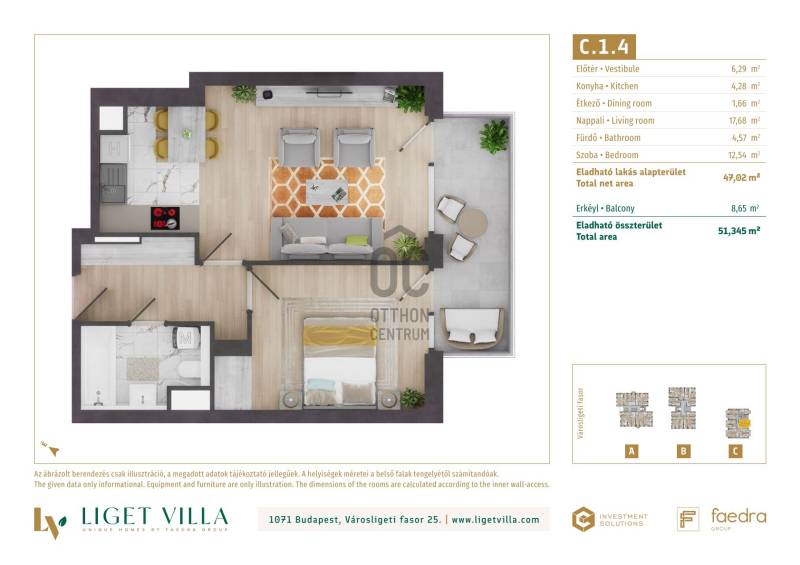 Projekt bemutatásaAki többre vágyik, mint egy átlagos lakópark, most hazaérkezett! Itt élni, itt lakástulajdonosnak lenni, egyet jelent a minőséggel.Az épületrőlA pesti diplomatanegyed legszebb utcájában épül, a megjelenésében, műszaki tartalmában és a lakáskínálata tekintetében egyaránt unikális, Liget Villa Lakópark. Az épületbe érve, egy elegáns lobby és recepcióra érkezünk majd. Innen a három épületet egy kerti úton, passzázs köti majd össze. A tervezés során nagy hangsúlyt kapott a családi igényekre tervezett lakás minőségi használhatósága. Ablakos konyhák, master bedroom-ok, dupla fürdőszobák, gardrób és háztartási helyiségek is helyet kapnak a lakásban. Kiemelten jól bútorzható, két irányba tájolt lakások kerülnek kialakításra. A földszinti lakásokhoz 50-100 m2-es privát kertek, míg a közös területeken tájépítész által tervezett reprezentatív kertet alakítunk ki. A lakásokban mennyezeti hűtés-fűtés biztosítja a téli-nyári kellemes komfortérzetet. A nyílászárók 3 rétegű üveggel, alu-fa kivitelben kerülnek beépítésre. A lakások ára tartalmazza alapárban az alu elektromos redőnyöket és okosotthon kiépítést is. Magas minőségű olasz és spanyol hidegburkolatválasztékban akár 60x60 cm-es lapok is válaszhatóak majd. A fa parketta és az átlag feletti minőség szaniterek, szintén alapárban válaszhatóak a lakásokba. Az épületek alatti mélygarázsban gépkocsibeállók és tárolók kerülnek kialakításra. A környékről:A környék közlekedése kiváló. 5 perc sétával elérhető a Andrássy úton a kisföldalatti. A szomszédos Balzac utcában és Dózsa György úton is számos buszjárat és troli is közlekedik. A város számos pontjára, akár átszállás nélkül is eljuthatunk. Ha pedig autóval közlekedünk, az M3 autópálya pár perc alatt elérhető. A Városligeti fasor két oldalán található szervízúton, parkolnia is lehet a Liget Villa Lakóparkba érkezőknek.Előnyök:A Liget Villa Lakpark lakásai, tökéletes választás azoknak, akik szeretnék élvezni a városi kényelmet anélkül, hogy lemondanának a természet közelségéről és a csendes életformáról. A belváros és a zöld liget is sétatávolságban elérhető. A gyerekek számára paradicsom a Városliget. Játszóterek, tó, sportpályák, állatkert, minden, amit egy gyerek csak kívánhat egy parkban. A közelben pedig a kultúrát és a sportos életformát kedvelők, egyaránt megtalálják a számukra fontos helyszíneket. Néprajzi, Szépművészeti, Mezőgazdasági múzeumok, a Magyar Zene Háza, a Műcsarnok mind-mind gazdag élményt nyújtanak az oda látogatóknak. A Városliget fasor pedig már önmagában egy oázis a városi környezetben. Hatalmas gesztenyefák, gyönyörű villaépületek, követségek, gimnázium, templom mellett sétálhatunk el nap mint nap. Ide nagyon jó lesz minden nap hazajönni.