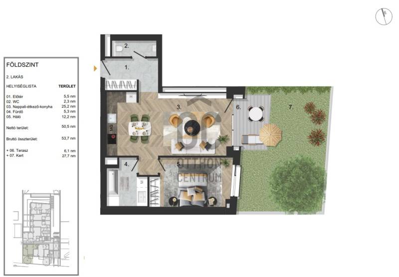XIII. kerület zöldövezeti városnegyedében 33 lakásos társasház- liftes társasház- 2 szobás ingatlan- 53,7 nm alapterületű, 5,9 nm-es terasszal, valamint egy 27,6 nm-es saját kertrész- földszinti, kertkapcsolatos- 2 szobás (amerikai konyhás nappali + 1 háló)- fűtés, hűtés: levegős hőszivattyús rendszert használ, mennyezeti fűtés-hűtés kialakítással- a lakás belső ajtókkal, burkolatokkal, szaniterekkel kerül átadásra- gépkocsi beálló külön vásárolhatóTovábbi információval, megtekintéssel kapcsolatban keressen bizalommal!Projekt bemutatásaXIII. kerület kertvárosi, zöldövezeti negyedének központjában kimagasló műszaki felszereltséggel rendelkező lakások várják új tulajdonosaikat.Az ingatlanok modern kialakítása, látványos homlokzata, valamint a hőszivattyús fűtésrendszerük által biztosított alacsony rezsiköltség ideális választást jelentenek igényes, tudatos vásárlók és ingatlanbefektetők számára.A projekt keretén belül egy 33 lakásos, modern, újépítésű társasház kerül felépítésre.Főbb jellemzők:• a projekt egy 33 lakásos emelt minőségű, társasházi beruházás keretein belül valósul meg• a társasházban 33 személygépkocsi beállóhely található a -1-es pinceszinten• a kiválasztott lakásokhoz tároló helyiségek is vásárolhatók, akár önállóan akár közvetlen autóbeálló kapcsolattal is• a lakások 30-84 m² közötti változó méretűek, elrendezésben a garzontól az egy- két- és három hálószobásig választhatóak• a földszinti lakások mindegyike saját privát kerttel és/vagy nagy alapterületű terasszal rendelkezik•az épület összes lakó egysége saját-kizárólagos használatú erkéllyel, terasszal és/vagy loggiával rendelkezikFizetési ütemezés: 20-80%A lakások várható birtokbaadása: 2025. IV. negyedévJelenlegi készültségi fok: 90% |