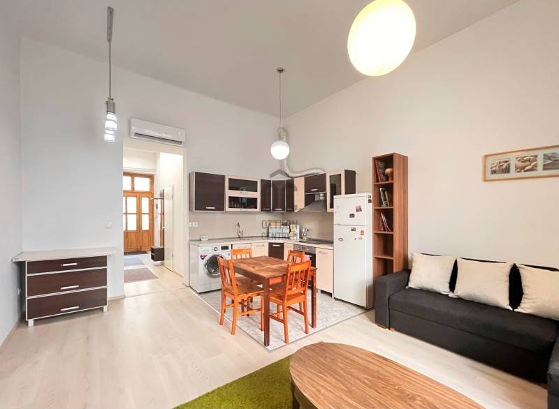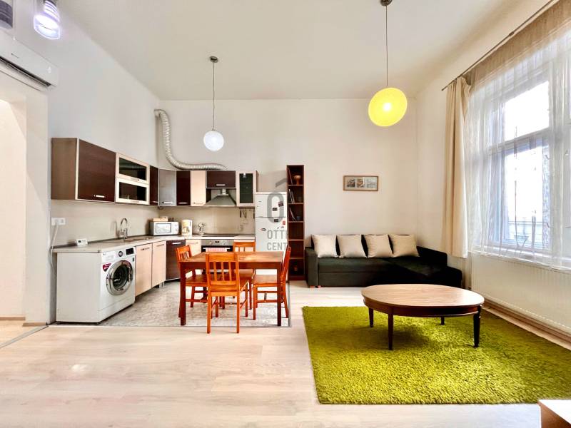 A 60 m²-es lakás elosztása ideális: két hálószoba, egy amerikai konyhás nappali, tágas előtér és fürdőszoba ideális teret nyújt a mindennapi élethez. A nagyobbik hálószoba különlegessége egy 6 m²-es galéria, amely extra élettérként használható, de praktikus tárolóként is tökéletes megoldás.A lakás teljesen bútorozott és gépesített: elektromos tűzhely és sütő, valamint teljesen felszerelt konyha. A téli melegről gáz-cirkó gondoskodik, míg a hűtő-fűtő klíma egész évben extra komfortot nyújt.A társasházról: rendezett, felújított társasház, a felújítás során lifttel lett felszerelve. Azonnal költözhető, így akár rövid időn belül új otthonává válhat.A lokáció kiemelkedő: a belvárosban található, sétatávolságra több főbb közlekedési eszköztől – az M1 és M3 metróvonal, valamint a 4-6-os villamos és számos buszjárat gyorsan elérhető. Emellett bevásárlási lehetőségek is könnyen hozzáférhetők.Amennyiben egy stílusos, azonnal használható, belvárosi lakást keres, ez az ingatlan tökéletes választás. |
