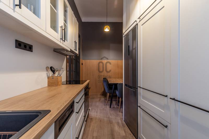 Csend, harmónia, melegség – néha ennyi is elég. Üdv itthon!RÖVID ÖSSZEFOGLALÓA II. kerület egyik legjobb adottságú részén, a Mecset utcában található ez a 63 m²-es, kétszobás, teljeskörűen saját részre tervezett és kivitelezett lakás, egy liftes, rendezett téglaépület harmadik emeletén.A 3,6 méteres belmagasság, a precíz asztalosmunkák, a modern gépészet és új hőszigetelt nyílászárók mind egy átgondolt koncepció részei, amelyben a funkcionalitás és az esztétika tökéletes egyensúlyban van.ELHELYEZKEDÉS– városi nyugalom a Rózsadomb lábánálA Mecset utca a II. kerület egyik legkedveltebb, mégis csendes szeglete.Néhány perc sétára elérhető a Margit körút, a Széll Kálmán tér és a Várnegyed, így a városi élet minden kényelme karnyújtásnyira van.A környék biztonságos, jól ellátott és zöld, a közlekedés kiváló: a 4-6-os villamos, a M2-es metró, valamint több buszjárat is könnyen elérhető.Ideális választás mindazoknak, akik a városi élet központjában, mégis csendes, rendezett utcában keresnek harmonikus otthont.AZ ÉPÜLET – klasszikus karakter, gondos karbantartásA századforduló idején épült, stabil szerkezetű téglaépület a korszakra jellemző díszített homlokzattal és vasrácsos ganggal rendelkezik.A lakás belső udvarra néz, így a forgalom zaja teljesen kiszűrődik – a csend és nyugalom garantált.A ház jó műszaki állapotú és folyamatosan karbantartott.A gázvezetékeket 2008–2009-ben, az elektromos hálózatot 2017-ben újították fel, a függőfolyosók és a kémények már megújultak.A tető egyik fele felújított, a másik oldal 2026-ban kerül sorra.A közös költség 300 Ft/m², amely tartalmazza a közös használatú részek fenntartását, a közös képviselet díját és a felújítási alapot.A LAKÁS – arányos terek, finom részletekA teljesen felújított lakásban minden elem egy tudatos térkompozíció része.A nappali és a háló közötti átmenet finoman oldott, a beépített bútorok egységes ritmust adnak a térnek.A fa felületek melege, a visszafogott szürke-föld tónusok és a rejtett világítás együtt teremtenek kiegyensúlyozott, otthonos atmoszférát.Az ablakos konyha egyedi gyártású bútorral és modern, teljesen gépesített berendezéssel készült.A fürdőszoba praktikus tárolómegoldásokkal, mosógéphellyel és természetes anyaghasználattal rendelkezik.MŰSZAKI TARTALOM- Új, korszerű kazán- Teljes villamos- és gépészeti felújítás- Műanyag, hőszigetelt nyílászárók- Rejtett LED-világítás- Egyedi, beépített bútorzatNem csupán felújított, hanem újratervezett otthon.Lépj kapcsolatba velünk, és nézd meg, hogyan válhat ez a tér a mindennapjaid részévé.----------------------------------------------Díjmentes, bankfüggetlen hiteltanácsadással támogatjuk vevő ügyfeleinket a számukra legelőnyösebb finanszírozási döntések meghozatalában. Opcionálisan igénybe vehető kiegészítő szolgáltatásainkkal – mint ügyvédi közreműködés, energetikai tanúsítvány vagy villamos biztonsági felülvizsgálat – teljes körű szakmai támogatást nyújtunk az adásvétel folyamatának minden egyes lépésénél.----------------------------------------------A hirdetésben szereplő információk tájékoztató jellegűek. A tévedés és az árváltoztatás jogát fenntartjuk. Az esetleges elírásokért és technikai hibákért felelősséget nem vállalunk. |