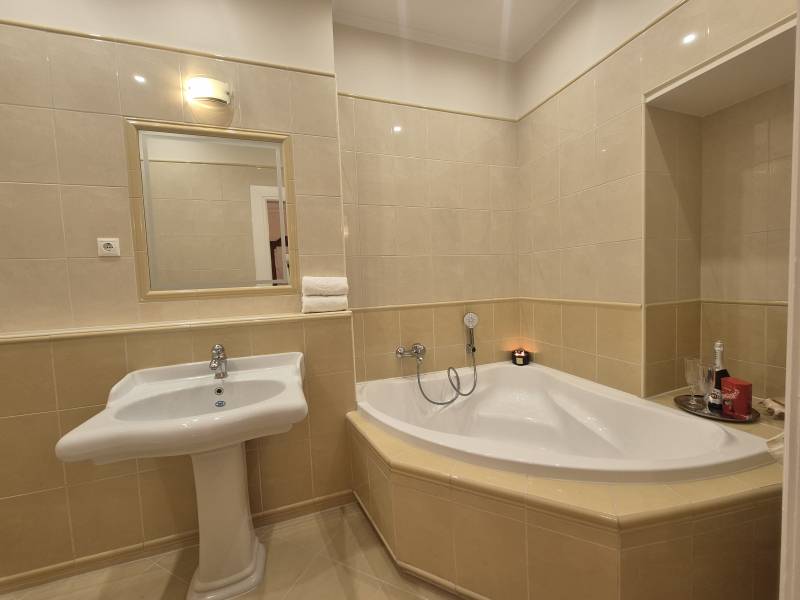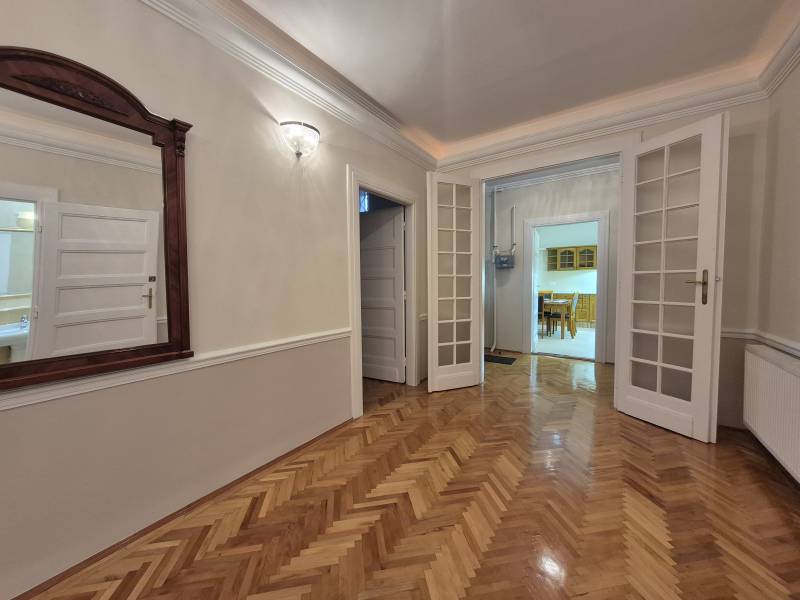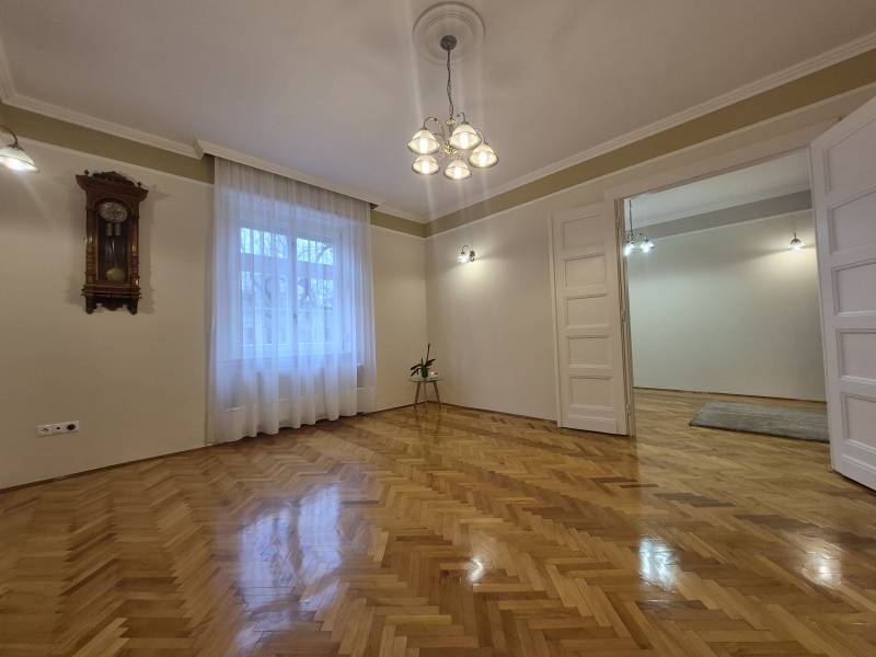Békéscsaba egyik legpatinásabb környékén, a Szent István téren, körfolyosós, liftes, 124nm-es polgári ház első emeletén kiadó egy frissen felújított, tágas, nagy belmagasságú, egész nap napfényben úszó, luxus érzetű nagypolgári lakás.Elrendezés:Körfolyosóról előszobába lépünkSzemben: kabinos fürdő + WCBalra: gépesített, nagy konyha–étkező • beépített mosogatógép • szagelszívó • kamra + háztartási helyiség egybenJobbra: hall, innen nyílik: • 1 udvarra néző szoba • 1 kádas fürdő + WC • nappali, amelyből 2 külön utcafronti szoba nyílik (egyikben nagy, beépített gardrób)Mitől prémium?-Igényesen felújított-Fa parketta, nagy fa nyílászárók-Egész nap természetes fény-Elegáns, világos, letisztult terek-Riasztórendszer előkészítve-Saját pince-számlávalAzonnal költözhető!!!Ideális választás:-rendelőnek / egészségügyi szolgáltatásnakpraxisnak, stúdiónak vagy akár cégközpontnak-magánorvosi rendelőnek-prémium irodának-vagy családi otthonnakKöltözzön a város egyik legszebb terére a Szent István térre – innen gyalogosan is minden elérhető: üzletek, szolgáltatások, iskola, bank, buszmegálló. |