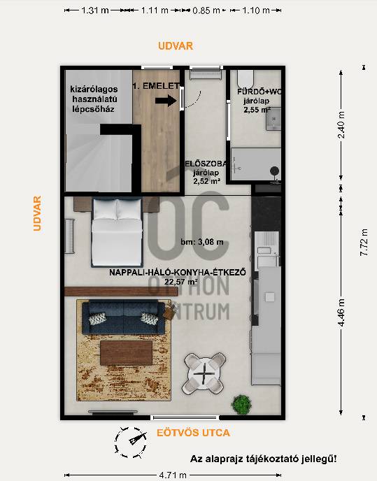 Különleges, karakteres lakás a XV. kerület szívébenEz az 1. emeleti, 27 m²-es, teljesen felújított belső térrel rendelkező otthon egyedülálló hangulatot kínál saját, kijelölt előkerttel, két tárolóval és 1 nyitott gépkocsibeállóval.Az alaprajzon bemutatott berendezési javaslat segít elképzelni, hogyan lehetne a nappali–konyha–étkező–háló funkciókat egyetlen térben 22 m²-en kényelmesen kialakítani. Jelenleg a helyiségben csak a gépesített konyhabútor található.Főbb jellemzők:• 6 lakásos társasházban található• egyedi, ritka építészeti részletek jellemzik a házat, köztük a kézzel faragott fa tetődíszek• a lakás egy kizárólagos használatú zárt lépcsőházon keresztül közelíthető meg• bár az alapterület 27 m², a 3 méteres belmagasságnak köszönhetően a tér rendkívül tágas és levegős érzetet kelt• utcai nézetű nappali, DK tájolás révén rendkívül világosBelső tér és felújítás• Teljeskörűen felújított belső terek• Felújított közművek (víz, villany, gáz) - a régi konvektorok nem lettek lecserélve• Modern, gépesített konyhabútor (sütő, tűzhely, fali páraelszívó, döntött üveges kialakítással, hűtőszekrény, mosogatógép)• Új Ariston bojler• Tolóajtós fürdőszoba a helytakarékos kialakításért Extrák – ritka lehetőség:• 2 db saját tároló• 1 db udvari nyitott gépkocsibeálló• Kizárólagos használatú lépcsőház• 11,76 m² saját kijelölt előkert a lépcsőház bejárata előtt –bár még nincs kialakítva, de ideális hely egy hangulatos pihenőhelyhez vagy mini kerthezA társasház lakóközösségét kifejezetten nyugodt, barátságos, régóta itt élő emberek alkotják.Környék:• Kiváló infrastruktúra• Gyors belvárosi elérés• Központi elhelyezkedés, jó közlekedés, iskolák, óvodák, boltok, szolgáltatásokHa bármilyen kérdése felmerül, kérem, keressen bizalommal. Amennyiben szeretné személyesen is megtekinteni az ingatlant, hívjon fel és örömmel megmutatom.Különleges, karakteres lakás a XV. kerület szívében! |