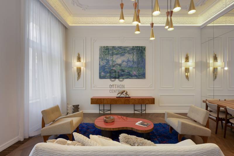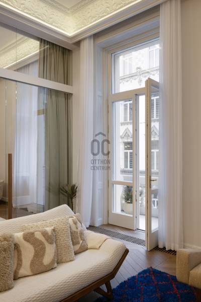 Felújított házban, kortárs polgári lakás. Üdv itthon! RÖVID ÖSSZEFOGLALÓBudapest V. kerületében, a Kálmán Imre utcában helyezkedik el ez az 1. emeleti, 80 négyzetméteres, felújított lakás. Három szoba, két fürdőszoba, erkély és déli tájolású, világos terek jellemzik, miközben a korszerű padlófűtés és a közös pincerész-használat a mindennapi komfortot szolgálja. Az ingatlan egy klasszikus nagypolgári épületben található.LOKÁCIÓ – INFRASTRUKTÚRA ÉS VÁROSI KULTÚRALipótváros ezen része azok közé a városi környezetek közé tartozik, ahol az infrastruktúra és a kulturális jelenlét természetes egységet alkot. Historikus bérházak, rendezett utcák és kiszámítható városi működés határozza meg a környezet karakterét.A városi tér szerves eleme a Kossuth Lajos tér és a Parlament, a Szabadság tér zöldfelületeivel és éttermeivel, valamint a Duna-part rakparti sétánya. A kulturális tengely szintén ide kapcsolódik: a Vígszínház, a Budapesti Operettszínház, a Thália Színház, illetve a Nagymező utca színházi világa a környék mindennapjainak része. Kávézók, üzletek és találkozópontok veszik körül a Szent István Bazilikát, miközben a közeli koncert- és zenei helyszínek tovább erősítik a városrész értelmiségi, művészeti hangulatát.Közlekedési szempontból a környék kiemelkedően jól szervezett: elérhető az M2-es és M3-as metró, a 4–6-os villamos, valamint több buszjárat, amelyek gyors kapcsolatot biztosítanak Pest és Buda irányába.Hosszú távon ez a városrész azért működik jól, mert nemcsak kiszolgál, hanem tartalmat is ad. Élhető, értelmezhető és stabil értéket képvisel, akár saját használatra, akár befektetési céllal.AZ ÉPÜLETKálmán Imre, az utca névadója a 20. század egyik legismertebb magyar zeneszerzője, az operett nemzetközi rangú alakja. Már a századfordulótól kezdve olyan közeg formálódott itt, amely értelmiségi, művészeti és közéleti szereplőknek adott otthont. Ez a háttér nem látványos, hanem rétegzett érték. Történettel, identitással és stabil presztízzsel bíró városi környezet, amely hosszú távon is működőképessé teszi az itt álló épületeket.A homlokzat a századfordulós lipótvárosi bérházépítés jellegzetes példája. A tagolt ablakrend, a hangsúlyos párkányok, az íves nyílászáró-lezárások és a kőkonzolokra ültetett erkélyek világos szerkesztési rendet követnek, miközben gazdag részletképzéssel dolgoznak. A díszítések nem dekoratív túlzások, hanem a korszak városi arányérzékét tükrözik: az épület egyszerre elegáns és fegyelmezett. Ez az a típusú homlokzat, amely nem trendekhez kötődik, hanem egy jól működő városi korszak építészeti gondolkodását őrzi.LAKÁSÁtgondolt alaprajz és természetes térkapcsolatok határozzák meg a lakás működését. A háromszobás elrendezés világosan elkülöníti a közösségi és a privát funkciókat, mégis egységes rendszert alkot.A nappali a lakás súlypontja, amelyhez szervesen kapcsolódik az étkező és a konyha. Jó arányú tér, nagy nyílászárókkal és déli tájolással, amely kiegyensúlyozott fényviszonyokat biztosít. A nappalihoz közvetlenül kapcsolódó erkély valódi kiegészítő térként jelenik meg. Pontosan azt tudja ez a tér, amit egy jól megkomponált nagypolgári nappalinak tudnia kell: érzelmileg hat, miközben megőrzi fegyelmezett karakterét. Magas belmagasság és finoman restaurált stukkódíszes mennyezet jelöli ki a tér rangját. A rejtett peremvilágítás keretezi a mennyezetet, míg a meleg tónusú függesztékek ritmust és hangsúlyt adnak a térnek. Klasszikus fali tagolás teremti meg azt a nyugodt hátteret, amelyben a bútorok és műtárgyak érvényesülni tudnak. A központi festmény fókuszt ad, majd visszavezeti a tekintetet a tér egészére.Parkettarajzolat földeli a teret, miközben a textíliák és a szőnyeg lakhatóvá teszik ezt az eleganciát. Nem reprezentációs díszlet, hanem valóban használható nappali: beszélgetésre, jelenlétre, lassulásra.Az összhatás ereje az egyensúlyban rejlik.Semmi nem akar több lenni annál, ami – és ettől válik igazán erőssé.Két, méretében és funkciójában is jól elkülönülő hálószoba teszi alkalmassá az ingatlant családi használatra vagy reprezentatív városi otthonként. Hangulatuk visszafogott és megnyugtató, a nagypolgári arányok modern értelmezésével. Mindkét háló saját fürdőszobai kapcsolattal rendelkezik, ami intim, jól szervezett működést biztosít, akár mindennapi használatra, akár vendégek fogadására.Az íves részletek, a puha textíliák és a finom világítás kiegyensúlyozott, csendes tereket hoznak létre, ahol a fókusz egyértelműen a pihenésen és a komforton marad.A két fürdőszoba anyaghasználatában és hangulatában is egységes, mégis eltérő karaktert képvisel: egyik kádas, világosabb tónusú, a másik zuhanyzós, mélyebb, elegáns felületekkel. A természetes kőhatású burkolatok, az egyedi asztalos bútorok és a finom világítás nyugodt, időtálló atmoszférát teremtenek a mindennapokhoz. Praktikus elhelyezkedésükkel kényelmes, torlódásmentes működést biztosítanak.Teljes körű felújítás során a hangsúly a korszerű műszaki megoldásokon és az időtálló belső kialakításon volt. A padlófűtés egyenletes hőérzetet ad, miközben vizuálisan is szabadon hagyja a falakat és tereket.Közös pincerész használata egészíti ki a lakást, amely praktikus tárolási lehetőséget jelent a belvárosi elhelyezkedés mellett.Ez az otthon kiegyensúlyozott, jól használható terekre épít, amelyek hosszú távon is élhetők maradnak – akár saját lakhatásra, akár minőségi befektetésként, bérbeadás céljából.Ha olyan belvárosi lakást k