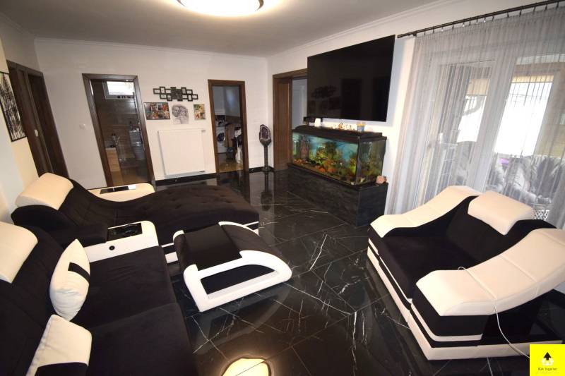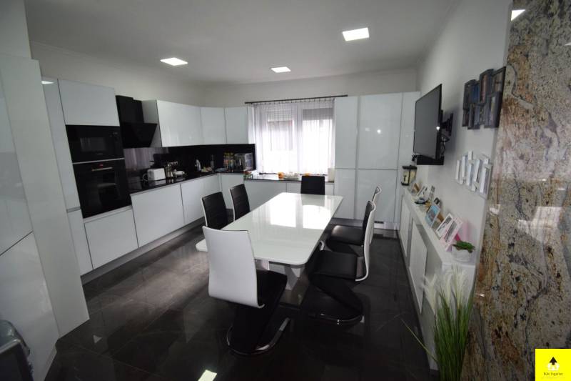 Bükön csendes, nyugodt környezetben eladóvá vált egy minden igényt kielégítő két generációs családi ház.Az ingatlan egy szinten 354 m2. Az épület 2/3 része 2020-ban épült és a többi rész teljeskörű felújításon esett át.A tulajdonos az építés során elsődleges szempontnak tekintette a mai kor igényeinek megfelelő, minőségi anyagok felhasználását és szakszerű kivitelezést. Az épület két külön bejáratú lakrésszel (2 nappali + 2 konyha) rendelkezik, melyből az egyikben akadálymentes terek kerültek kialakításra. Az épület energia felhasználásának minimalizálását a prémium kategóriás nyílászárók, a korszerű homlokzatszigetelés és a 45 cm-es padlásszigetelés, valamint a takarékos kondenzációs kazán garantálja. Az egész ház fűtése a leghidegebb téli hónapban is csak 22 ezer forint volt.A belső terek kialakítását az átgondoltság, a praktikum, az élhetőség és az egyedi megoldások jellemzik.A berendezés a kényelem és stílus ötvözete. A házban az egyedi gyártású borovi fenyő beltéri ajtók, modern prémium minőségű szintén egyedileg gyártatott üveg konyhabútor, ami kimagasló minőségű gépekkel beépített, a lézervágott kerámia burkolatok, a különleges megvilágítások, a 3 fürdőszoba egyedi megoldásai és még számos extra mind-mind az ott élők kényelmét hivatott ellátni.A lakótereken kívül az épületben kialakításra került egy 3 állásos garázs, ahol automatizált garázsajtók biztosítják a kényelmes parkolást és a lakóterek is megközelíthetők a garázsból.Valamint kialakításra került 15-20 fő befogadására alkalmas helyiség, ami a családi, baráti összejövetelek színtere, de működhet konditeremként, irodaként is. Az épület 1681 m2-es telken helyezkedik el. Az udvar egy része térkővel burkolt és a többi terület füvesített. Található még egy hangulatos kis kerti tó az udvaron, egy fedett kiülő kemencével, egy kút és kerti szerszám tároló.Az ingatlan teljes berendezéssel eladó. A ház két külön bejárattal rendelkező lakótérrel rendelkezik, így generációk zavartalan együttélését tudja biztosítani. Esetleg balatoni ingatlan beszámítása lehetséges. |