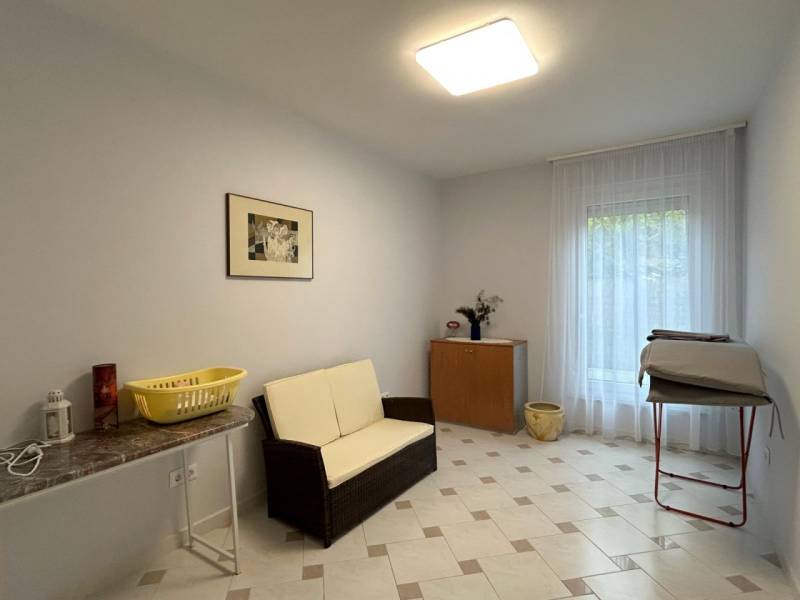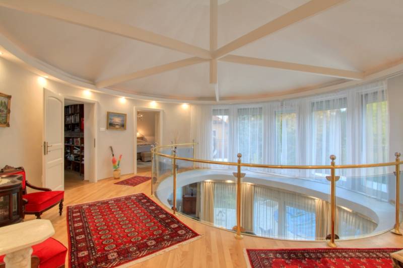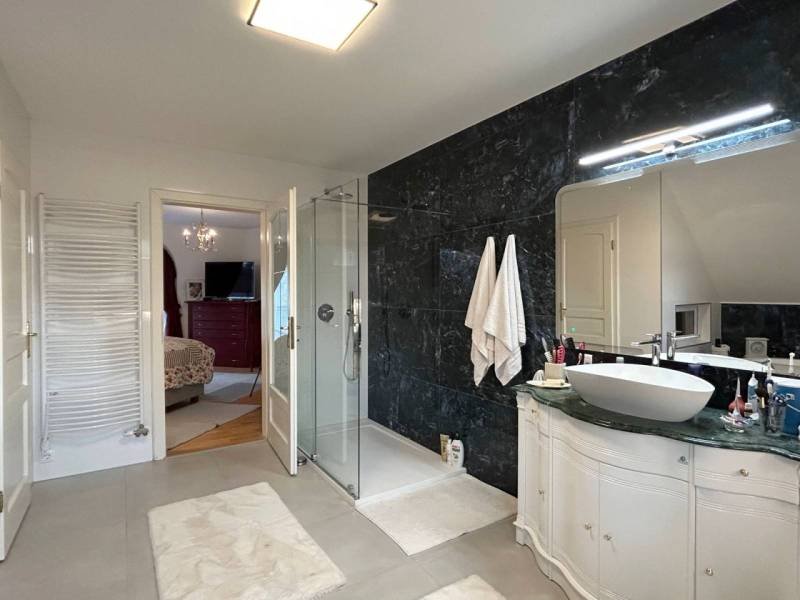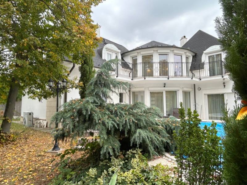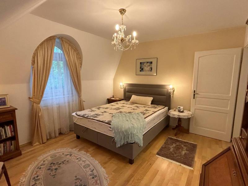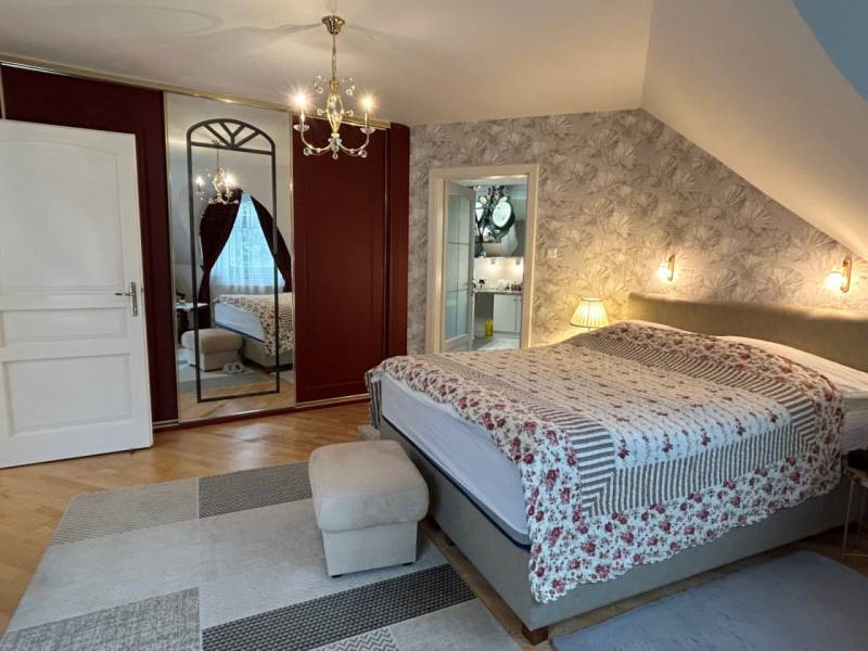 4882. Törökbálint legszebb kertvárosi övezetében a Tükörhegyen, kétlakásos, impozáns enteriőrrel rendelkező, galériás, kiváló állapotú, 7 szobás, riasztóval szerelt, délnyugati fekvésű családi ház garázzsal, hőszivattyús fűtött medencével, parkosított 871 m2-es telken eladó.A kétszintes lakóépület 1999-ben épült Porotherm falazó-, és födémszerkezettel, szigetelt homlokzattal és padlás szigeteléssel, Canadai zsindelyfedéssel. A fűtést és a melegvíz ellátást Ariston gázkazán biztosítja hőtároló kiegészítésével, a hőleadás a földszinten padlón keresztül, a tetőtéri szinten radiátorokkal történik.2020-2025 közötti felújítások:- teljes nyílászáró csere (háromrétegű üvegezéssel, elektromos redőnyökkel)- fújt padlás szigetelés- új utcafronti kerítés- 2 db új kovácsoltvas úszókapu távirányítós vezérléssel- felújított medenceburkolat és hőszivattyús fűtés- bővített áramhálózat (3×32A) és új világítótestek- megújult belső, új fürdőszobák- felújított, szigetelt teraszok- hőszigetelt garázskapu- új bádogozás- központi porszívóAlapterület:Földszint 94 m2 + 46 m2 külön bejáratú lakásTetőtér: 74 m2 nettó, 115 m2 bruttóGarázs: 23 m2Erkély: 3,5 m2Bejárati terasz: 35 m2Kert felőli terasz: 55 m2Helyiségek:A földszinti lakótérbe lépve az előszobából nyílik a ház tágas és világos központi társalgó vagy étkező helyisége, kilátással a kertre, teraszra és medence térre. Bal oldalon található a hangulatos kandallóval rendelkező, 50 m2-es nappali és 7 m2-es konyha egy légtérben. Jobb oldali irányban találjuk az emeletre vezető lépcsőt, mosókonyhát, illetve egy ajtón keresztül átjuthatunk a külön bejárattal is rendelkező lakásba. Az előszobából nyílik egy vendég WC, a konyhához 2,4 m2-es kamra helyiség kapcsolódik.Az emeleti szinten a kör alakú galéria térből juthatunk egy 15 m2-es gardrób szobán keresztül 2 db hálószoba felé (ahol az egyik hálószobához erkély kapcsolat és zuhanyzós fürdőszoba tartozik), illetve a fő hálószoba és dolgozószoba irányába. A fő hálószobából tágas, walk-in zuhanyzóval, pezsgőfürdős káddal rendelkező fürdőszoba nyílik.A 46 m2-es külön bejáratú lakás amerikai konyhás nappali, hálószoba + zuhanyzós fürdőszoba, illetve tároló helyiségekből áll. Nagyszülő, felnőtt korú gyermek, vagy vállalkozás részére is ideális teret biztosít.Parkolás a fűtött 23 m2-es garázsban, a telken kialakított parkolóhelyen és a ház előtt is lehetséges.A gondosan megtervezett, ápolt kertet szép növényzet díszíti, a kerti szerszámok tárolására egy kis faház biztosít helyet. |