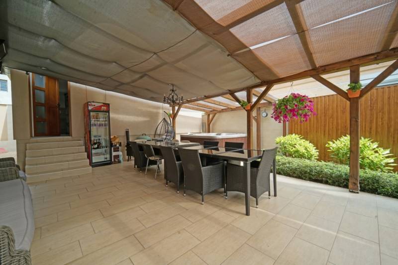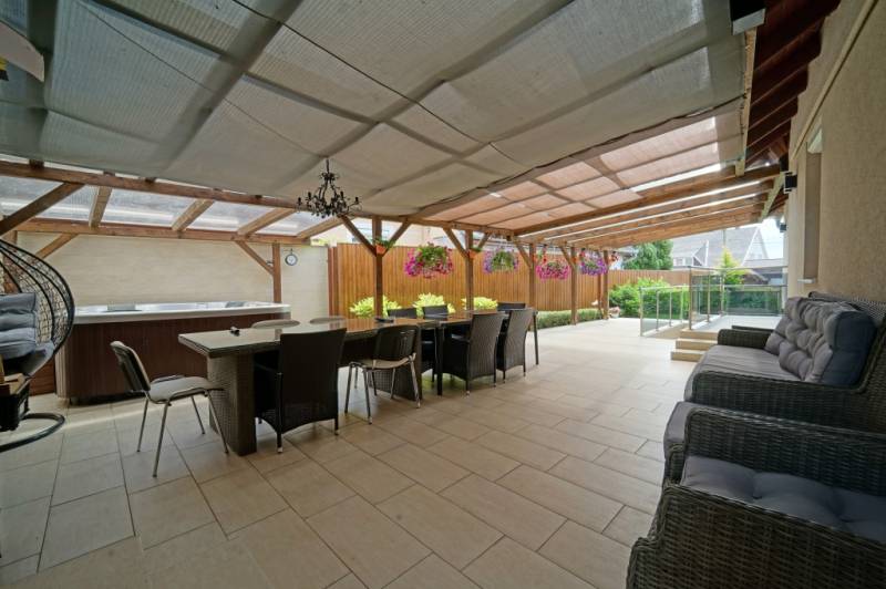 Gödöllőn 548 m2-es telken a Szilágyi Erzsébet utca és a Hunyadi János utca között, két utcafronttal, nettó 168,72m2-es + 34,3m2-es kétautós garázzsal, 13,5m2-es pincével és 70 m2-es fedett terasszal rendelkező családi ház eladó!A 2004-ben épült és folyamatosan modernizált ingatlanban a Hunyadi János utca felőli utcafronti bejárattal egy 35 m2-es üzlethelyiség található. A homlokzati falak 30-as és 38-as tégla falazattal épültek, melyeket 10cm-es EPS dryvit szigeteléssel láttak el. A külső nyílászárók műanyag thermó üvegekkel szereltek. A tetőt zsindely fedi.A fűtésről kombi gázkazán gondoskodik.A parkosított kertet öntözőrendszer locsolja helyettünk. A megközelítőleg 70m2-es fedett terasz kiválló helyszíne a családi összejöveteleknek és a pihenésnek. Az itt található jacuzzi is a vételár részét képezi. Parkolni a Sziláégyi Erzsébet utcáról elektromos garázsajtón megközelíthető 2 autó tárolására kialakított garázsban tudunk.A villamos áram terhelhetőseége 1x32A.Az üzlethelyiség gipszakrtonnal lett elválasztva, hogy akár 2 üzletet is üzemeltethessünk. A könnyedén elbontható válaszfallal 35m2-es helyiséget tudunk kialakítani.Tárolásra a nappali alatt kialakított 13,5m2-es pince kiváló lehetőséget ad.Készpénzes vevők jelentkezését várjuk.Amennyiben hirdetésem felkeltette az érdeklődését vagy egyéb információra van szüksége hívjon bizalommal! |