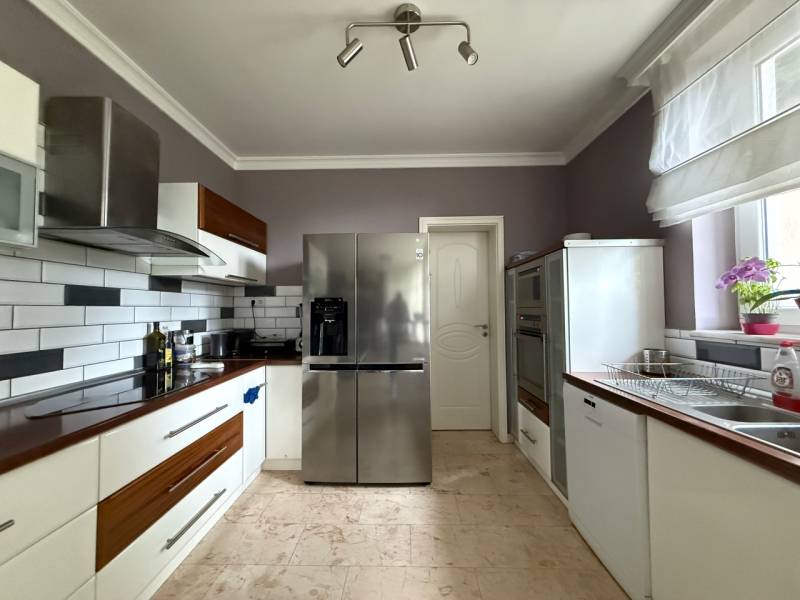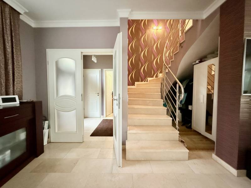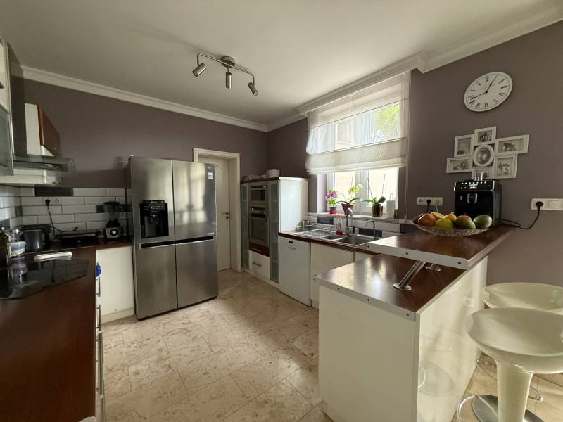 Panorámás villa többgenerációs kialakítással Szentendre domboldalánSzentendre egyik legnyugodtabb, domboldali részén, a Bokros utcában található ez a különleges kialakítású, kúria jellegű villa, amely közel 500 m² hasznos alapterülettel és egy 1500 m²-es, panorámás telekkel rendelkezik. Az ingatlan legnagyobb értéke a rugalmassága: minden szint önálló lakóegységként működik, így a ház egyszerre alkalmas nagycsaládos, többgenerációs használatra vagy akár befektetési célú hasznosításra is.A földszinten két külön lakás kapott helyet. Az egyik – nagyobb alapterületű – lakrész ideális fő lakóegységként: nappali, hálószobák, konyha, fürdő és közvetlen teraszkapcsolat teszi kényelmessé a mindennapokat. A másik földszinti lakás jól szeparált, önálló élettérként működik, vendégeknek, családtagoknak vagy akár irodai, apartman jellegű használatra is.Az emeleti szint egy külön világ: tágas terek, több szoba és egy nagyméretű terasz, ahonnan lenyűgöző panoráma nyílik Szentendrére és a környező dombokra. Ez a lakás akár teljesen önállóan is használható, hosszabb távú bérbeadásra is alkalmas.Az alsó szint nem klasszikus alagsor: egy közel 60 m²-es garázs, több tárolóhelyiség és a teljes gépészet kapott itt helyet, praktikus és jól használható kialakítással.A telek gondozott, a környezet csendes és privát, mégis néhány perc alatt elérhető a szentendrei belváros. Az aszfaltos megközelítés egész évben problémamentes.Ez az ingatlan nem egyetlen élethelyzetre készült. Olyan ház, amely együtt tud nőni a családdal, alkalmazkodik az igényekhez, és hosszú távon is értéket képvisel.Irányár: 299 millió forint |