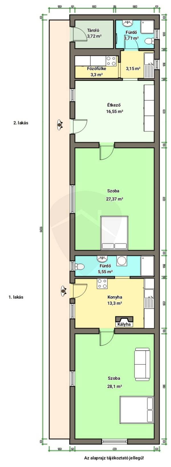 *** 1 db családi ház vételáráért cserébe 2 db LAKÁST KAP! ***Lakjon az egyik 54 m2-es lakrészen és adja ki a másik lakrészt, amely 47 m2-es, ezáltal akár a lakás fenntartása/törlesztője ingyen lehet.Tura központi részén eladó egy felújításra váró régi típusú vályogból épült parasztház. Nagy előnye, hogy jelenleg 2 külön lakrészből áll, összesen nettó 101 m2 + 20-30 m2 tároló és pince tartozik hozzá. A telek mérete 921 m2. Víz, villany és a gáz be van vezetve, viszont a csatorna csak az utcában található. Az elmúlt években a 2 fürdőszoba teljes felújításra került, illetve új 3x16 Amper lett bevezetve szabványosított szekrénybe. A két külön bejáratú lakás részben külön mérőórákkal rendelkeznek. A központi elhelyezkedésnek köszönhetően minden a közelben megtalálható. M3-as autópálya 8-10 percen belül elérhető. Budapest 40-50 percen belül, akár tömegközlekedéssel is.Ha saját célra szeretne ingatlant vásárolni és fontos, hogy két külön lakrész legyen, akkor ezt a lehetőséget ne hagyja ki. Akár befektetésre is alkalmas. További információért hívjon bizalommal! |