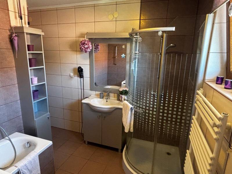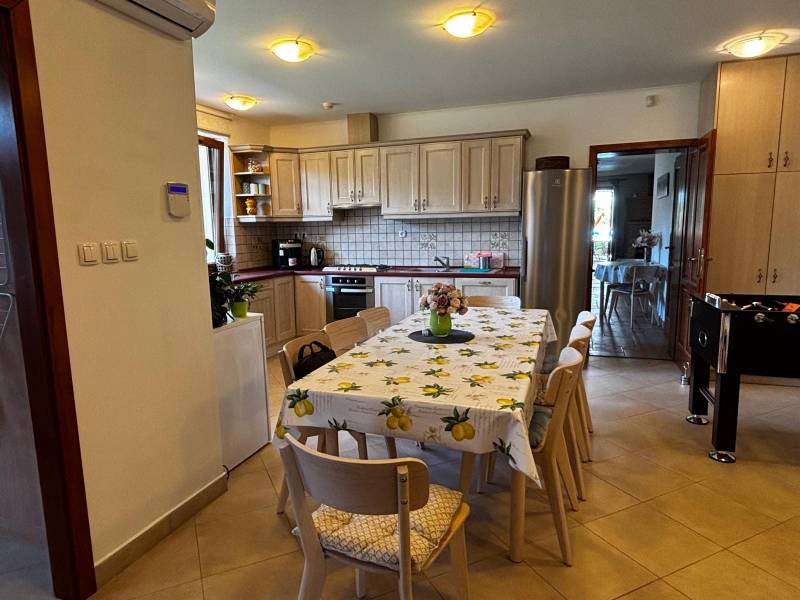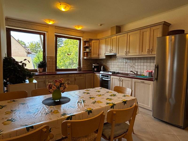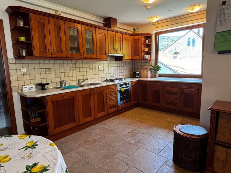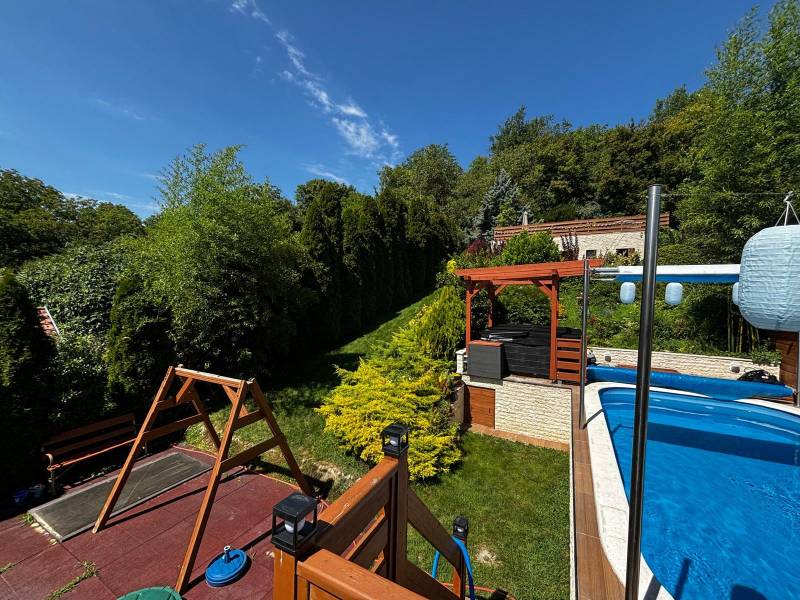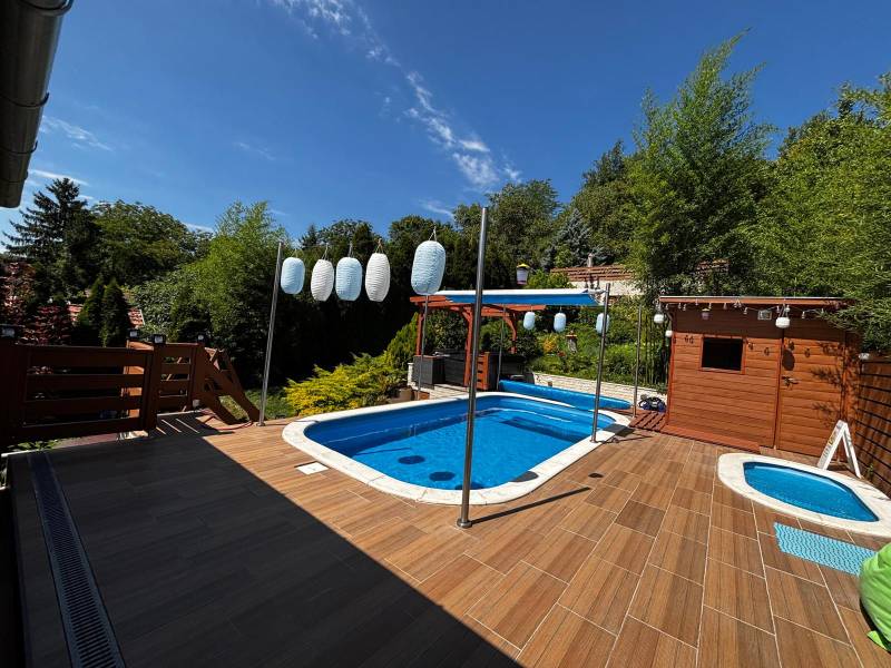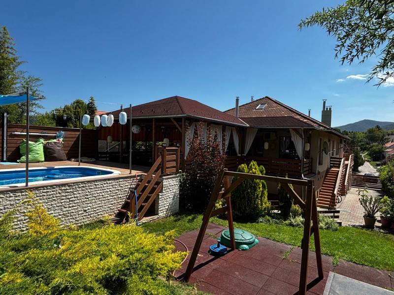 Luxus családi ház a dunakanyarban, akár 2 generációnak is, rövidtávú bérbeadás esetén 7 éves megtérüléssel, hatósági engedéllyekkel, (KTSZ, NTAK, ÁNTSZ, NÉBIH) további fejlesztési lehetőségekkel komoly vállalkozással, pályázatra alkalmas 16 éves céggel, akár 3% 100 milliós hitelfelvételi lehetőséggel, magas foglaltsággal eladó!Itt található a régió legmagasabb felszereltségű wellness terasza és egyediként kínál, nagyméretű engedélyezett gépészettel rendelkező fűthető, nyitott úszómedencét.Pilismaróton minden kényelemmel felszerelt, minőségi anyagokból 2015-ben épült, két szintes, nettó lhasznos 420 m² összbeépített ház, medencével, jakuzzival, szaunával. A két vendég lakás egy szinten található, mely külön bejárattal rendelkezik, de egybe is nyitható.Az alsó szint 200 m², több helyiséggel (volt sütődei tevékenységgel) jelenleg üres állapotban, 2 fürdő, 2 wc, 2 konyha felszereltséggel.A több célú hasznosíthatóságra minden lehetőség adott!Kiválóan alkalmas a vállalkozás továbbfejlesztésére, turisztikai céllal a vendégház bővítésére, szabadidős tevékenység, wellness, vagy újabb lakóegység kialakítására! Teljesen külön bekötött ipari közművekkel műhely és/vagy ipari tevékenység folytatására.Műszaki tartalom:-Teljesen külön bekötött ipari közművekkel műhely és/vagy ipari tevékenység folytatására.-Víz, csatorna, villany: 3x35 A, gáz: ipari 26 m³ és háztartási 6 m³ órával.- 18,5 kW teljesítményű napelem került felszerelésre, mely a teljes villanyfogyasztást fedezi, a szaunával, jakuzzival, medencével együtt is!-A helyiségek klimatizáltak, radiátoros-, és padlófűtéssel (gáz cirkó), szunyoghálóval, riasztóval ellátottak. Az egyik nappaliban hangulatos téglahályha is melegít. Az egész ház kívülről szigetelve, a padlástér szintén szigetelt, hasznos 80 m² beépíthetőséggel.-Távirányítós tolókapu.-Zárt, fedett villany-, gázfogadó és kukatároló.-Az egész ház rögzítős kamera rendszerrel ellátott. Riasztó rendszere őrző-védő céghez bekötve.-Internet ( wifi az egész házban), műholdas televízió.-Térburkolat: 52,5 m² 5-6 gépkocsi részére beálló kialakítva-A házból nyílik a 70 m²-es, fedett terasz, gyönyörű fagerendás tetővel és a 60 m²-es wellness terasz: 18 m³-es fűthető medencével, 6 személyes jakuzzival és a szauna csobbanó medencével.-A terasz alatt 2 helyiséges, polcrendszerrel beépített, klímával felszerelt, vizes blokkal is rendelkező pince-tároló.-A nagyméretű, karbantartott mediterrán kertben kiépített locsolórendszer, gyerekjátszó, valamint 2 helyiségből álló műhely és tároló épült. Ennek füvesített tetején egy tűzrakó hely, a pilisi hegyek látványával.-A telek legmagasabb pontján dunakanyari panorámával 4 m-es épített kilátó áll. |