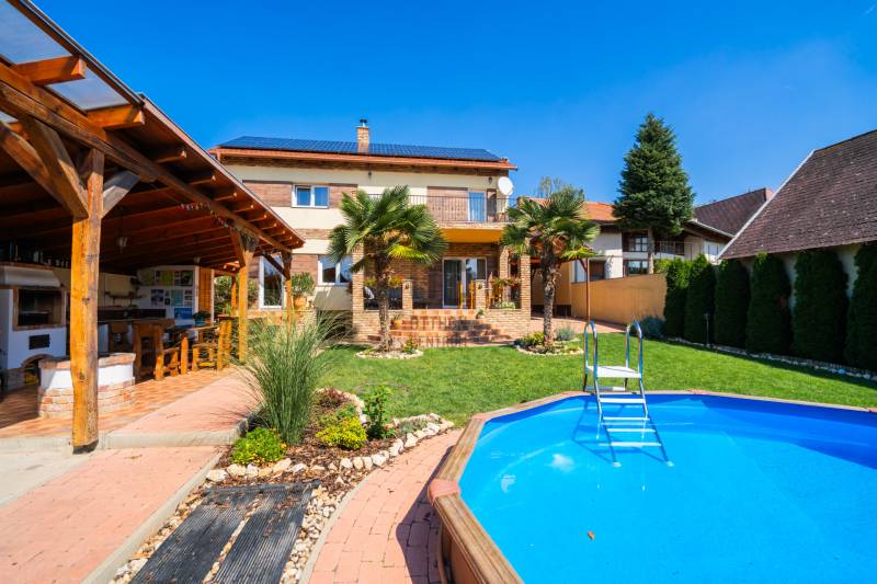 Ha a Balaton közelsége a vágyad, de szeretnél nyugodt, családias környezetben élni, megtaláltad az ideális otthont!Ez a mindössze 7 éves, különleges hangulatú ház egyszerre kínálja a nyári nyüzsgés és a vidéki nyugalom tökéletes egyensúlyát. Az ingatlan főbb jellemzői:Telek: 780 m², gondosan parkosított kert dísznövényekkel, gyümölcsfákkal és két impozáns pálmávalHáz: 177 m² + 40 m² terasz + 30 m² pinceHatalmas, galériás nappali: 50 m², konyhával és étkezővel együtt kb. 80 m²Nagyméretű, gardróbos hálószobák2 fürdőszoba és 3 WC3 autónak fedett beálló + 4 autó számára saját parkoló Extrák, amik egyedivé teszik:- 30 m² fedett grillterasz konyhával, kemencével, bográcsozóval és külön WC-vel- 5 méter átmérőjű, 1 méter mély medence teljes gépészettel- Fatüzelésű szauna és dézsa – minden nap wellness hangulatban- Öntözőrendszer, kerti világítás- 8 kW-os napelemrendszer (évi ~6 MWh túltermelés, még 8 évig szaldós elszámolással)- Kamerarendszer és távfelügyeleti riasztó Elhelyezkedés:A Balaton aranypartja autóval 3 percFő tér, városközpont: mindössze 4 kmCsendes, zöld kertváros, parkokkal, játszótérrelEz a ház nem csupán egy ingatlan – hanem életstílus.Tágas terek, mediterrán hangulat, wellness élmény és a Balaton közelsége – minden adott ahhoz, hogy álmaid otthonává váljon. Ne hagyd ki ezt a ritka lehetőséget! Hívj most, és nézd meg személyesen ezt az egyedülálló házat!Balaton közelében, #családias,# mediterrán kert,# medence,# grill terasz,# szauna,# napelem, #családi ház# |