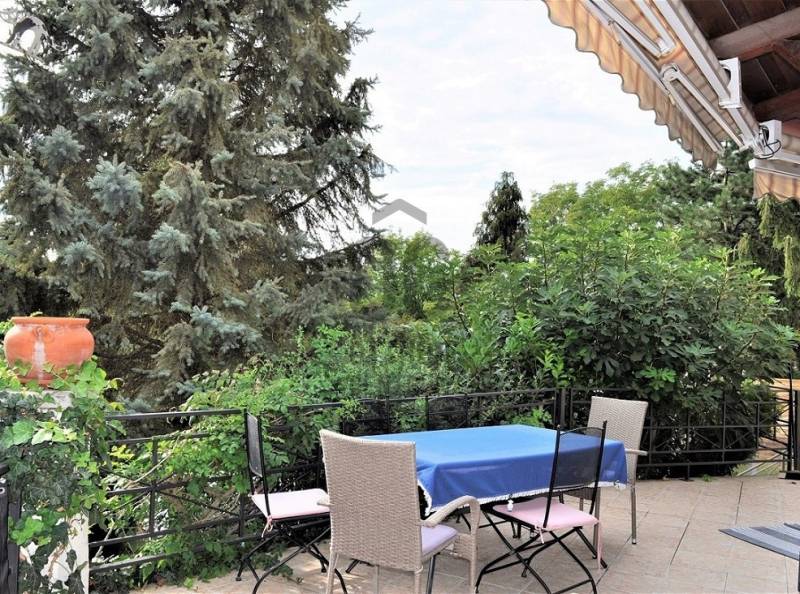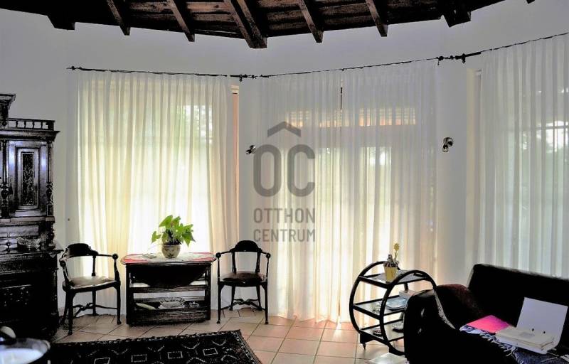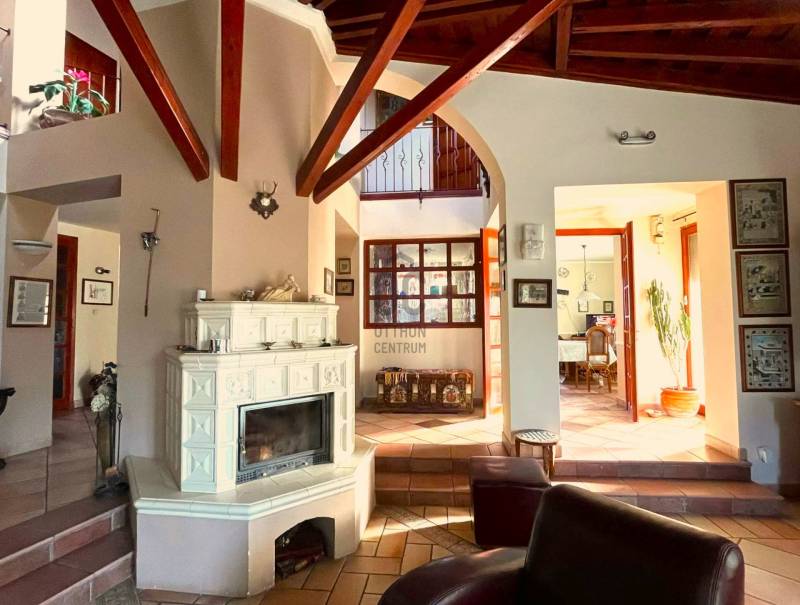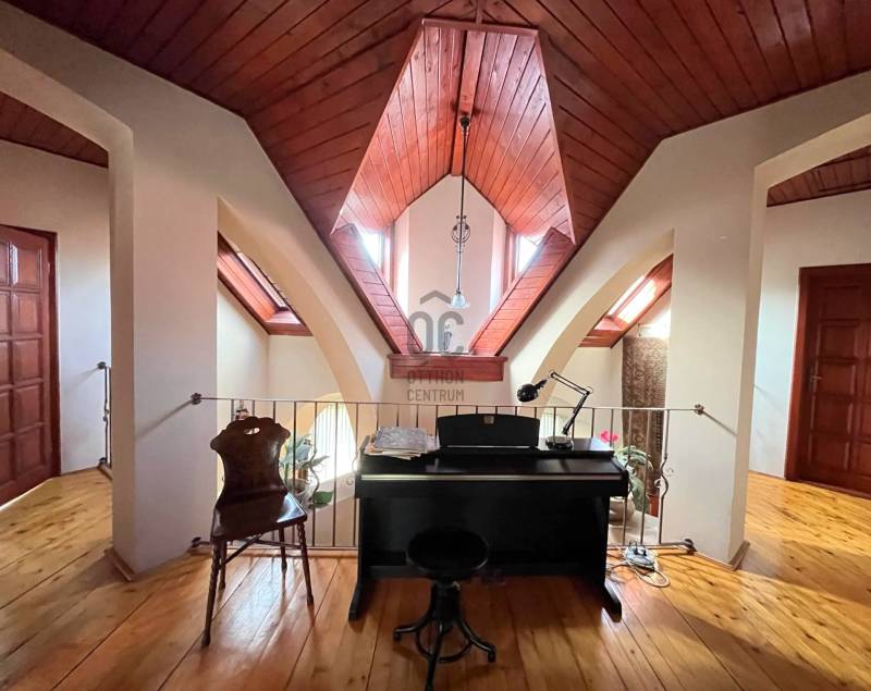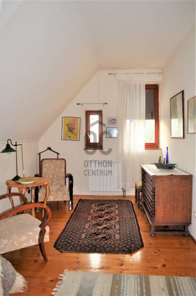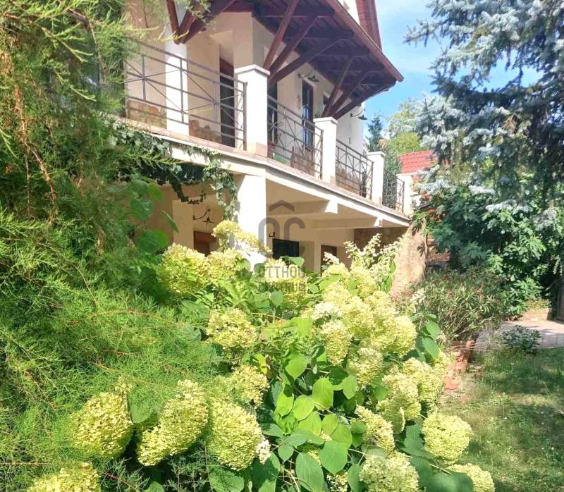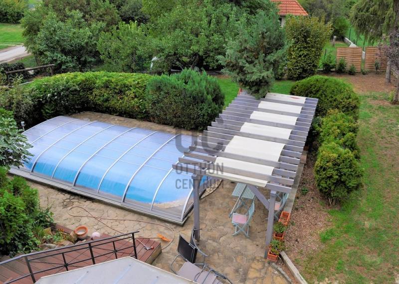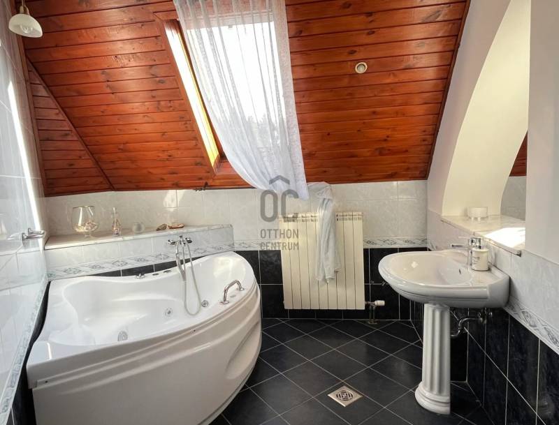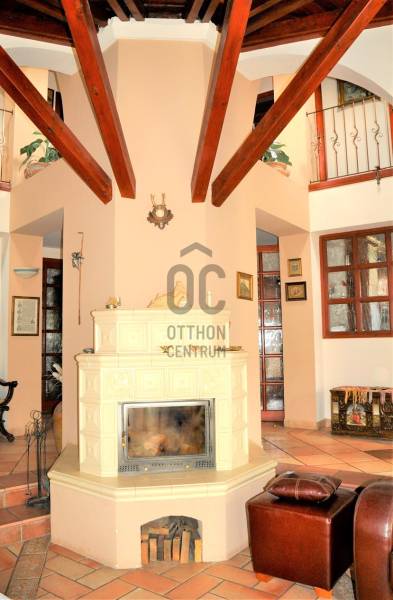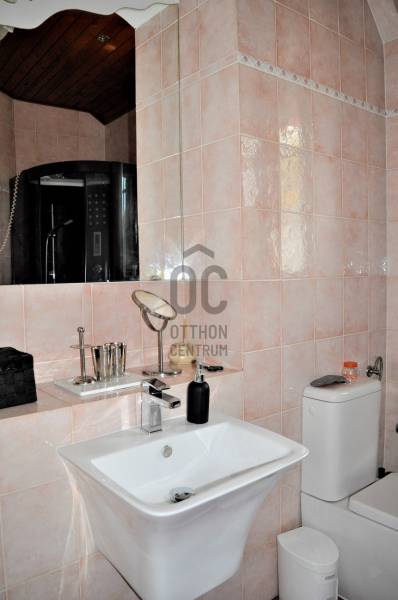 Eladó Telkiben, csendes mellékutcában, DNy-i fekvésű, nettó 300 nm (csak lakóterület) bruttó 410 nm (garázzsal, terasszal, plusz egyéb) kitűnő állapotú, luxus családi ház. Az egyedi belső tér elosztású ingatlan jellemzői az igényes kivitelezés, kiváló; - minőségi anyagok, tágas világos terek. A földszinten nappali, étkező-konyha, nagyméretű szoba, fürdőszoba, WC-kézmosó, kamra, közlekedő, előszoba és hatalmas terasz található. A nappaliban kandalló, a konyha közelében kéménybe kötött grillező lett kialakítva. a Tetőtérben közlekedő, kettő hálószoba, kettő fürdőszoba, galéria és loggia van. A szuterén szinten szobákat, gardróbot, háztartási helyiséget, fitnesz helyiséget (szaunával, zuhannyal), WC-kézmosót, tárolót, egyéb helyiséget, közlekedőt, fürdőszobát (zuhany és pezsgőfürdő), és fedett teraszt találunk. A kertben medence van gépészettel kialakított, fűthető. Extraként említésre méltó a ház teljes szigetelése, automatizálás, redőny, szúnyogháló, naproló, nappaliban kandalló, különleges burkolatok és szaniterek, egyedi bútorok és konyhai gépek, Viessmann kazán, hőszivattyú, riasztórendszer, biztonsági rendszerek és elemek, kaputelefon. A gondozott, parkosított kertben válogatott örökzöldek, lombhullatók, cserjék, virágok, sziklakert található. A kertben még kialakításra került egy méretes terasz pergolával (árnyékolóval). A garázs előtt nyitott, térkövezett beálló van, kettő autó parkolására alkalmas. |