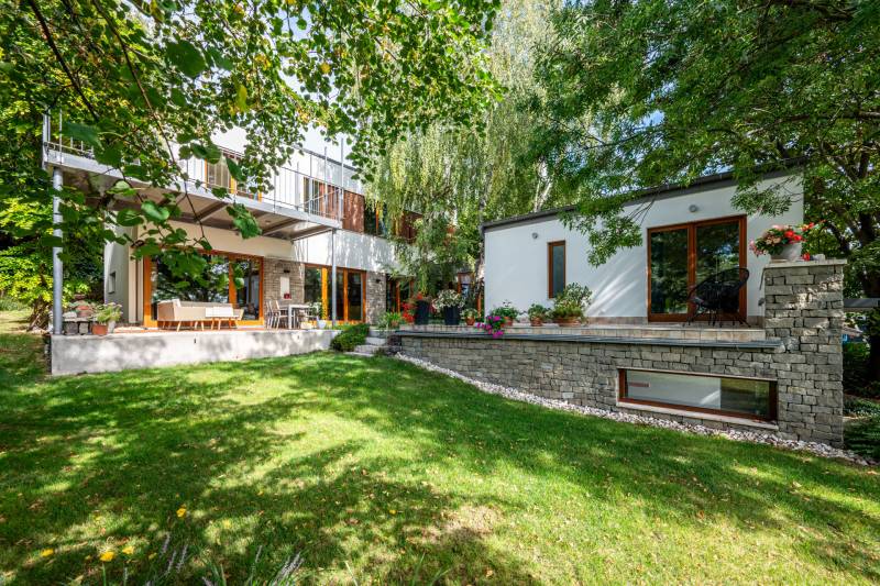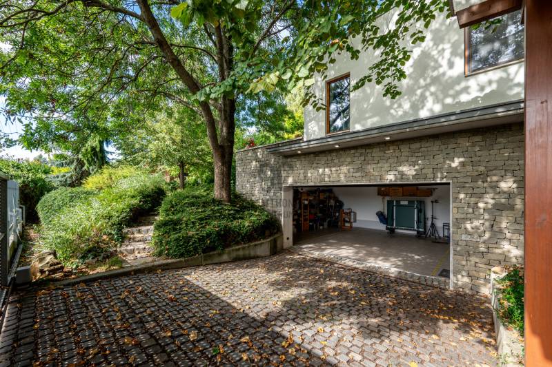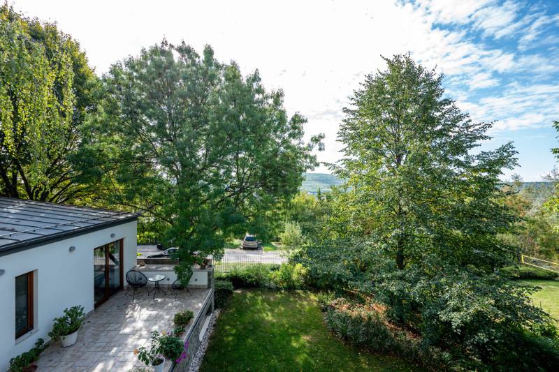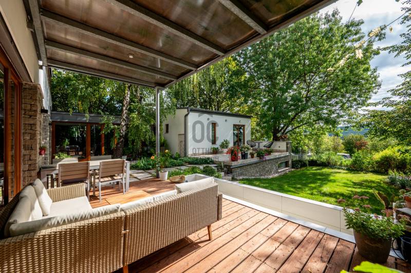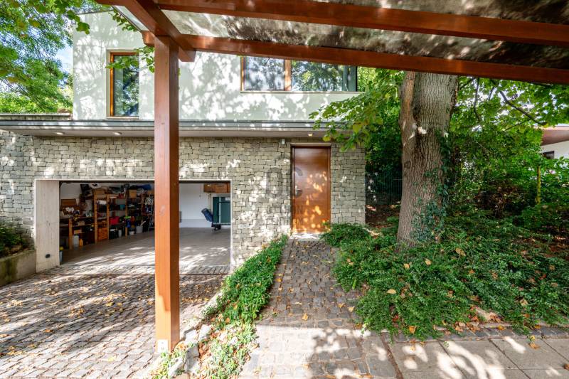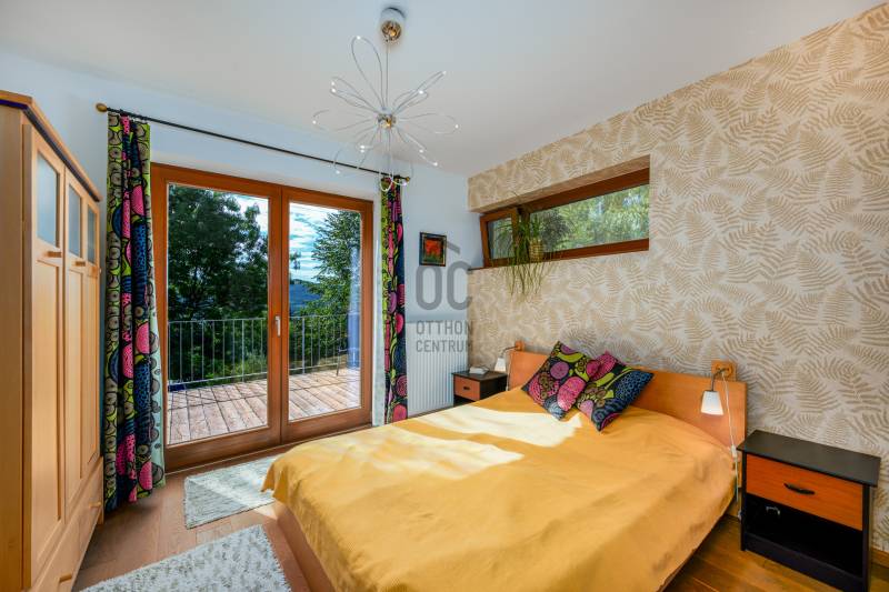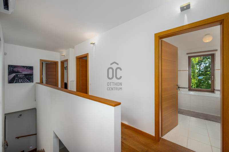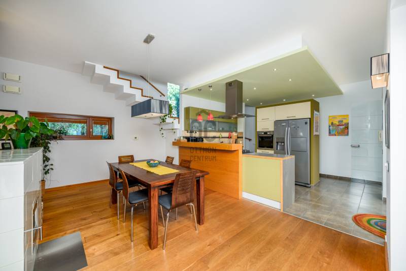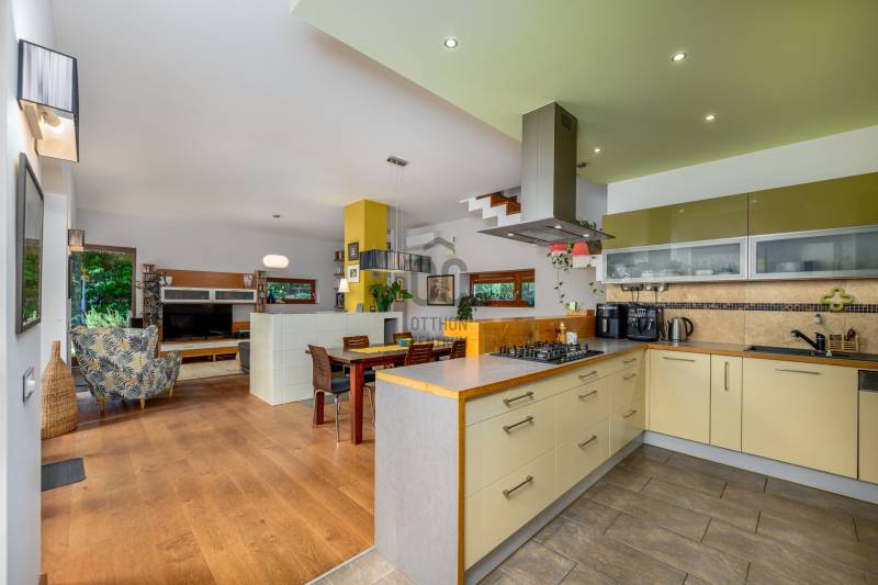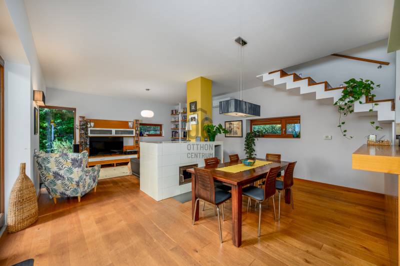 Lenyűgöző természetközeli luxus, ahol a design és a környezet tökéletes összhangot alkot!Nagykovácsi Cseresznyés részén áll ez a ház, melynek tervezésekor az volt a fő szempont, hogy a meglévő fák megmaradjanak – a végeredmény egy építészeti remekmű, ami körbeöleli az élő természetet. A fák árnyéka természetes hűtést és páratlan atmoszférát biztosít. A lehető legtöbb helyen hatalmas üvegfelületek engedik be a fényt és szinte elmossák a bel- és kültér közötti határokat. A ház egyik különleges építészeti megoldása a télikert, amely olyan érzetet nyújt, mintha közvetlenül a kertben sétálnánk.Mindezt a hatást fokozza a ház teraszairól elénk táruló csodás panoráma.Főbb paraméterek:- 237 m2 nettó alapterület- 2 lakószint + szuterénszinten a garázs- nappali + 4 szobaA szobák elosztása lehetővé teszi különböző generációk elkülönülését- 3 fürdőszoba + 2 kézmosós wc- fűtés: kondenzációs kazán, (szobákban radiátor, nappali-étkezőben padlófűtés), 3 db hűtő-fűtő split klíma, nappaliban cserépkályha- parkolás: 2 állásos garázs + nyitott beálló- 24 m2 fedett terasz- 11 m2 nyitott terasz- 17,8 m2 erkélyMűszaki paraméterek:- Porotherm 30 külső falazat+ 15 cm hőszigetelés- tető: VM-Zinc horganylemez- 3 rétegű fa nyílászárók - tölgy svédpadló padló- és lépcsőburkolatok- furnérozott tölgy belső ajtók- teraszok burkolata: kerámia, vörösfenyő, travertin mészkő- tetőn 5,3 kW-os napelemrendszer- automata öntözőrendszer- kerti csobogó- kerti tárolóAjánljuk 4-5 fős családoknak vagy nagyszülőkkel összeköltözőknek.Ha szeretné megtekinteni, várom hívását! |