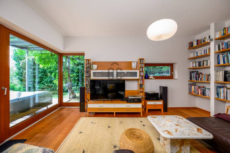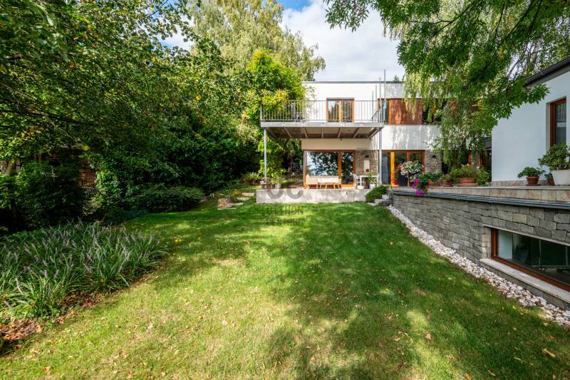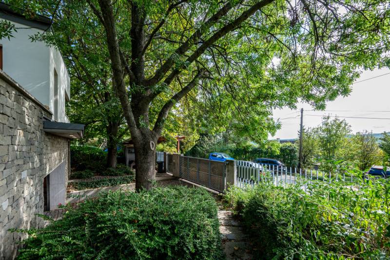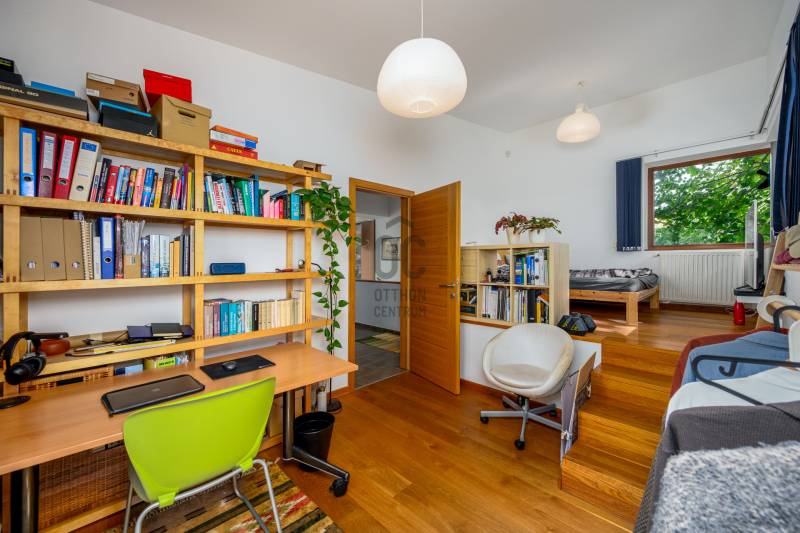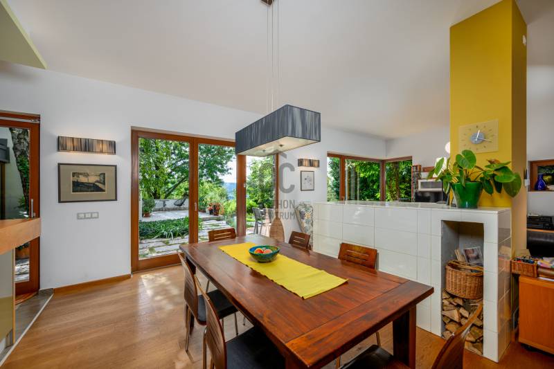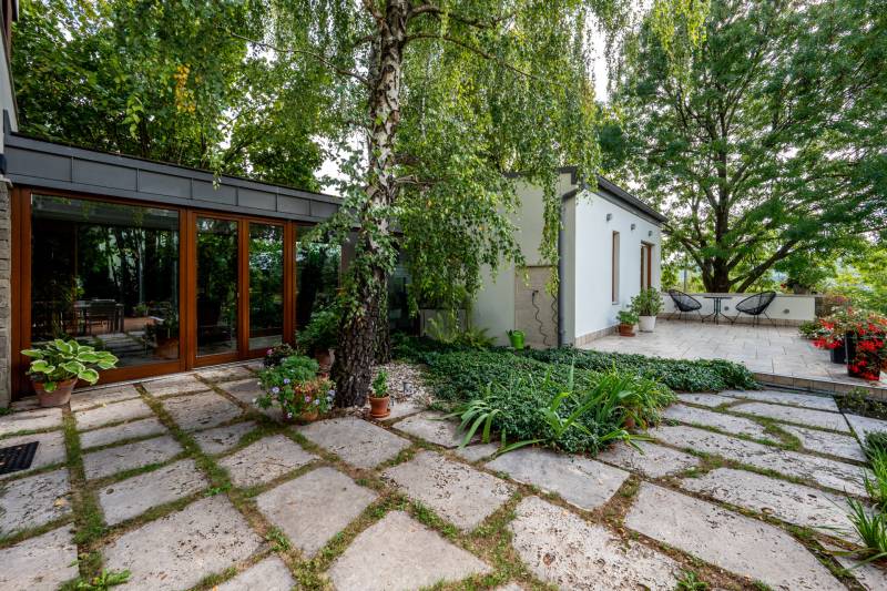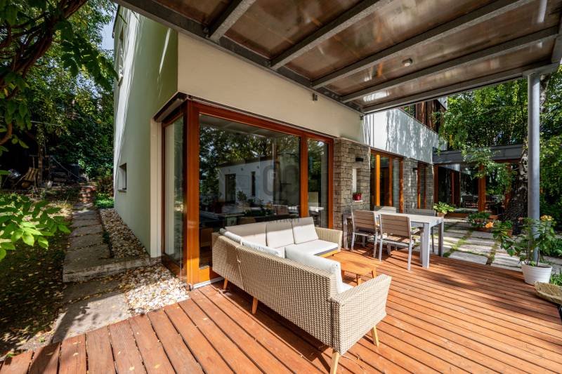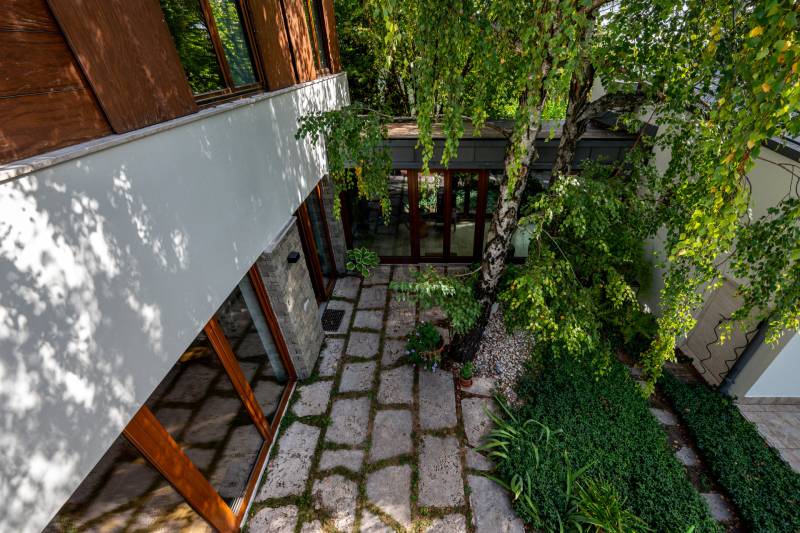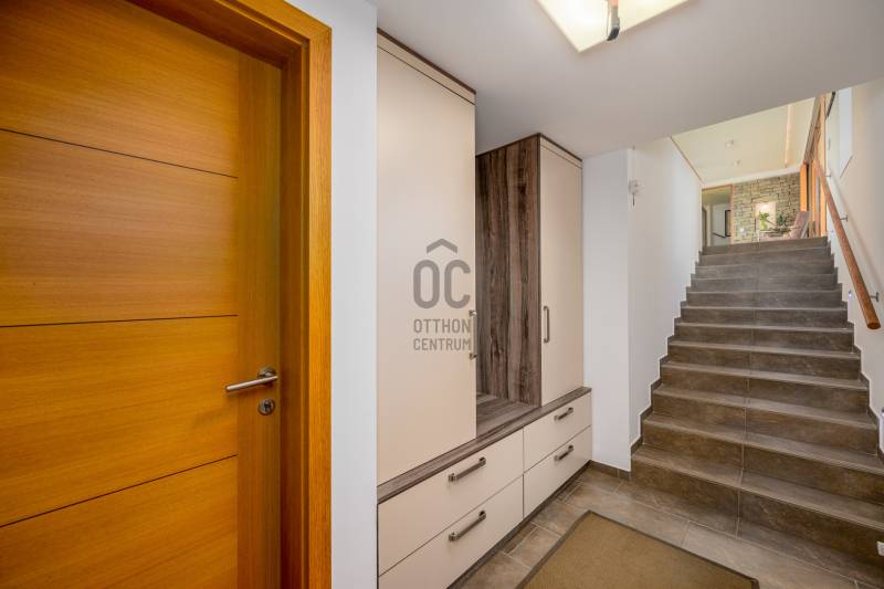 Lenyűgöző természetközeli luxus, ahol a design és a környezet tökéletes összhangot alkot!Nagykovácsi Cseresznyés részén áll ez a ház, melynek tervezésekor az volt a fő szempont, hogy a meglévő fák megmaradjanak – a végeredmény egy építészeti remekmű, ami körbeöleli az élő természetet. A fák árnyéka természetes hűtést és páratlan atmoszférát biztosít. A lehető legtöbb helyen hatalmas üvegfelületek engedik be a fényt és szinte elmossák a bel- és kültér közötti határokat. A ház egyik különleges építészeti megoldása a télikert, amely olyan érzetet nyújt, mintha közvetlenül a kertben sétálnánk.Mindezt a hatást fokozza a ház teraszairól elénk táruló csodás panoráma.Főbb paraméterek:- 237 m2 nettó alapterület- 2 lakószint + szuterénszinten a garázs- nappali + 4 szobaA szobák elosztása lehetővé teszi különböző generációk elkülönülését- 3 fürdőszoba + 2 kézmosós wc- fűtés: kondenzációs kazán, (szobákban radiátor, nappali-étkezőben padlófűtés), 3 db hűtő-fűtő split klíma, nappaliban cserépkályha- parkolás: 2 állásos garázs + nyitott beálló- 24 m2 fedett terasz- 11 m2 nyitott terasz- 17,8 m2 erkélyMűszaki paraméterek:- Porotherm 30 külső falazat+ 15 cm hőszigetelés- tető: VM-Zinc horganylemez- 3 rétegű fa nyílászárók - tölgy svédpadló padló- és lépcsőburkolatok- furnérozott tölgy belső ajtók- teraszok burkolata: kerámia, vörösfenyő, travertin mészkő- tetőn 5,3 kW-os napelemrendszer- automata öntözőrendszer- kerti csobogó- kerti tárolóAjánljuk 4-5 fős családoknak vagy nagyszülőkkel összeköltözőknek.Ha szeretné megtekinteni, várom hívását! |