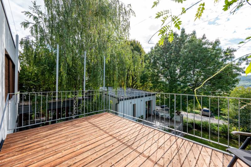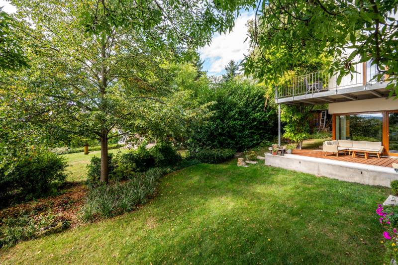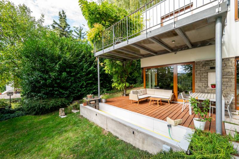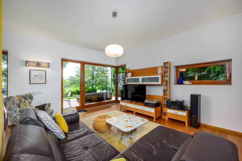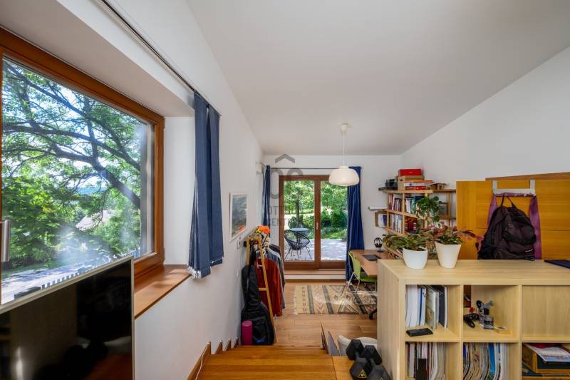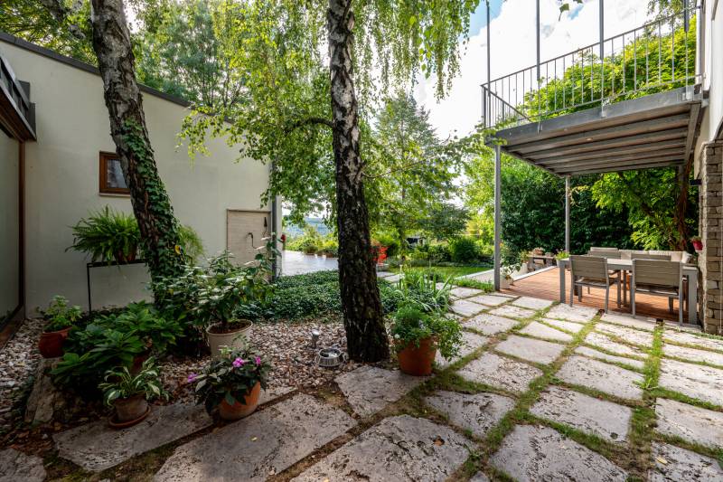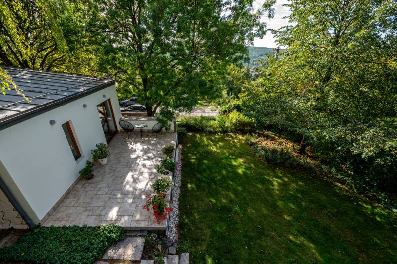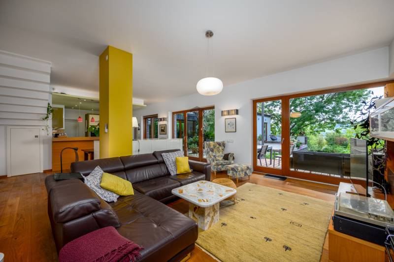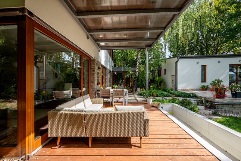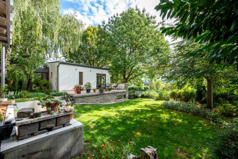Lenyűgöző természetközeli luxus, ahol a design és a környezet tökéletes összhangot alkot!Nagykovácsi Cseresznyés részén áll ez a ház, melynek tervezésekor az volt a fő szempont, hogy a meglévő fák megmaradjanak – a végeredmény egy építészeti remekmű, ami körbeöleli az élő természetet. A fák árnyéka természetes hűtést és páratlan atmoszférát biztosít. A lehető legtöbb helyen hatalmas üvegfelületek engedik be a fényt és szinte elmossák a bel- és kültér közötti határokat. A ház egyik különleges építészeti megoldása a télikert, amely olyan érzetet nyújt, mintha közvetlenül a kertben sétálnánk.Mindezt a hatást fokozza a ház teraszairól elénk táruló csodás panoráma.Főbb paraméterek:- 237 m2 nettó alapterület- 2 lakószint + szuterénszinten a garázs- nappali + 4 szobaA szobák elosztása lehetővé teszi különböző generációk elkülönülését- 3 fürdőszoba + 2 kézmosós wc- fűtés: kondenzációs kazán, (szobákban radiátor, nappali-étkezőben padlófűtés), 3 db hűtő-fűtő split klíma, nappaliban cserépkályha- parkolás: 2 állásos garázs + nyitott beálló- 24 m2 fedett terasz- 11 m2 nyitott terasz- 17,8 m2 erkélyMűszaki paraméterek:- Porotherm 30 külső falazat+ 15 cm hőszigetelés- tető: VM-Zinc horganylemez- 3 rétegű fa nyílászárók - tölgy svédpadló padló- és lépcsőburkolatok- furnérozott tölgy belső ajtók- teraszok burkolata: kerámia, vörösfenyő, travertin mészkő- tetőn 5,3 kW-os napelemrendszer- automata öntözőrendszer- kerti csobogó- kerti tárolóAjánljuk 4-5 fős családoknak vagy nagyszülőkkel összeköltözőknek.Ha szeretné megtekinteni, várom hívását! |