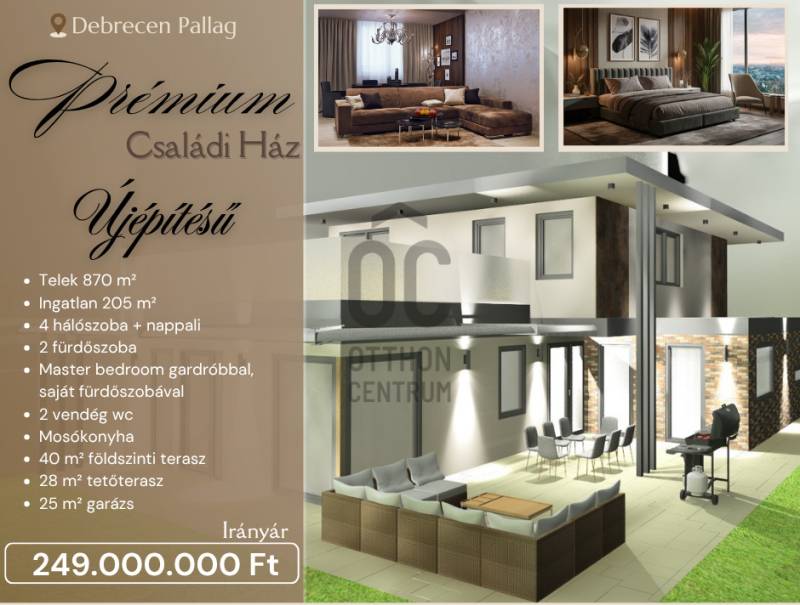 Debrecen egyik legkedveltebb lakóövezetében, Pallag exkluzív lakóparkjában kínálok megvételre egy új építésű, magas műszaki tartalmú, prémium családi házat, 2025. évi befejezéssel.Főbb paraméterek:- Telek méret: 870 m²- Nettó alapterület: 205 m²- Teraszok: 40 m² földszinti + 28 m² tetőterasz- Elosztás: 4 hálószoba + nappali- Master bedroom saját gardróbbal és fürdőszobával- 2 teljes értékű fürdőszoba, káddal, zuhanyzóval és WC-vel- Vendég WC mindkét szinten- Külön mosókonyha- Tágas világos terek, alaposan megtervezett ideális elosztás, biztosítja az ott lakók kényelmét- Műszaki tartalom kiemelkedő minőségben:- 30 cm falazat + 15 cm grafitos szigetelés- 25 cm monolit födém + 18 cm tűzálló PIR hab szigetelés- 3 rétegű, kívül-belül színezett, prémium hőszigetelt nyílászárók- Alumínium, motoros redőnyök minden ablakon- Prémium acél-alumínium bejárati ajtó- Hőszivattyús, helyiségenként szabályozható padlófűtés és mennyezethűtés- Teljes kiépítésű riasztó- és kamerarendszer- Hörmann szekcionált garázskapu távirányítóvalAz ár tartalmazza a teljes kerítésrendszert és parkosítást is!Lokáció előnyei:- Csendes, exkluzív környezet- Kiváló infrastruktúra, gyors bejutás Debrecen központjába- Iskolák, sportközpont, orvosi rendelő a közelbenÁtadás várható időpontja: 2025 ősz/télRészletes műszaki leírással, a kulcsra kész befejezésre vonatkozóan illetve bővebb tájékoztatásért hívjon bizalommal!Rugalmas ügyintézéssel számíthat ránk a hitel ügyintézéstől a kulcsátadásig!Ideális otthon egy ideális helyen! Hívjon, hogy az ingatlant személyesen is bemutathassam! |