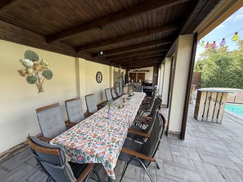 Debrecen egyik legkedveltebb, csendes és zöldövezeti részén, a Csapókertben, közvetlenül a Liget tér szomszédságában kínálunk eladásra egy 2019-ben épült, prémium felszereltségű ingatlant.Főbb paraméterek:-Telek területe: 820 m²-Lakóterület: ~200 m²-Szobák: 4 tágas hálószoba-Nappali + amerikai konyha: 50 m², elegáns és világos központi tér-Fürdőszobák: 2 db-Illemhelyek: összesen 4 db (külön vendég-WC + udvari toalett)-Gardrób és kamra a maximális praktikumért-Dupla garázs: 33 m², elektromos autó fali töltővel, teljes falhosszon beépített szekrényekkel-Üvegterasz: 20 m², négy évszakos használatra kialakítvaLuxus és kényelem:-Padlófűtés az egész házban-Okos árnyékolástechnika-Riasztó- és kamerarendszer-15 cm grafitos szigetelés-10 kW napelem rendszer-Szülői hálóban infra szauna-Dolby atmos házimozirendszer+ motoros vetítővászonKültéri élmények:-7,5 méteres, hőszivattyúról hűtött-fűtött medence-Teraszon jakuzzi a tökéletes kikapcsolódásért-Telepített robotfűnyíró és automata öntözőrendszer, mely fúrt kútról és városi vízről is üzemeltethető- 13 méter hosszú filagória, mosogatóval, mosogatógéppel, hűtővel, borhűtővel és toalettel- hatalmas kutyakennel a házikedvenceknek - játszótér a legkisebbeknekEz az ingatlan tökéletes választás mindazoknak, akik a belváros közelsége mellett, modern, energiatakarékos és minden igényt kielégítő otthont keresnek. A tágas terek, a magas minőségű kivitelezés, valamint a kültéri wellness szolgáltatások garantálják a maximális kényelmet.Kérdés, időpont egyeztetés esetén várom hívását! |