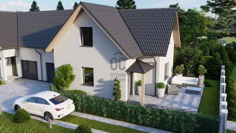 Dunakeszi kertvárosi részén, kellemes környezetben, eladó belső kétszintes ikerház rész. A környék jó adottságokkal rendelkezik, Budapest a gyorsforgalmi út közelsége miatt gyorsan elérhető, bevásárló központ , iskola, óvoda a közelben.A vonat állomás 5 perc séta távra.A kikapcsolódni vágyóknak a Duna part pár perc sétával elérhető.Jelenleg már csak egy ikerház fél első fele eladó, dupla komfortos, két fürdőszobával,külön WC-vel, saját fűtött garázzsal,gépészeti térrel, közlekedőkkel, nappali, konyha-étkező, valamint 3 hálószoba elrendezéssel.Az ikerház rész saját leválasztott kerttel rendelkezik .Az emeleti helyiségek és a kert elrendezése szabadon választható.Az eladó 1-es számú házrész méretei és elrendezése a mellékelt alaprajzon megtekinthető. Nettó 127 nm AZ ÁR SZERKEZETKÉSZ ÁLLAPOTRA VONATKOZIK!! A HÁZ BEFEJEZÉSÉRE VALÓ KÖLTSÉGEK, MEGEGYEZÉS SZERINT!Tervek, igény szerint: Az ingatlan kiemelkedően energiatakarékos, „A+” energetikai besorolású.A külső falazat Porotherm 25-as tégla, 15 cm-es dryvit hőszigeteléssel, a házrészek között 2 * 20 cm-es hangszigetelt fallal és szigetelt dilatációval. Műanyag korszerű nyílászárók A házrész fűtése akár felső kategóriás hőszivattyúval vagy gáz fűtéssel kérhető, Ezen kívül beépített redőnytokkal, elektromos redőnnyel, valamint riasztó előkészítéssel és elektromos garázskapukkal rendelkeznek. Mindegyik ingatlanhoz a normál 3 fázisú mérőn 3,5 kW napelem.A burkolatok és szaniterek szabadon választhatók .Szerződéskötéstől 3-4 hónap a kulcsra kész birtokba adás. Osztatlan közös tulajdon, ügyvédi megosztással |