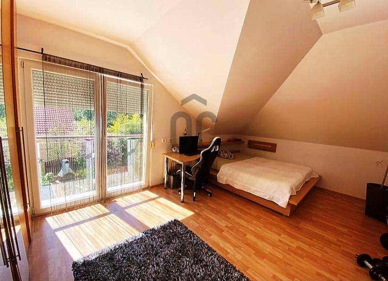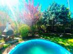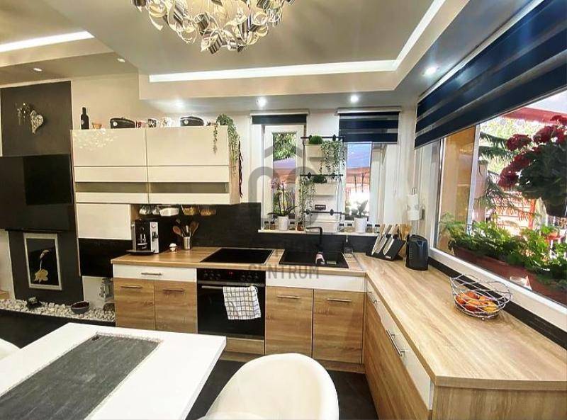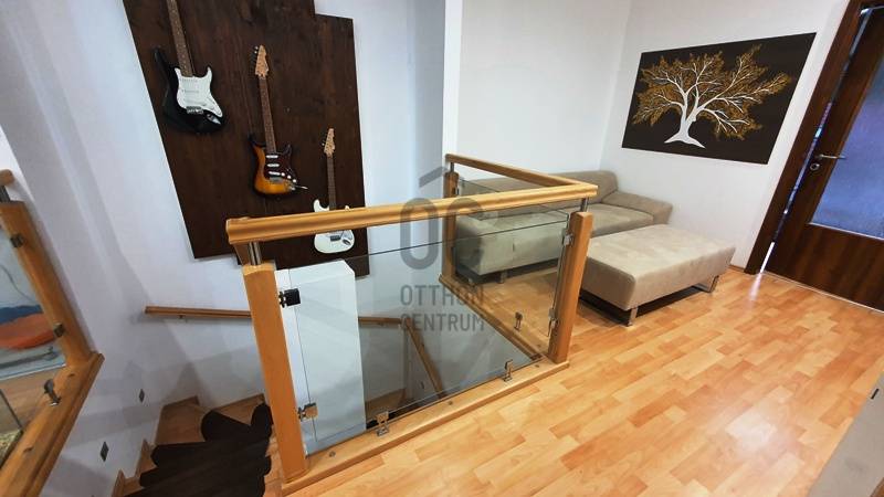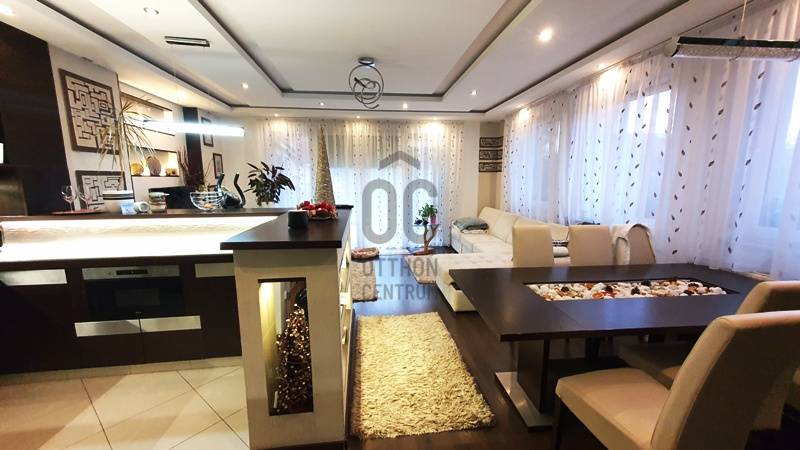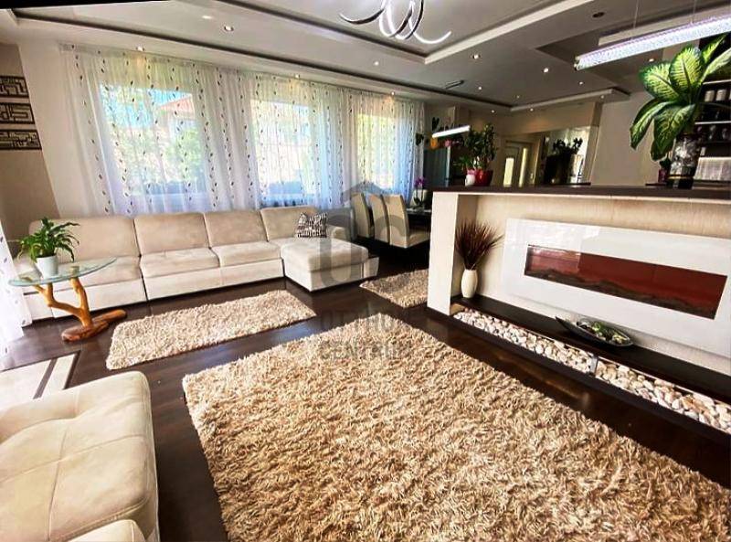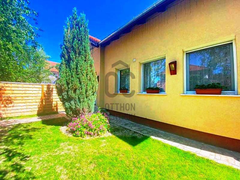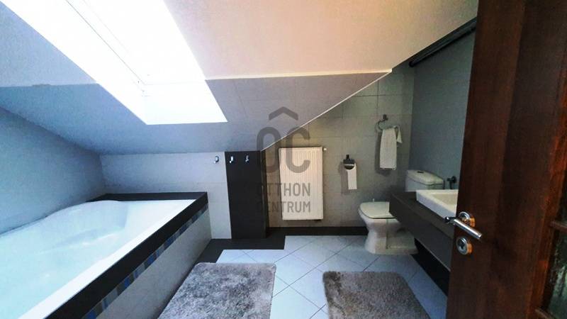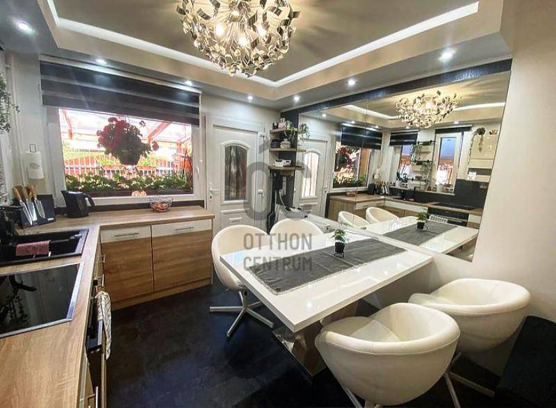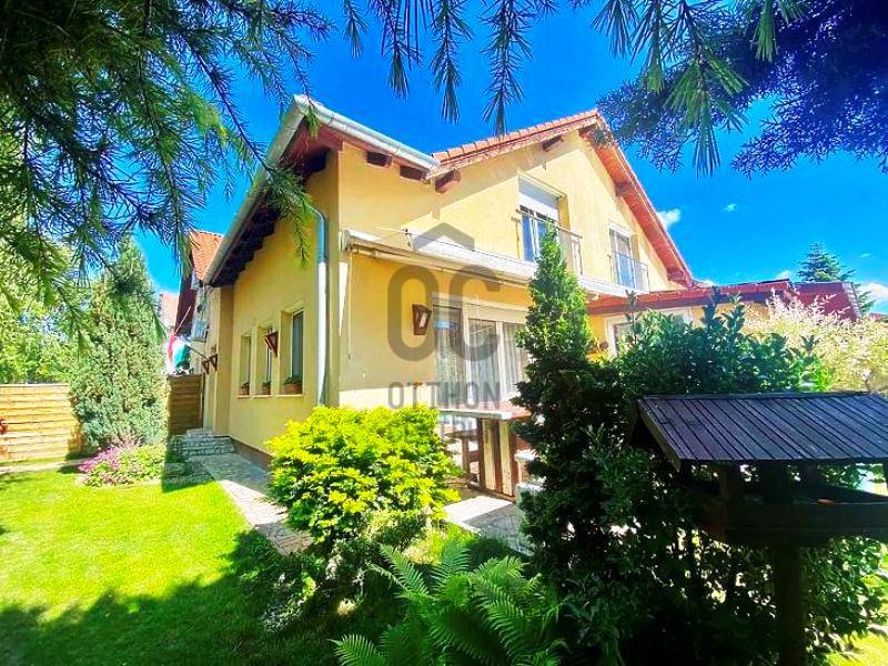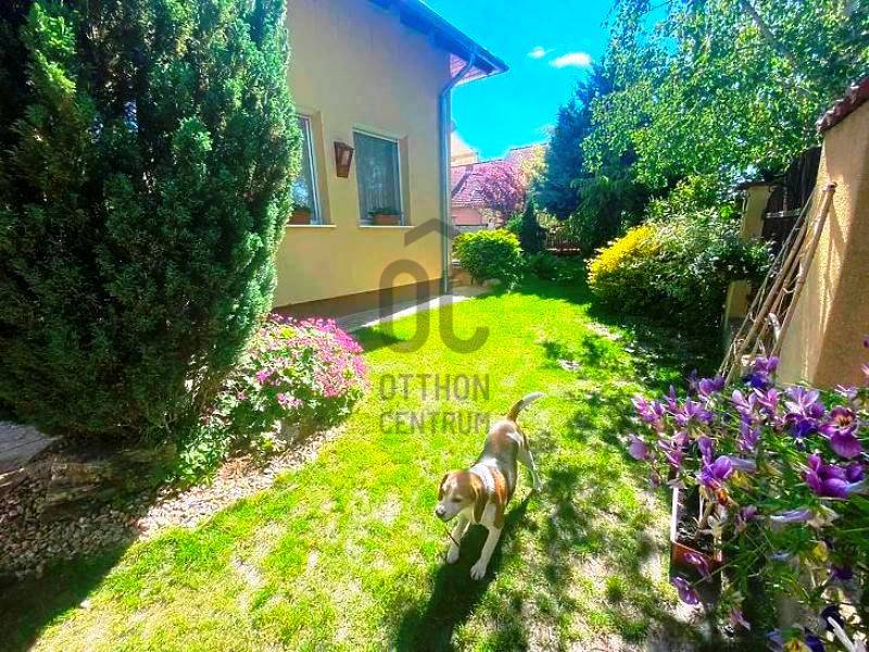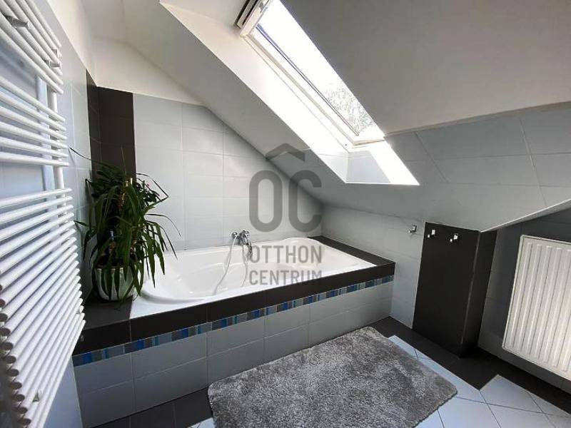 Dunakeszi Duna-parthoz és a központhoz közeli, mégis csendes, forgalomtól mentes utcájában, 2 generációs (és akár 3 generációssá alakítható!), kitűnő állapotú, modern, stílusos, sok extrával felszerelt ikerház fél eladó.A ház 380 m2-es telken áll, jelenleg 2 lakrészből áll, összesen bruttó 165 m2, 6 szobával, dupla komforttal és egy 17 m2-es fedett terasszal rendelkezik. Világos, kellemes, otthonos, élhető terei úgy kapcsolódnak, hogy akár egy harmadik generáció szeparált lakhatása is kialakítható, vagy egy egyszerű összenyitással egy nagy családi házzá (vissza)alakítható. A ház 2006-ban épült, 38-as Porotherm téglából, és 10 cm-es dryvit, szigetelést kapott, Bramac cseréppel fedett, hő és hangszigetelt nyílászárókkal, redőnyökkel és szúnyoghálóval felszerelt. Klimatizálás, riasztó és elektromos kandalló is van.A padlástérben egy 30 m2-es rész még szabadon alakítható.Téli teljes rezsiköltsége 46 000 Ft.A kert parkosított, öntözőrendszerrel ellátott. Itt kapott helyet egy medence és van továbbá egy kerti tó, és egy fúrt kút is, valamint egy 6 és egy 12 m2-es tároló.Jelenleg 2 db autóbeállási lehetőség van, egy fedett és egy fedetlen. (A 2 generációssá alakításkor a garázsból lakrész lett, amit egy egyesítés után vissza lehet állítani.Közlekedése, ellátottsága kiváló, tanintézmények, vásárlási lehetőségek és szolgáltatások, a Duna-part, buszmegálló percek alatt elérhető.Az összes beépített bútor és egyéb berendezés a vételár részét képezi, a többi bútor megegyezés tárgya lehet.Kérdéseivel keressen bizalommal akár hétvégén is! Időpont egyeztetés legalább az előző napon szükséges. |