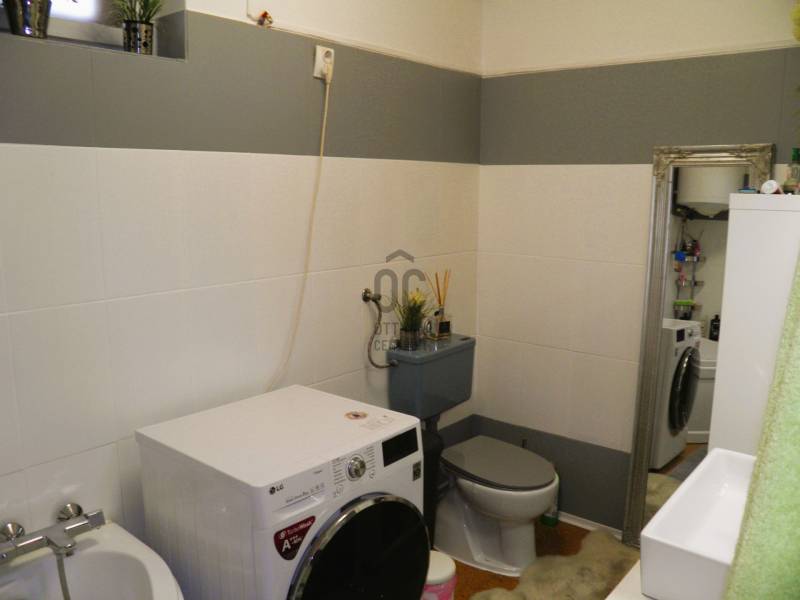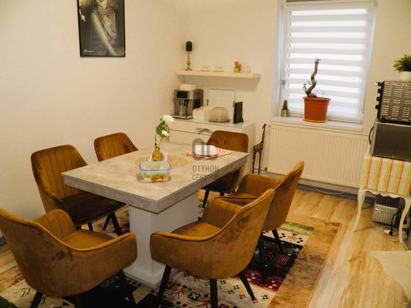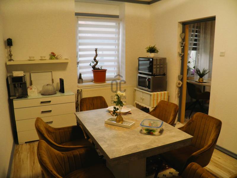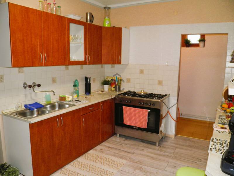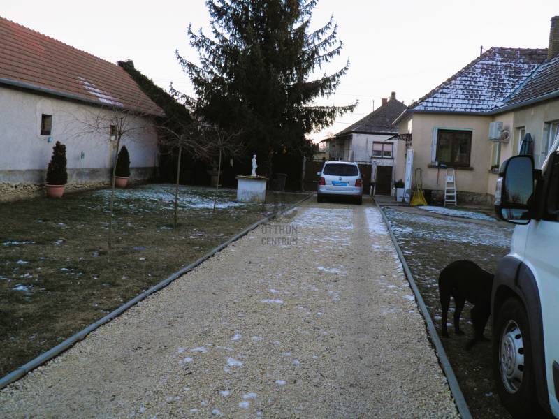 A VESZPRÉM MEGYÉBEN, NEMESHANYON ELADÓ EGY 110 M2-ES FELÚJÍTOTT CSALÁDI HÁZ, JELENTŐS MÉRETŰ TELEKKEL. Nemeshany a 8-as és a 84-es főutakat, azaz a Devecsert és Sümeget összekötő út mentén található. Devecser 7 , Sümeg, a járási székhely 13 km. Balatonederics csupán 30 km-re fekszik.A tégla építésű cserép fedésű ház az elmúlt 10 évben folyamatosan nyerte el jelenlegi arculatát, hogy modern, kényelmes otthona legyen akár nagyobb családnak is. 3200 m2 nagyságú telke gazdálkodásra, állattartásra is alkalmassá teszi. A terület utcafronti szélessége 22,5 méter, mintegy 170 méter hosszan nyúlik a határba. Az épület magas alappal rendelkezik, száraz, jó statikai állapotú. Egyéb lényeges jellemzői:- Megújultak a víz- és szennyvíz csövek, műanyag nyílászárók kerültek beépítésre. A helyiségek tágasak, világosak.- Közművek: víz, 3 fázisú áramszolgáltatás, csatorna hálózatra rákötve a szennyvíz elvezetés. Gázvezeték az utcában, a szolgáltatás igényelhető..- A ház központi fűtése vegyes tüzelésű kazánnal megoldott, radiátor hőleadókkal. Meleg vizet villanybojler állít elő. A tűzhely gázpalackkal működik, sütője villany. - A lakrész mögött sorakozik a kazánház, tároló helyiség, dupla garázs. - Elektromosan nyíló kapu. - Ásott kút az udvaron.- A ház beosztása: Zárt veranda / előtér vezet a központi nappali helyiségbe, ahonnan a két utcafronti nagyszoba, és a fürdő nyílik. A konyha a nappalival egy légterű, fallal félig szeparált. A konyha mögött étkező szoba. Közlekedő vezet a negyedik szobához . A padlóburkolat a fürdőben és a közlekedőben meleg parafa, másutt mindenütt laminált parketta .Amennyiben felkeltette érdeklődését a bemutatott ingatlan, nézze meg személyesen is időpont egyeztetés után. Kérem, hívjon / írjon a megadott elérhetőségeken. |