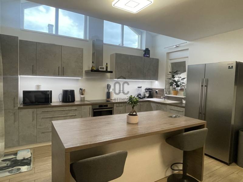 BALATONSZENTGYÖRGY központjában egy modern családi házat kínálunk eladásra!A teljeskörűen újjáépített családi házban kényelmes terek kerültek kialakításra. A földszinten 2 hálószoba, egylégterű konyha-étkező, nappali valamint fürdő-wc, tároló, háztartási helyiség találhatók. Az emeletet az új tulajdonos a saját ízlésének megfelelően tudja kialakítani, melyhez a közművek és a fűtés előkészítése kiépítésre került.A belső nagy tereken kívül egy hatalmas fedett terasz is tartozik a házhoz, amely kényelmes és központi helye a családi életnek, bármilyen alkalomról legyen szó vagy egyszerűen csak a hétköznapok során.Az ingatlanhoz tartozik egy 25 nm-es lakó/dolgozószoba, amiből egy különálló lakórész vagy apartman is kialakítható. Egy fedett 2 állásos nyitott garázs is tartozik az ingatlanhoz. A ház körüli kert jól kialakított, egyenes fekvésű, fákkal, cserjékkel beültetve és kiépített öntöző rendszer is található a kertben, amely kútról is üzemeltethető.Bármilyen kérdése lenne az ingatlannal kapcsolatban, kérem keressen minket bizalommal! |