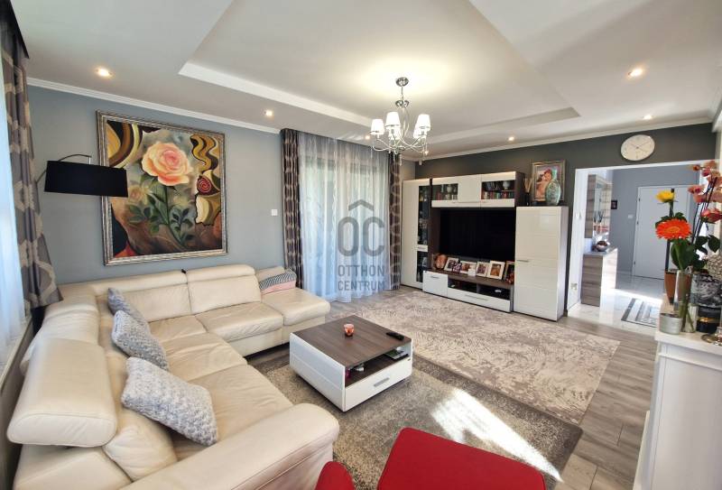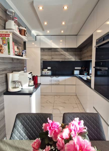 Eladó Erdőkertes Háromház városrészében új építésű házak környezetében egy újszerű, modern, 2020-ban - egyedi tervek alapján, magas műszaki tartalommal, és minőségi anyagokkal - épült, 155 nm-es, földszintes 4 szobás önálló családi ház. Elosztása három normál méretű szobát, beépített szekrénnyel rendelkező előszobát, tágas, a 20 nm-es fedett terasszal kapcsolatos nappalit, gépesített konyhát, étkezőt, háztartási helyiséget, külön wc-t, káddal és zuhanyzóval is rendelkező nagy fürdőszobát és egy dupla állásos, közvetlen előszoba kapcsolatos fűtött, gumi parkolási ütközővel is ellátott garázst foglal magába. A 12 cm-es külső és 20 cm-es mennyezeti szigeteléssel ellátott épületet, telefonnal vezérelhető termosztáttal ellátott Immergas kondenzácíós gázkészülék fűti, radiátoros központi rendszeren keresztül. Az ingatlan esztétikai és műszaki tartalmát gazdagítják egyedi kivitelezési megoldásai, számtalan intelligens extrával - Somfy IO intelligens otthon - is kiegészülve, melyek a teljesség igénye nélkül a következők: Alumínium színezett csatornarendszer, riasztó rendszer mozgásérzékelőkkel és kamerarendszerrel, Honeywell típusú vízszűrő, három rétegű kívülről színes, szúnyoghálóval és alumínium színezett külső párkányokkal is ellátott műanyag nyílászárók, egyedi porta beltéri nyílászárók, AH típusú kívülről színezett biztonsági bejárati ajtó, alumínium színezett redőnyök telefonról vezérelhető motormozgatással, kívülről színezett Rimessa dupla garázskapu mely szintén telefonról vezérelhető, ahogyan a kétszárnyú kertkapu és a 3,5 kw-os Hitachi inverteres split klima is. Az áramellátást 3*16 A biztosítja, 7,5 kw-os napelemrendszer áll rendelkezésre, például a garázsban elhelyezett 3 fázisú Wallbe elektromos autótöltő, és nappaliban található elektromos kandalló üzemeltetésére. A 834 nm-es telek, a több autó beállását is biztosító térkövezett felületen és egy 9 nm-es tárolón túl, parkosított udvarral rendelkezik, melyet robot fűnyíró és wifiről vezérelhető, locsoló almérőre kötött autómata öntözőrendszer segít karban tartani. Az ingatlan tehermentes, jogilag rendezett, várja minőségi és kényelemes otthonra vágyó új lakóit.Ha felkeltettem érdeklődését, várom hívását! |