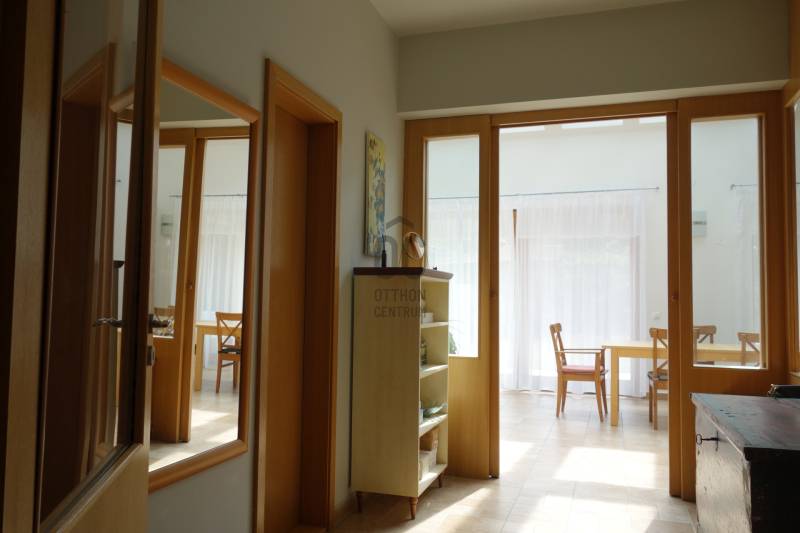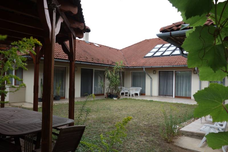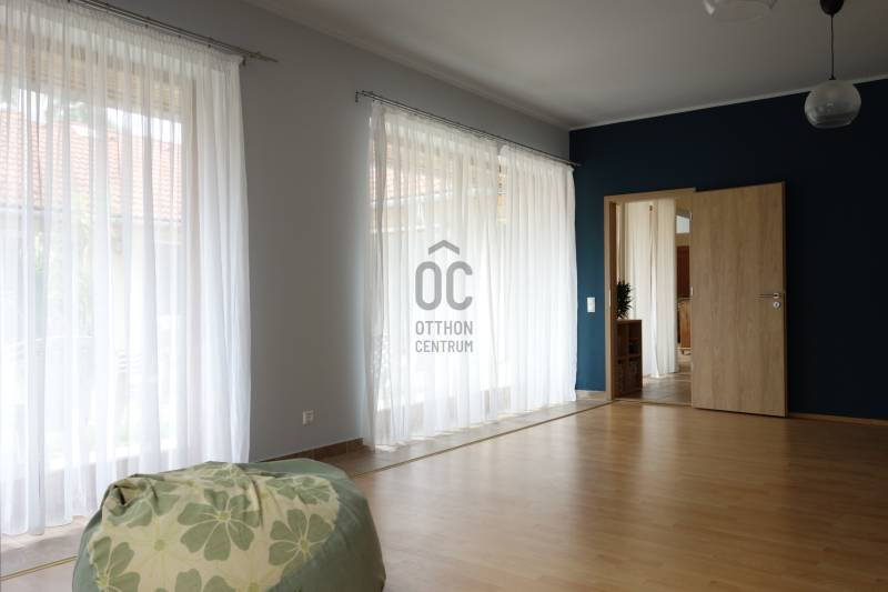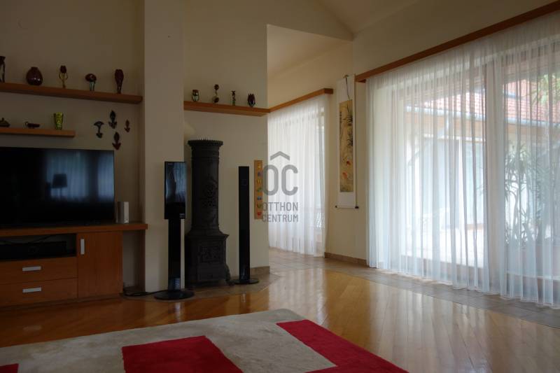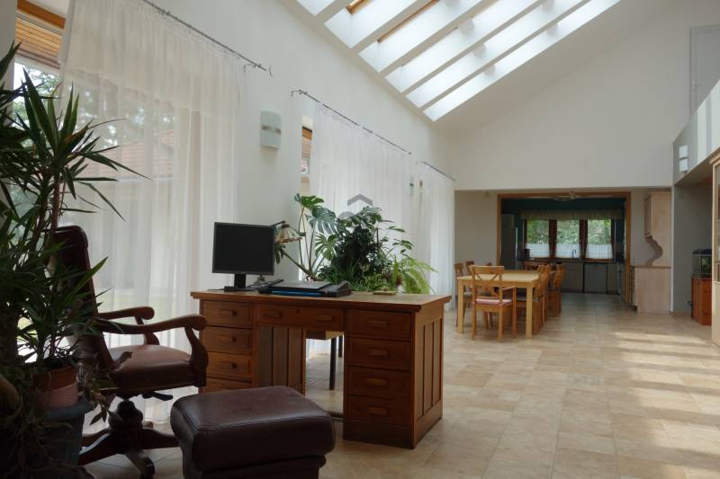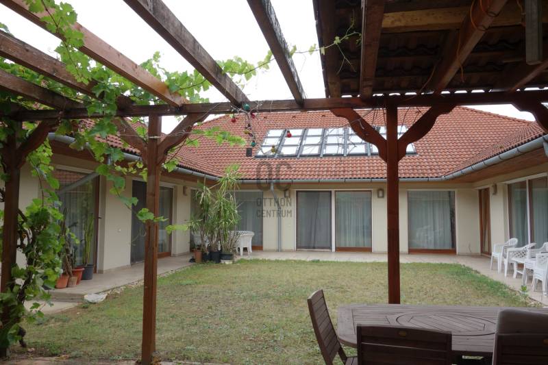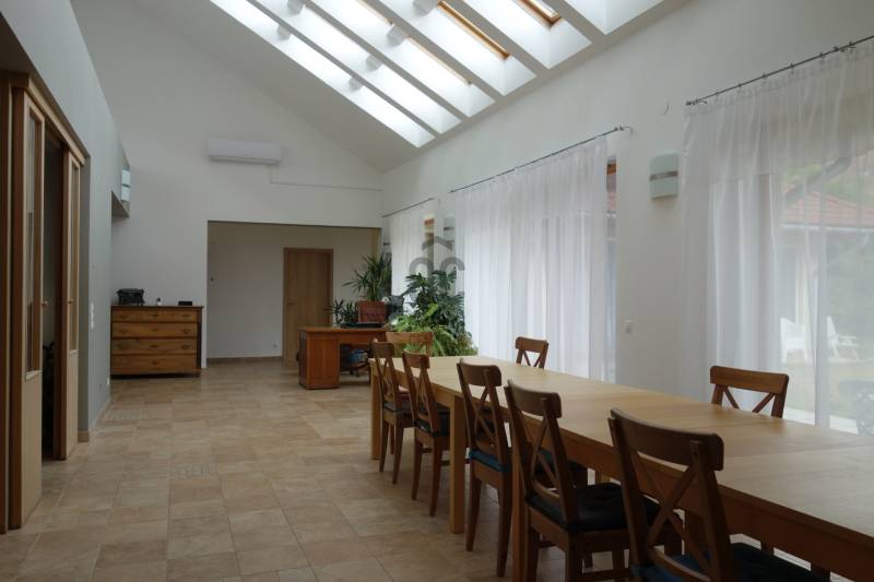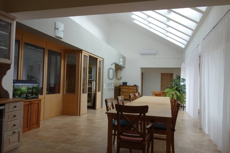 Mogyoródon a méltán kedvelt Szent Jakab lakóparkban eladósorba került egy gyönyörű családi ház. A dupla telken elhelyezkedő ingatlan 2003-ban épült.A körbejárható egy szintes házban nagy terekkel rendelkező otthon kiváló lehet nagyobb családoknak vagy akár több generáció összeköltözésére is. A közel 300nm-s házat 6 szobával, három fürdőszobával tulajdonosai a Feng Shui elvei szerint álmodtak meg. Ennek és az építészeti tervezésnek köszönhetően rendkívül jó energiája vana háznak. Nagy terek, tágas szobák és kényelmes - praktikus kialakítása minden korosztály számára a kényelmet szolgálja. Például mosókonyha, dolgozószoba,gardrobeszoba, fitnesszrészleg és a már beépített tetőteret tárolónak használva. Ez utóbbi tovább fejleszthető, lakótérként használható. Az igen tágas télikertjelenleg étkező-közösségi tér, tetőablakai nyithatóak. A házban akár két különálló lakrész is kialakítható, külön bejárattal. Ennek előkészítése megtörtént, ehhez csupán egy fal megépítése szükséges. Energetikailag kítűnő, besorolása EE, öko jellegű energiafelhasználással. Fűtését a két évvel ezelőtt telepített hőszivattyú, melegvízellátását egy kombi gázkazán biztosítja, mely fűtésre is alkalmas. A házban 4 db klíma található, a hidegburkolatos helyiségekben padlófűtés van. A gyönyörű ősfás nagy telek-kert kiválóan alkalmas családi összejövetelek megrendezésére és kertészkedésre egyaránt. Számos gyümölcsfa, kerti tó és grillező, illetve kemence a szaletli alatt, minden igényt kielégít. A kertben öntözőrendszer és egy kerti tó is kialakításra került. Egy nagyon helyes borospince is helyet kapott a kertben, ahol a család férfitagjai barátokkal elvonulhatnak. Az épület U alakú kialakításával közrefogott terasz és a kert szélvédett, napos. A két állásos garázs tágas, felette tároló kapott helyet. A lakópark nyugalmát őrző-védő szolgálat vigyázza. Nívóját beléptető rendszer és portaszolgálat emeli. A lakópark fenntartása mint közösköltség 25eFt havonta.Aki itt él, csendes, nyugodt zöld környezetben erdő mellett egy másfajta életminőséget tudhat a magáénak. Rendkívül jó a megközelítése, autóval 20-25 perc, hévvel 35perc alatt érhetjük el az Őrs Vezért terét. Tulajdonosai nagyon szeretnek itt élni, gyerekek kirepülése hozatta meg velük az eladás melletti döntést. Várom hívását, egy élmény lesz a bemutató is! |