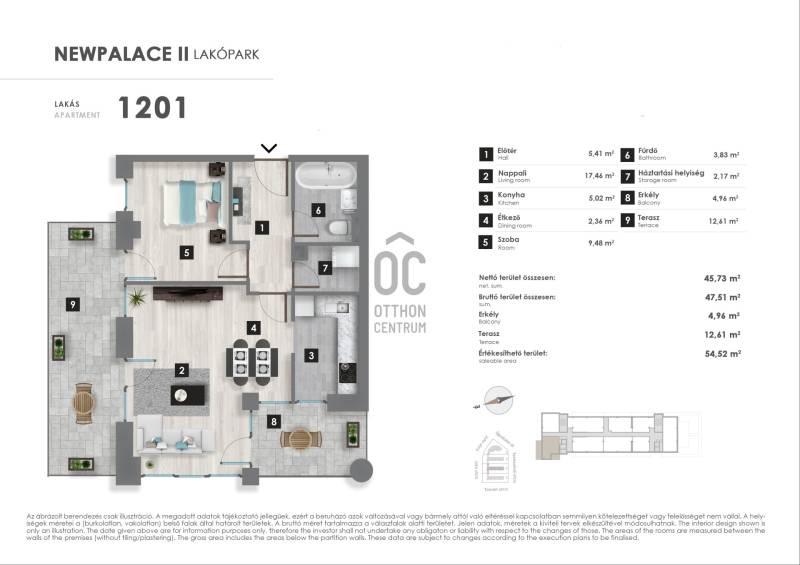 Projekt bemutatásaNew Palace II. ütemA New Palace a XIII. kerület csendes részén épül. A megújult kertvárosias környezet a pesti oldal egyik legkedveltebb részei közé tartozik, az itt élők egyszerre élvezhetik a csöndes kis utcák nyugalmát és a belváros közelségét.A társasház különleges, extravagáns homlokzatával egyedi fiatalos dizájnjával, kiemelkedik a környező épületek közül és ezáltal lesz majd sokáig a környék ismert és meghatározó tájékozódási pontja. A már eddig is komoly fejlődésen és megújuláson átesett városrész a projekt megvalósulásával beírja magát a kerület új városrészei közé.A földszint + 12 emelet magas épületet elegáns, kertépítők által tervezet parkok veszik körül, megreformálva a társasház környezetét is. A zárt, csak a társasház lakói által megközelíthető udvaron fákkal, cserjékkel tarkított, füvesített zöldkert kerül kialakításra.A lakások két elegáns, egymástól elkülönülő lobbyn keresztül közelíthetőek meg, lépcsőházanként két-két lifttel. A lakáskínálatban az egyszobás lakástól egészen a négyszobásig mindenféle elosztású megoldás megtalálható, a kínálatban alig van két egyforma lakás. Minden lakás rendelkezik erkéllyel vagy terasszal, a földszinti és néhány exkluzív emeleti lakás pedig, intenzív zöldtetővel, saját kertrésszel.Figyelembe véve a jövő elvárásait, a társasház modern, környezetbarát, mennyezeti hűtő, -fűtő rendszerrel ellátott.Vevőinknek lehetőségük nyílik arra is, hogy megvásárolt otthonukat az utolsó részletig személyre szabhassák: módosítással élhetnek otthonuk elosztása tekintetében is, továbbá széles kollekcióból választhatnak meleg- és hideg burkolatokat. Az alapáras burkolatokon felül, elérhetőek feláras termékek is, mely biztosítja, hogy személyiségük otthonukban is vissza tükröződhessen.Az infrastruktúra is magáért beszél: a közeli Váci út kiváló közlekedése és bevásárlási lehetőségei, a megújult 3-as metró Gyöngyösi utcai megállója rövid sétával elérhető, hasonlóan az idilli hangulatú Gyöngyösi sétányhoz, mely a kerület egyik legkedveltebb részei közé tartozik. Szintén pár perc sétatávolságra a folyamatosan megújuló és minden igényt kielégítő Duna Pláza bevásárlóközpont (benne: SPAR, gyógyszertár, Rossmann, DM, Médiamarkt, tisztító, fodrászatok, virágbolt, Libri könyvesbolt, papír-írószerbolt és számos ruházati bolt. Kényelmesen megoldható a napi fogyasztási cikkek beszerzése is a nap bármely órájában a közvetlen közelben lévő Tesco áruházban és az üzletsoron lévő boltokban. A lakópark tágabb vonzáskörzetében de még mindig elérhető távolságban találjuk Újpest-központot, a Népszigetet és az Újpest vasútállomást.Irodánkban a legtöbb XIII. kerületi beruházás lakásai elérhetőek ügyfeleink számára.A jelen adatok tájékoztató jellegűek, ezért a Beruházó (sem a hirdető) azok változásával, vagy bármely attól való eltéréssel kapcsolatban semmilyen kötelezettséget, vagy felelősséget nem vállal.Az alaprajzokon ábrázolt berendezési tárgyak és bútorok, a burkolatok megjelenése nem képezi a szerződés tárgyát. A pontos felszereltségről a műszaki leírásban olvashat bővebben.Az aktuális lakáskínálatról és árakról érdeklődjön telefonon! |