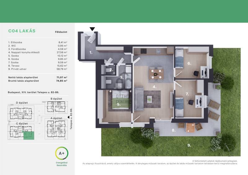 Projekt bemutatásaA Daisy Liget Zugló csendes részén épül, közel a Bosnyék térhez. A megújult kertvárosias környezet a pesti oldal egyik legkedveltebb részei közé tartozik, az itt élők egyszerre élvezhetik a csöndes kis utcák nyugalmát és a belváros közelségét. A Bosnyák téren mindent megtalálunk ami a hétköznapi élethez szükséges: a Zenit corso bevásárlóközpontot, a Bosnyák téri piacot, patikát, éttermeket és kávézókat.Számos óvodát, általános iskolát, játszóteret és sportközpontot is találunk a 10 perces sétatávolságon belül.A társasház különleges homlokzatával, egyedi fiatalos dizájnjával, kiemelkedik a környező épületek közül. A 4 emelet magas, szellősen elhelyezett épületek tökéletesen illeszkednek a környéken jellegzetes, előkertes kialakítású épületekhez.Figyelembe véve a jövő elvárásait, a társasház modern, környezetbarát, mennyezeti hűtő, -fűtő rendszerrel ellátott.Vevőinknek lehetőségük nyílik, hogy új otthonukat az utolsó részletig személyre szabják: változtathatnak az ingatlann elosztásán, széles kollekcióból választhatnak meleg- és hideg burkolatokat, szanitereket. Az alapáras burkolatokon felül, elérhetőek feláras termékek is, mely biztosítja, hogy olyan lakásban lakjanak mit megálmodtak maguknak.A fizetési ütemezés: 10-90%A jelen adatok tájékoztató jellegűek, ezért a Beruházó (sem a hirdető) azok változásával, vagy bármely attól való eltéréssel kapcsolatban semmilyen kötelezettséget, vagy felelősséget nem vállal.Az alaprajzokon ábrázolt berendezési tárgyak és bútorok, a burkolatok megjelenése nem képezi a szerződés tárgyát. A pontos felszereltségről a műszaki leírásban olvashat bővebben.Az aktuális lakáskínálatról és árakról érdeklődjön telefonon!