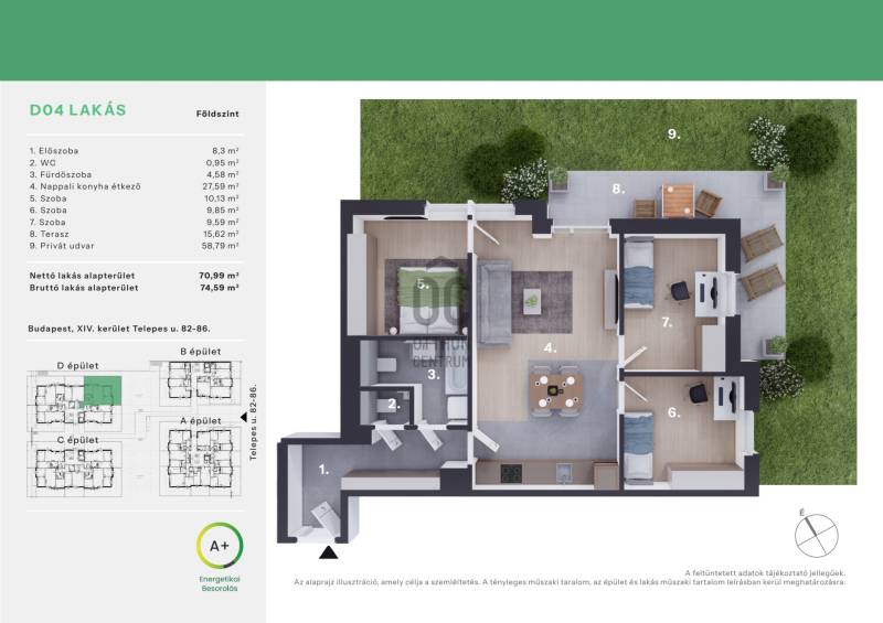 Projekt bemutatásaA Daisy Liget Zugló csendes részén épül, közel a Bosnyék térhez. A megújult kertvárosias környezet a pesti oldal egyik legkedveltebb részei közé tartozik, az itt élők egyszerre élvezhetik a csöndes kis utcák nyugalmát és a belváros közelségét. A Bosnyák téren mindent megtalálunk ami a hétköznapi élethez szükséges: a Zenit corso bevásárlóközpontot, a Bosnyák téri piacot, patikát, éttermeket és kávézókat.Számos óvodát, általános iskolát, játszóteret és sportközpontot is találunk a 10 perces sétatávolságon belül.A társasház különleges homlokzatával, egyedi fiatalos dizájnjával, kiemelkedik a környező épületek közül. A 4 emelet magas, szellősen elhelyezett épületek tökéletesen illeszkednek a környéken jellegzetes, előkertes kialakítású épületekhez.Figyelembe véve a jövő elvárásait, a társasház modern, környezetbarát, mennyezeti hűtő, -fűtő rendszerrel ellátott.Vevőinknek lehetőségük nyílik, hogy új otthonukat az utolsó részletig személyre szabják: változtathatnak az ingatlann elosztásán, széles kollekcióból választhatnak meleg- és hideg burkolatokat, szanitereket. Az alapáras burkolatokon felül, elérhetőek feláras termékek is, mely biztosítja, hogy olyan lakásban lakjanak mit megálmodtak maguknak.A fizetési ütemezés: 10-90%A jelen adatok tájékoztató jellegűek, ezért a Beruházó (sem a hirdető) azok változásával, vagy bármely attól való eltéréssel kapcsolatban semmilyen kötelezettséget, vagy felelősséget nem vállal.Az alaprajzokon ábrázolt berendezési tárgyak és bútorok, a burkolatok megjelenése nem képezi a szerződés tárgyát. A pontos felszereltségről a műszaki leírásban olvashat bővebben.Az aktuális lakáskínálatról és árakról érdeklődjön telefonon!