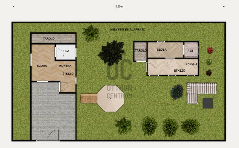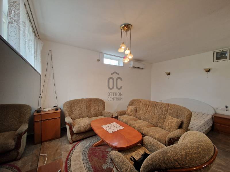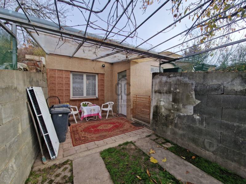 Budakeszi, Nagyszénaszugban, település részen a jelenlegi szabályok szerint külterületen található ingatlan ELADÓ.A 640nm-es telken, 2 külön álló épület van, autó beállási lehetőség.A téglaépítésű ingatlan a szabályozás szerint fel felé még bővíthető az alábbiak szerint:* alapterületben 10%-ig * 5m épület magasságEz az épület jelenleg kb.45nm-es, előszoba, étkező/konyha, szoba, kádas fürdőszoba elosztású.A meleg víz bojlerről üzemel, a fűtést pedig hűtő/fűtő klíma biztosítja.A másik épület téliesített könnyűszerkezetes ház, erre házra egy kis gondoskodás ráfér esztétikailag.Kb.30nm-es, konyha/étkező, kisebb szoba, kisebb fürdőszoba tusolóval elosztású.A fűtés kályhával van megoldva, a meleg vizet szintén bojler adja.Építési besorolás: zárt kert, külterületMk-2 kertes mezőgazdasági területVillany és víz közművek bevezetve.Dél-nyugati panoráma, csend és kimondottan zöld környezet.Több tárolási lehetőség kerti szerszámoknak.Nagyon sok termő gyümölcsfa a telken. Érdemes eljönni megnézni. |