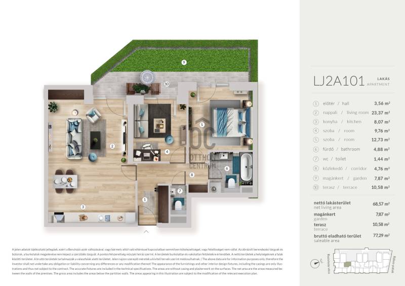 Projekt bemutatásaProjekt leírásA 147 lakásos My Garden 2 lakófejlesztés Budapest XIII. kerületének zöldövezeti részén, a Rákos-patak szomszédságában épül, ahol a modern élet és a természet harmóniája egyedülálló lakóélményt biztosít.A My Garden második ütem lakásai is magas szintű környezettudatosságot és kiemelkedő műszaki tartalmat képviselnek. Olyan fenntarthatósági megoldásokat alkalmazunk a lakóparkon, mint a megújuló energiaforrások, környezettudatos anyaghasználat, esővíz-újrahasznosítás, szelektív építési hulladékkezelés és felület hűtés-fűtés. A háromrétegű nyílászárók kiváló hő- és hangszigetelést biztosítanak, így a My Garden második ütemének lakásai alacsony fenntartási költségekkel és optimális komfortérzettel bírnak majd.A Váci úttól mindössze 10 percre található. A környék kifejezetten jó infrastruktúrával rendelkezik: oktatási intézményekben, bevásárlási lehetőségekben szociális-, sport- és egészségügyi létesítményekben bővelkedik a terület.A 6. emeleti penthouse lakásokból pazar kilátás nyílik a budai hegyekre, a kényelmet pedig biztosítja, hogy a nagy teraszon jacuzzi-nak kialakítható hely is található.A lakásokat átlagon felüli műszaki tartalom, energiahatékony- és gazdaságos üzemeltetés jellemzi.Környezettudatos beruházás, melynek részei a teljes mértékben- megújuló energián alapuló gépészeti megoldások,- a környezettudatos anyaghasználat,- a szelektív hulladékkezelés,- a környezettudatos vízfelhasználás,- az esővíz újrahasznosítása,- illetve a felület hűtés-fűtés.KÖZÖSSÉGI ELŐNYÖK:- közösségi nappali,- Business Corner,- közösségi BBQ hely,- fészer,- csomagpont.A fizetési ütemezés két részletben: 10% szerződéskötéskor és a fennmaradó 90% százalék a használatba vételi engedély kiadása után fizetendő a projektet finanszírozó bank felé.Átadás várható dátuma: 2027. II. negyedévTovábbi információért keressen bizalommal!