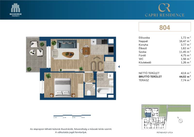 Projekt bemutatásaA Capri Residence a XIII. kerület szívében, a dinamikusan fejlődő Váci út közvetlen közelében valósul meg, amely Budapest egyik legkeresettebb lakáspiaci területe. Az elegáns, modern megjelenésű épületet, a homlokzatán végigfutó üvegkorlátos teraszok díszítik majd, a felsőbb szinteken pedig nagyteraszos lakások is elérhetők, amelyek egy része panorámás kilátást biztosít.Az épületben összesen 112 lakás kap helyet, amelyek elrendezése a stúdiótól a nappali plusz három hálószobásig terjednek. Az épületben emellett egy közösségi tér, 122 parkolóhely, 62 tároló, valamint opcionálisan elektromos autótöltővel szerelt teremgarázs beállók is megépítésre kerülnek.A műszaki felszereltség a legmagasabb szakmai trendeket követi: a Capri Residence lakóinak kényelmét mennyezeti hűtés-fűtés, háromrétegű üvegezéssel ellátott műanyag nyílászárók, smart-home előkészítés, valamint belsőépítész által összeállított belső anyagválaszték biztosítja majd. A földszinti lakásokhoz privát kertkapcsolat tartozik, emellett a társasház közös díszkerttel is rendelkezik. |