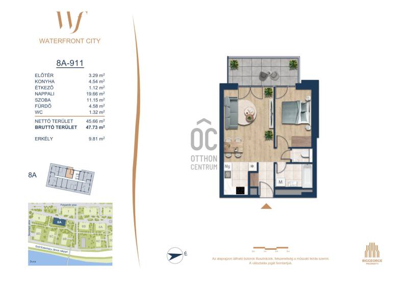 Projekt bemutatásaA projektrőlA Waterfront City egy új, modern városnegyed a 3. kerületben, ahol a természet közelsége és a városi kényelem tökéletes egyensúlyban van. A Duna-part közvetlen szomszédságában elhelyezkedő fejlesztés különleges atmoszférát kínál: a sétányt új épületek határolják, üzletekkel, kávézókkal és szolgáltatásokkal, amelyek élhető közösségi teret teremtenek.A 13 emeletes lakóépületből lenyűgöző örökpanoráma nyílik a budai hegyekre és a folyóra, a tágas teraszok pedig ideálisak a pihenéshez vagy a baráti összejövetelekhez. A zöldtetők, parkosított terek és fenntartható megoldások – mint az energiatakarékos rendszerek és okos otthon funkciók – mind hozzájárulnak a modern, környezettudatos életstílushoz.Látogass el értékesítési irodánkba, és tekintsd meg a városnegyed makettjét személyesen! Ismerd meg, milyen lesz az élet Budapest egyik legizgalmasabb új fejlesztésében!Óbuda szívébenKépzeld el, ahogy egy napsütéses délelőttön Óbuda szívében sétálsz, a Duna közelsége frissítően hat rád, miközben a Folyamőr utca, a Miklós tér és a Bogdáni út által határolt, öt hektáros területre érsz. A levegőben ott van a város történelme, mégis minden részletében a jövő hívogat.A 50 000 négyzetméteres területen egy hangulatos sétány vezet végig, amely egyenesen az óbudai Fő térre visz – mindössze 600 méterre. Ez a sétány nem csupán összeköt, hanem élményt nyújt: a Kolosy térről induló Óbudai Promenád részeként a város egyik legélhetőbb, legpezsgőbb szakaszán haladsz végig. És ha biciklivel érkeznél? A nemzetközi kerékpárút is itt halad el, Szentendre felé vezetve.Az 5. ütemben épülő 149 lakás mindegyike egyedi hangulatot kínál. Ahogy belépsz egy-egy otthonba, a hatalmas üvegfelületeken át beáradó fény és a tágas, szellős terek azonnal magukkal ragadnak. A kilátás? A Kaszap István park zöldje nyújt békét, míg a felsőbb emeletekről a Budai-hegység örökpanorámája tárul eléd – minden nap egy új festmény az ablakodban.A 6. ütemben 316 modern lakás épül, tágas teraszokkal és lenyűgöző kilátással a Dunára és a budai hegyekre. A lakók kényelmét őrszolgálat, kamerarendszer, mélygarázs, vendéglátóhelyek, belső park, játszótér és E-autó töltők szolgálják. Ez a projekt utolsó üteme, amely még közvetlen Duna-parti kapcsolattal rendelkezik.