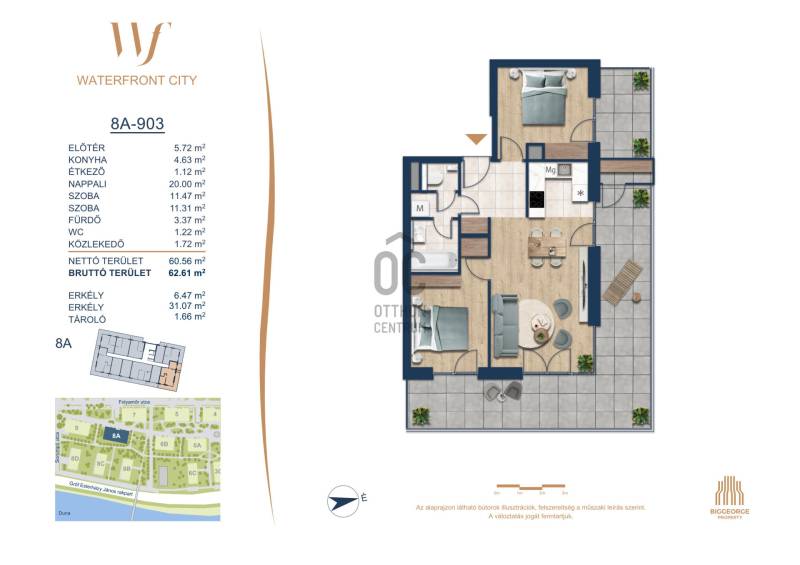 Projekt bemutatásaA projektrőlA Waterfront City egy új, modern városnegyed a 3. kerületben, ahol a természet közelsége és a városi kényelem tökéletes egyensúlyban van. A Duna-part közvetlen szomszédságában elhelyezkedő fejlesztés különleges atmoszférát kínál: a sétányt új épületek határolják, üzletekkel, kávézókkal és szolgáltatásokkal, amelyek élhető közösségi teret teremtenek.A 13 emeletes lakóépületből lenyűgöző örökpanoráma nyílik a budai hegyekre és a folyóra, a tágas teraszok pedig ideálisak a pihenéshez vagy a baráti összejövetelekhez. A zöldtetők, parkosított terek és fenntartható megoldások – mint az energiatakarékos rendszerek és okos otthon funkciók – mind hozzájárulnak a modern, környezettudatos életstílushoz.Látogass el értékesítési irodánkba, és tekintsd meg a városnegyed makettjét személyesen! Ismerd meg, milyen lesz az élet Budapest egyik legizgalmasabb új fejlesztésében!Óbuda szívébenKépzeld el, ahogy egy napsütéses délelőttön Óbuda szívében sétálsz, a Duna közelsége frissítően hat rád, miközben a Folyamőr utca, a Miklós tér és a Bogdáni út által határolt, öt hektáros területre érsz. A levegőben ott van a város történelme, mégis minden részletében a jövő hívogat.A 50 000 négyzetméteres területen egy hangulatos sétány vezet végig, amely egyenesen az óbudai Fő térre visz – mindössze 600 méterre. Ez a sétány nem csupán összeköt, hanem élményt nyújt: a Kolosy térről induló Óbudai Promenád részeként a város egyik legélhetőbb, legpezsgőbb szakaszán haladsz végig. És ha biciklivel érkeznél? A nemzetközi kerékpárút is itt halad el, Szentendre felé vezetve.Az 5. ütemben épülő 149 lakás mindegyike egyedi hangulatot kínál. Ahogy belépsz egy-egy otthonba, a hatalmas üvegfelületeken át beáradó fény és a tágas, szellős terek azonnal magukkal ragadnak. A kilátás? A Kaszap István park zöldje nyújt békét, míg a felsőbb emeletekről a Budai-hegység örökpanorámája tárul eléd – minden nap egy új festmény az ablakodban.A 6. ütemben 316 modern lakás épül, tágas teraszokkal és lenyűgöző kilátással a Dunára és a budai hegyekre. A lakók kényelmét őrszolgálat, kamerarendszer, mélygarázs, vendéglátóhelyek, belső park, játszótér és E-autó töltők szolgálják. Ez a projekt utolsó üteme, amely még közvetlen Duna-parti kapcsolattal rendelkezik.