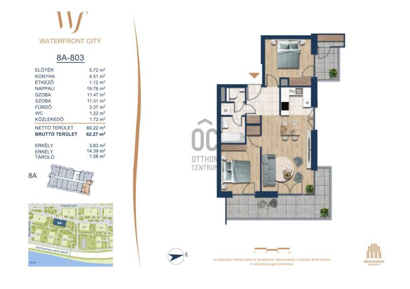 Projekt bemutatásaA projektrőlA Waterfront City egy új, modern városnegyed a 3. kerületben, ahol a természet közelsége és a városi kényelem tökéletes egyensúlyban van. A Duna-part közvetlen szomszédságában elhelyezkedő fejlesztés különleges atmoszférát kínál: a sétányt új épületek határolják, üzletekkel, kávézókkal és szolgáltatásokkal, amelyek élhető közösségi teret teremtenek.A 13 emeletes lakóépületből lenyűgöző örökpanoráma nyílik a budai hegyekre és a folyóra, a tágas teraszok pedig ideálisak a pihenéshez vagy a baráti összejövetelekhez. A zöldtetők, parkosított terek és fenntartható megoldások – mint az energiatakarékos rendszerek és okos otthon funkciók – mind hozzájárulnak a modern, környezettudatos életstílushoz.Látogass el értékesítési irodánkba, és tekintsd meg a városnegyed makettjét személyesen! Ismerd meg, milyen lesz az élet Budapest egyik legizgalmasabb új fejlesztésében!Óbuda szívébenKépzeld el, ahogy egy napsütéses délelőttön Óbuda szívében sétálsz, a Duna közelsége frissítően hat rád, miközben a Folyamőr utca, a Miklós tér és a Bogdáni út által határolt, öt hektáros területre érsz. A levegőben ott van a város történelme, mégis minden részletében a jövő hívogat.A 50 000 négyzetméteres területen egy hangulatos sétány vezet végig, amely egyenesen az óbudai Fő térre visz – mindössze 600 méterre. Ez a sétány nem csupán összeköt, hanem élményt nyújt: a Kolosy térről induló Óbudai Promenád részeként a város egyik legélhetőbb, legpezsgőbb szakaszán haladsz végig. És ha biciklivel érkeznél? A nemzetközi kerékpárút is itt halad el, Szentendre felé vezetve.Az 5. ütemben épülő 149 lakás mindegyike egyedi hangulatot kínál. Ahogy belépsz egy-egy otthonba, a hatalmas üvegfelületeken át beáradó fény és a tágas, szellős terek azonnal magukkal ragadnak. A kilátás? A Kaszap István park zöldje nyújt békét, míg a felsőbb emeletekről a Budai-hegység örökpanorámája tárul eléd – minden nap egy új festmény az ablakodban.A 6. ütemben 316 modern lakás épül, tágas teraszokkal és lenyűgöző kilátással a Dunára és a budai hegyekre. A lakók kényelmét őrszolgálat, kamerarendszer, mélygarázs, vendéglátóhelyek, belső park, játszótér és E-autó töltők szolgálják. Ez a projekt utolsó üteme, amely még közvetlen Duna-parti kapcsolattal rendelkezik.
