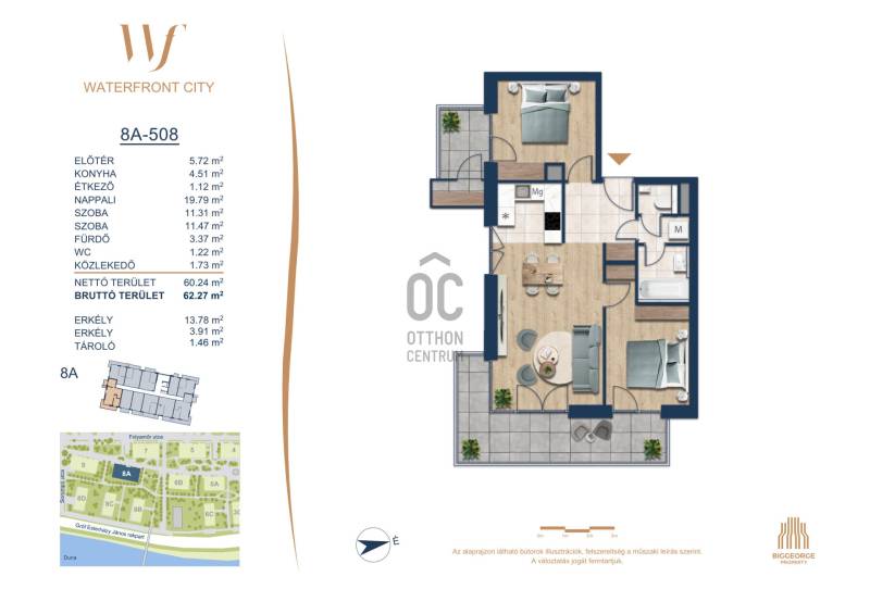 Projekt bemutatásaA projektrőlA Waterfront City egy új, modern városnegyed a 3. kerületben, ahol a természet közelsége és a városi kényelem tökéletes egyensúlyban van. A Duna-part közvetlen szomszédságában elhelyezkedő fejlesztés különleges atmoszférát kínál: a sétányt új épületek határolják, üzletekkel, kávézókkal és szolgáltatásokkal, amelyek élhető közösségi teret teremtenek.A 13 emeletes lakóépületből lenyűgöző örökpanoráma nyílik a budai hegyekre és a folyóra, a tágas teraszok pedig ideálisak a pihenéshez vagy a baráti összejövetelekhez. A zöldtetők, parkosított terek és fenntartható megoldások – mint az energiatakarékos rendszerek és okos otthon funkciók – mind hozzájárulnak a modern, környezettudatos életstílushoz.Látogass el értékesítési irodánkba, és tekintsd meg a városnegyed makettjét személyesen! Ismerd meg, milyen lesz az élet Budapest egyik legizgalmasabb új fejlesztésében!Óbuda szívébenKépzeld el, ahogy egy napsütéses délelőttön Óbuda szívében sétálsz, a Duna közelsége frissítően hat rád, miközben a Folyamőr utca, a Miklós tér és a Bogdáni út által határolt, öt hektáros területre érsz. A levegőben ott van a város történelme, mégis minden részletében a jövő hívogat.A 50 000 négyzetméteres területen egy hangulatos sétány vezet végig, amely egyenesen az óbudai Fő térre visz – mindössze 600 méterre. Ez a sétány nem csupán összeköt, hanem élményt nyújt: a Kolosy térről induló Óbudai Promenád részeként a város egyik legélhetőbb, legpezsgőbb szakaszán haladsz végig. És ha biciklivel érkeznél? A nemzetközi kerékpárút is itt halad el, Szentendre felé vezetve.Az 5. ütemben épülő 149 lakás mindegyike egyedi hangulatot kínál. Ahogy belépsz egy-egy otthonba, a hatalmas üvegfelületeken át beáradó fény és a tágas, szellős terek azonnal magukkal ragadnak. A kilátás? A Kaszap István park zöldje nyújt békét, míg a felsőbb emeletekről a Budai-hegység örökpanorámája tárul eléd – minden nap egy új festmény az ablakodban.A 6. ütemben 316 modern lakás épül, tágas teraszokkal és lenyűgöző kilátással a Dunára és a budai hegyekre. A lakók kényelmét őrszolgálat, kamerarendszer, mélygarázs, vendéglátóhelyek, belső park, játszótér és E-autó töltők szolgálják. Ez a projekt utolsó üteme, amely még közvetlen Duna-parti kapcsolattal rendelkezik.