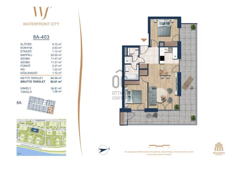 Projekt bemutatásaA projektrőlA Waterfront City egy új, modern városnegyed a 3. kerületben, ahol a természet közelsége és a városi kényelem tökéletes egyensúlyban van. A Duna-part közvetlen szomszédságában elhelyezkedő fejlesztés különleges atmoszférát kínál: a sétányt új épületek határolják, üzletekkel, kávézókkal és szolgáltatásokkal, amelyek élhető közösségi teret teremtenek.A 13 emeletes lakóépületből lenyűgöző örökpanoráma nyílik a budai hegyekre és a folyóra, a tágas teraszok pedig ideálisak a pihenéshez vagy a baráti összejövetelekhez. A zöldtetők, parkosított terek és fenntartható megoldások – mint az energiatakarékos rendszerek és okos otthon funkciók – mind hozzájárulnak a modern, környezettudatos életstílushoz.Látogass el értékesítési irodánkba, és tekintsd meg a városnegyed makettjét személyesen! Ismerd meg, milyen lesz az élet Budapest egyik legizgalmasabb új fejlesztésében!Óbuda szívébenKépzeld el, ahogy egy napsütéses délelőttön Óbuda szívében sétálsz, a Duna közelsége frissítően hat rád, miközben a Folyamőr utca, a Miklós tér és a Bogdáni út által határolt, öt hektáros területre érsz. A levegőben ott van a város történelme, mégis minden részletében a jövő hívogat.A 50 000 négyzetméteres területen egy hangulatos sétány vezet végig, amely egyenesen az óbudai Fő térre visz – mindössze 600 méterre. Ez a sétány nem csupán összeköt, hanem élményt nyújt: a Kolosy térről induló Óbudai Promenád részeként a város egyik legélhetőbb, legpezsgőbb szakaszán haladsz végig. És ha biciklivel érkeznél? A nemzetközi kerékpárút is itt halad el, Szentendre felé vezetve.Az 5. ütemben épülő 149 lakás mindegyike egyedi hangulatot kínál. Ahogy belépsz egy-egy otthonba, a hatalmas üvegfelületeken át beáradó fény és a tágas, szellős terek azonnal magukkal ragadnak. A kilátás? A Kaszap István park zöldje nyújt békét, míg a felsőbb emeletekről a Budai-hegység örökpanorámája tárul eléd – minden nap egy új festmény az ablakodban.A 6. ütemben 316 modern lakás épül, tágas teraszokkal és lenyűgöző kilátással a Dunára és a budai hegyekre. A lakók kényelmét őrszolgálat, kamerarendszer, mélygarázs, vendéglátóhelyek, belső park, játszótér és E-autó töltők szolgálják. Ez a projekt utolsó üteme, amely még közvetlen Duna-parti kapcsolattal rendelkezik.