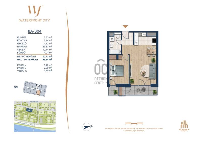 Projekt bemutatásaA projektrőlA Waterfront City egy új, modern városnegyed a 3. kerületben, ahol a természet közelsége és a városi kényelem tökéletes egyensúlyban van. A Duna-part közvetlen szomszédságában elhelyezkedő fejlesztés különleges atmoszférát kínál: a sétányt új épületek határolják, üzletekkel, kávézókkal és szolgáltatásokkal, amelyek élhető közösségi teret teremtenek.A 13 emeletes lakóépületből lenyűgöző örökpanoráma nyílik a budai hegyekre és a folyóra, a tágas teraszok pedig ideálisak a pihenéshez vagy a baráti összejövetelekhez. A zöldtetők, parkosított terek és fenntartható megoldások – mint az energiatakarékos rendszerek és okos otthon funkciók – mind hozzájárulnak a modern, környezettudatos életstílushoz.Látogass el értékesítési irodánkba, és tekintsd meg a városnegyed makettjét személyesen! Ismerd meg, milyen lesz az élet Budapest egyik legizgalmasabb új fejlesztésében!Óbuda szívébenKépzeld el, ahogy egy napsütéses délelőttön Óbuda szívében sétálsz, a Duna közelsége frissítően hat rád, miközben a Folyamőr utca, a Miklós tér és a Bogdáni út által határolt, öt hektáros területre érsz. A levegőben ott van a város történelme, mégis minden részletében a jövő hívogat.A 50 000 négyzetméteres területen egy hangulatos sétány vezet végig, amely egyenesen az óbudai Fő térre visz – mindössze 600 méterre. Ez a sétány nem csupán összeköt, hanem élményt nyújt: a Kolosy térről induló Óbudai Promenád részeként a város egyik legélhetőbb, legpezsgőbb szakaszán haladsz végig. És ha biciklivel érkeznél? A nemzetközi kerékpárút is itt halad el, Szentendre felé vezetve.Az 5. ütemben épülő 149 lakás mindegyike egyedi hangulatot kínál. Ahogy belépsz egy-egy otthonba, a hatalmas üvegfelületeken át beáradó fény és a tágas, szellős terek azonnal magukkal ragadnak. A kilátás? A Kaszap István park zöldje nyújt békét, míg a felsőbb emeletekről a Budai-hegység örökpanorámája tárul eléd – minden nap egy új festmény az ablakodban.A 6. ütemben 316 modern lakás épül, tágas teraszokkal és lenyűgöző kilátással a Dunára és a budai hegyekre. A lakók kényelmét őrszolgálat, kamerarendszer, mélygarázs, vendéglátóhelyek, belső park, játszótér és E-autó töltők szolgálják. Ez a projekt utolsó üteme, amely még közvetlen Duna-parti kapcsolattal rendelkezik.