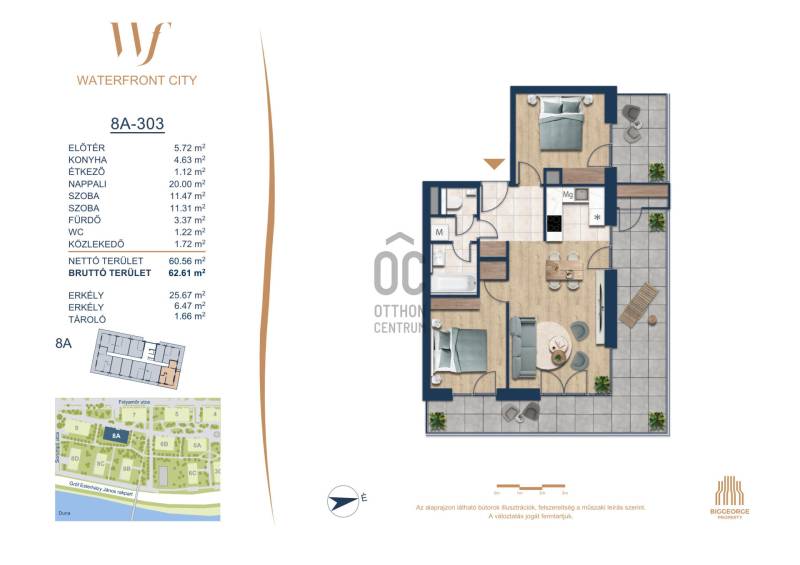 Projekt bemutatásaA projektrőlA Waterfront City egy új, modern városnegyed a 3. kerületben, ahol a természet közelsége és a városi kényelem tökéletes egyensúlyban van. A Duna-part közvetlen szomszédságában elhelyezkedő fejlesztés különleges atmoszférát kínál: a sétányt új épületek határolják, üzletekkel, kávézókkal és szolgáltatásokkal, amelyek élhető közösségi teret teremtenek.A 13 emeletes lakóépületből lenyűgöző örökpanoráma nyílik a budai hegyekre és a folyóra, a tágas teraszok pedig ideálisak a pihenéshez vagy a baráti összejövetelekhez. A zöldtetők, parkosított terek és fenntartható megoldások – mint az energiatakarékos rendszerek és okos otthon funkciók – mind hozzájárulnak a modern, környezettudatos életstílushoz.Látogass el értékesítési irodánkba, és tekintsd meg a városnegyed makettjét személyesen! Ismerd meg, milyen lesz az élet Budapest egyik legizgalmasabb új fejlesztésében!Óbuda szívébenKépzeld el, ahogy egy napsütéses délelőttön Óbuda szívében sétálsz, a Duna közelsége frissítően hat rád, miközben a Folyamőr utca, a Miklós tér és a Bogdáni út által határolt, öt hektáros területre érsz. A levegőben ott van a város történelme, mégis minden részletében a jövő hívogat.A 50 000 négyzetméteres területen egy hangulatos sétány vezet végig, amely egyenesen az óbudai Fő térre visz – mindössze 600 méterre. Ez a sétány nem csupán összeköt, hanem élményt nyújt: a Kolosy térről induló Óbudai Promenád részeként a város egyik legélhetőbb, legpezsgőbb szakaszán haladsz végig. És ha biciklivel érkeznél? A nemzetközi kerékpárút is itt halad el, Szentendre felé vezetve.Az 5. ütemben épülő 149 lakás mindegyike egyedi hangulatot kínál. Ahogy belépsz egy-egy otthonba, a hatalmas üvegfelületeken át beáradó fény és a tágas, szellős terek azonnal magukkal ragadnak. A kilátás? A Kaszap István park zöldje nyújt békét, míg a felsőbb emeletekről a Budai-hegység örökpanorámája tárul eléd – minden nap egy új festmény az ablakodban.A 6. ütemben 316 modern lakás épül, tágas teraszokkal és lenyűgöző kilátással a Dunára és a budai hegyekre. A lakók kényelmét őrszolgálat, kamerarendszer, mélygarázs, vendéglátóhelyek, belső park, játszótér és E-autó töltők szolgálják. Ez a projekt utolsó üteme, amely még közvetlen Duna-parti kapcsolattal rendelkezik.