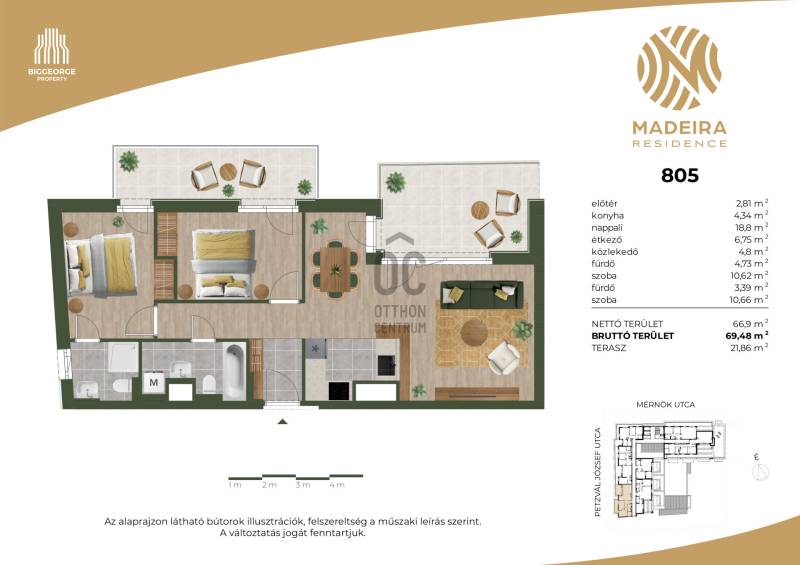Projekt bemutatásaA projektrőlKépzeld el, ahogy belépsz Újbuda egyik legbékésebb, zöldövezeti utcájába, ahol a nyugalom átveszi a helyét a város zajos ritmusától. A Mérnök utcában, a Fehérvári út és az Etele út találkozásának közelében, egy elegánsan modern épület rajzolódik ki előtted – ez a Madeira Residence.Ahogy közelebb lépsz, a homlokzat letisztultsága, a loggiák ritmikus váltakozása azonnal megragadja a tekinteted. A pálcás korlátok finom eleganciát sugároznak, a napfény pedig játékosan tükröződik a teraszok üvegfelületein. Már kívülről is érezni: ez nem csupán egy lakóépület, hanem egy életérzés.Az első emeleti lakások egy része saját tetőkerttel rendelkezik – képzeld el, ahogy reggel a kávédat kortyolgatod a saját kis zöld oázisodban, miközben a madarak csicsergése tölti be a teret. Minden lakásban ott a tágas nappali, a kényelmes hálószobák, és a saját erkély vagy terasz, ahol a nap bármely szakában megpihenhetsz.A Madeira Residence nem csupán egy új építésű társasház – ez egy hely, ahol a modern életstílus találkozik a természet közelségével és a családbarát környezettel. Egy otthon, ahol minden nap élmény.A belső térben a kényelem és a fenntarthatóság kéz a kézben jár. A mennyezeti hűtés-fűtés rendszer csendesen gondoskodik a kellemes hőmérsékletről, az okosotthon-előkészítés pedig lehetővé teszi, hogy a technológia valóban a kényelmedet szolgálja. A mélygarázsban kényelmes parkolás vár, a kerékpártárolók és az elektromos autótöltési lehetőség pedig a környezettudatos életmódot támogatják.A környék infrastruktúrája kiváló: a közelben kiépített kerékpárutak, car sharing szolgáltatások és elektromos rollerek teszik egyszerűvé és fenntarthatóvá a közlekedést. A családosok számára külön öröm, hogy több játszótér is található a közelben – a gyerekek biztonságban, szabadon játszhatnak, miközben a szülők nyugodtan élvezhetik a környék nyugalmát.A Madeira Residence nem csupán egy új lakóépület – ez egy életérzés, ahol a mindennapok élménnyé válnak.