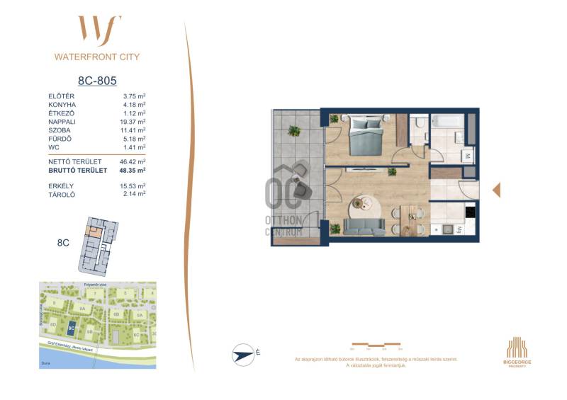 Projekt bemutatásaA projektrőlA Waterfront City egy új, modern városnegyed a 3. kerületben, ahol a természet közelsége és a városi kényelem tökéletes egyensúlyban van. A Duna-part közvetlen szomszédságában elhelyezkedő fejlesztés különleges atmoszférát kínál: a sétányt új épületek határolják, üzletekkel, kávézókkal és szolgáltatásokkal, amelyek élhető közösségi teret teremtenek.A 13 emeletes lakóépületből lenyűgöző örökpanoráma nyílik a budai hegyekre és a folyóra, a tágas teraszok pedig ideálisak a pihenéshez vagy a baráti összejövetelekhez. A zöldtetők, parkosított terek és fenntartható megoldások – mint az energiatakarékos rendszerek és okos otthon funkciók – mind hozzájárulnak a modern, környezettudatos életstílushoz.Látogass el értékesítési irodánkba, és tekintsd meg a városnegyed makettjét személyesen! Ismerd meg, milyen lesz az élet Budapest egyik legizgalmasabb új fejlesztésében!Óbuda szívébenKépzeld el, ahogy egy napsütéses délelőttön Óbuda szívében sétálsz, a Duna közelsége frissítően hat rád, miközben a Folyamőr utca, a Miklós tér és a Bogdáni út által határolt, öt hektáros területre érsz. A levegőben ott van a város történelme, mégis minden részletében a jövő hívogat.A 50 000 négyzetméteres területen egy hangulatos sétány vezet végig, amely egyenesen az óbudai Fő térre visz – mindössze 600 méterre. Ez a sétány nem csupán összeköt, hanem élményt nyújt: a Kolosy térről induló Óbudai Promenád részeként a város egyik legélhetőbb, legpezsgőbb szakaszán haladsz végig. És ha biciklivel érkeznél? A nemzetközi kerékpárút is itt halad el, Szentendre felé vezetve.Az 5. ütemben épülő 149 lakás mindegyike egyedi hangulatot kínál. Ahogy belépsz egy-egy otthonba, a hatalmas üvegfelületeken át beáradó fény és a tágas, szellős terek azonnal magukkal ragadnak. A kilátás? A Kaszap István park zöldje nyújt békét, míg a felsőbb emeletekről a Budai-hegység örökpanorámája tárul eléd – minden nap egy új festmény az ablakodban.A 6. ütemben 316 modern lakás épül, tágas teraszokkal és lenyűgöző kilátással a Dunára és a budai hegyekre. A lakók kényelmét őrszolgálat, kamerarendszer, mélygarázs, vendéglátóhelyek, belső park, játszótér és E-autó töltők szolgálják. Ez a projekt utolsó üteme, amely még közvetlen Duna-parti kapcsolattal rendelkezik.