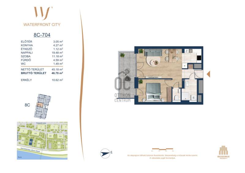 Projekt bemutatásaA projektrőlA Waterfront City egy új, modern városnegyed a 3. kerületben, ahol a természet közelsége és a városi kényelem tökéletes egyensúlyban van. A Duna-part közvetlen szomszédságában elhelyezkedő fejlesztés különleges atmoszférát kínál: a sétányt új épületek határolják, üzletekkel, kávézókkal és szolgáltatásokkal, amelyek élhető közösségi teret teremtenek.A 13 emeletes lakóépületből lenyűgöző örökpanoráma nyílik a budai hegyekre és a folyóra, a tágas teraszok pedig ideálisak a pihenéshez vagy a baráti összejövetelekhez. A zöldtetők, parkosított terek és fenntartható megoldások – mint az energiatakarékos rendszerek és okos otthon funkciók – mind hozzájárulnak a modern, környezettudatos életstílushoz.Látogass el értékesítési irodánkba, és tekintsd meg a városnegyed makettjét személyesen! Ismerd meg, milyen lesz az élet Budapest egyik legizgalmasabb új fejlesztésében!Óbuda szívébenKépzeld el, ahogy egy napsütéses délelőttön Óbuda szívében sétálsz, a Duna közelsége frissítően hat rád, miközben a Folyamőr utca, a Miklós tér és a Bogdáni út által határolt, öt hektáros területre érsz. A levegőben ott van a város történelme, mégis minden részletében a jövő hívogat.A 50 000 négyzetméteres területen egy hangulatos sétány vezet végig, amely egyenesen az óbudai Fő térre visz – mindössze 600 méterre. Ez a sétány nem csupán összeköt, hanem élményt nyújt: a Kolosy térről induló Óbudai Promenád részeként a város egyik legélhetőbb, legpezsgőbb szakaszán haladsz végig. És ha biciklivel érkeznél? A nemzetközi kerékpárút is itt halad el, Szentendre felé vezetve.Az 5. ütemben épülő 149 lakás mindegyike egyedi hangulatot kínál. Ahogy belépsz egy-egy otthonba, a hatalmas üvegfelületeken át beáradó fény és a tágas, szellős terek azonnal magukkal ragadnak. A kilátás? A Kaszap István park zöldje nyújt békét, míg a felsőbb emeletekről a Budai-hegység örökpanorámája tárul eléd – minden nap egy új festmény az ablakodban.A 6. ütemben 316 modern lakás épül, tágas teraszokkal és lenyűgöző kilátással a Dunára és a budai hegyekre. A lakók kényelmét őrszolgálat, kamerarendszer, mélygarázs, vendéglátóhelyek, belső park, játszótér és E-autó töltők szolgálják. Ez a projekt utolsó üteme, amely még közvetlen Duna-parti kapcsolattal rendelkezik.