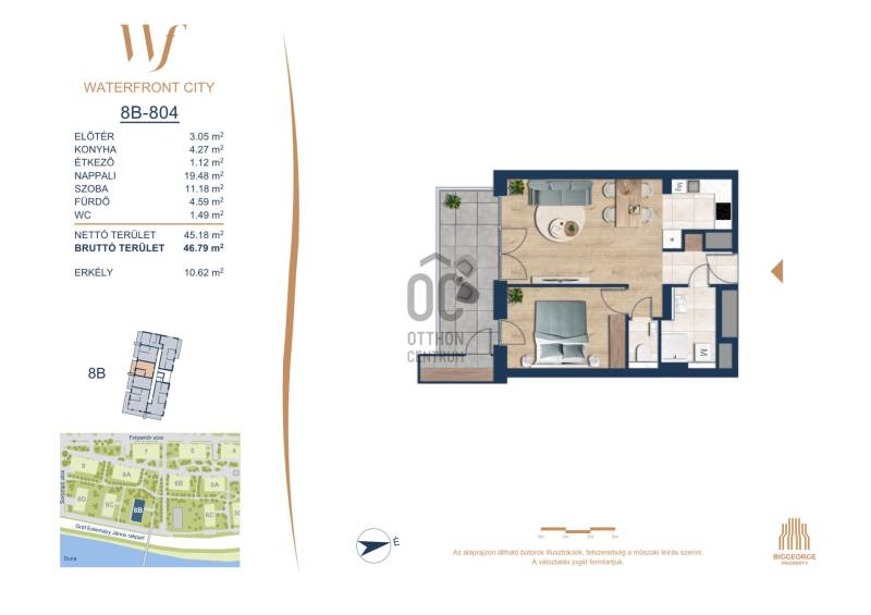 Projekt bemutatásaA projektrőlA Waterfront City egy új, modern városnegyed a 3. kerületben, ahol a természet közelsége és a városi kényelem tökéletes egyensúlyban van. A Duna-part közvetlen szomszédságában elhelyezkedő fejlesztés különleges atmoszférát kínál: a sétányt új épületek határolják, üzletekkel, kávézókkal és szolgáltatásokkal, amelyek élhető közösségi teret teremtenek.A 13 emeletes lakóépületből lenyűgöző örökpanoráma nyílik a budai hegyekre és a folyóra, a tágas teraszok pedig ideálisak a pihenéshez vagy a baráti összejövetelekhez. A zöldtetők, parkosított terek és fenntartható megoldások – mint az energiatakarékos rendszerek és okos otthon funkciók – mind hozzájárulnak a modern, környezettudatos életstílushoz.Látogass el értékesítési irodánkba, és tekintsd meg a városnegyed makettjét személyesen! Ismerd meg, milyen lesz az élet Budapest egyik legizgalmasabb új fejlesztésében!Óbuda szívébenKépzeld el, ahogy egy napsütéses délelőttön Óbuda szívében sétálsz, a Duna közelsége frissítően hat rád, miközben a Folyamőr utca, a Miklós tér és a Bogdáni út által határolt, öt hektáros területre érsz. A levegőben ott van a város történelme, mégis minden részletében a jövő hívogat.A 50 000 négyzetméteres területen egy hangulatos sétány vezet végig, amely egyenesen az óbudai Fő térre visz – mindössze 600 méterre. Ez a sétány nem csupán összeköt, hanem élményt nyújt: a Kolosy térről induló Óbudai Promenád részeként a város egyik legélhetőbb, legpezsgőbb szakaszán haladsz végig. És ha biciklivel érkeznél? A nemzetközi kerékpárút is itt halad el, Szentendre felé vezetve.Az 5. ütemben épülő 149 lakás mindegyike egyedi hangulatot kínál. Ahogy belépsz egy-egy otthonba, a hatalmas üvegfelületeken át beáradó fény és a tágas, szellős terek azonnal magukkal ragadnak. A kilátás? A Kaszap István park zöldje nyújt békét, míg a felsőbb emeletekről a Budai-hegység örökpanorámája tárul eléd – minden nap egy új festmény az ablakodban.A 6. ütemben 316 modern lakás épül, tágas teraszokkal és lenyűgöző kilátással a Dunára és a budai hegyekre. A lakók kényelmét őrszolgálat, kamerarendszer, mélygarázs, vendéglátóhelyek, belső park, játszótér és E-autó töltők szolgálják. Ez a projekt utolsó üteme, amely még közvetlen Duna-parti kapcsolattal rendelkezik.