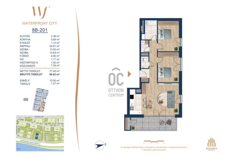 Projekt bemutatásaA projektrőlA Waterfront City egy új, modern városnegyed a 3. kerületben, ahol a természet közelsége és a városi kényelem tökéletes egyensúlyban van. A Duna-part közvetlen szomszédságában elhelyezkedő fejlesztés különleges atmoszférát kínál: a sétányt új épületek határolják, üzletekkel, kávézókkal és szolgáltatásokkal, amelyek élhető közösségi teret teremtenek.A 13 emeletes lakóépületből lenyűgöző örökpanoráma nyílik a budai hegyekre és a folyóra, a tágas teraszok pedig ideálisak a pihenéshez vagy a baráti összejövetelekhez. A zöldtetők, parkosított terek és fenntartható megoldások – mint az energiatakarékos rendszerek és okos otthon funkciók – mind hozzájárulnak a modern, környezettudatos életstílushoz.Látogass el értékesítési irodánkba, és tekintsd meg a városnegyed makettjét személyesen! Ismerd meg, milyen lesz az élet Budapest egyik legizgalmasabb új fejlesztésében!Óbuda szívébenKépzeld el, ahogy egy napsütéses délelőttön Óbuda szívében sétálsz, a Duna közelsége frissítően hat rád, miközben a Folyamőr utca, a Miklós tér és a Bogdáni út által határolt, öt hektáros területre érsz. A levegőben ott van a város történelme, mégis minden részletében a jövő hívogat.A 50 000 négyzetméteres területen egy hangulatos sétány vezet végig, amely egyenesen az óbudai Fő térre visz – mindössze 600 méterre. Ez a sétány nem csupán összeköt, hanem élményt nyújt: a Kolosy térről induló Óbudai Promenád részeként a város egyik legélhetőbb, legpezsgőbb szakaszán haladsz végig. És ha biciklivel érkeznél? A nemzetközi kerékpárút is itt halad el, Szentendre felé vezetve.Az 5. ütemben épülő 149 lakás mindegyike egyedi hangulatot kínál. Ahogy belépsz egy-egy otthonba, a hatalmas üvegfelületeken át beáradó fény és a tágas, szellős terek azonnal magukkal ragadnak. A kilátás? A Kaszap István park zöldje nyújt békét, míg a felsőbb emeletekről a Budai-hegység örökpanorámája tárul eléd – minden nap egy új festmény az ablakodban.A 6. ütemben 316 modern lakás épül, tágas teraszokkal és lenyűgöző kilátással a Dunára és a budai hegyekre. A lakók kényelmét őrszolgálat, kamerarendszer, mélygarázs, vendéglátóhelyek, belső park, játszótér és E-autó töltők szolgálják. Ez a projekt utolsó üteme, amely még közvetlen Duna-parti kapcsolattal rendelkezik.