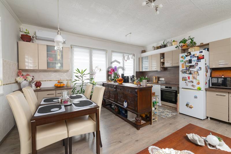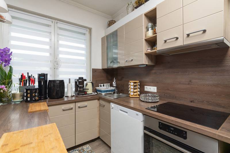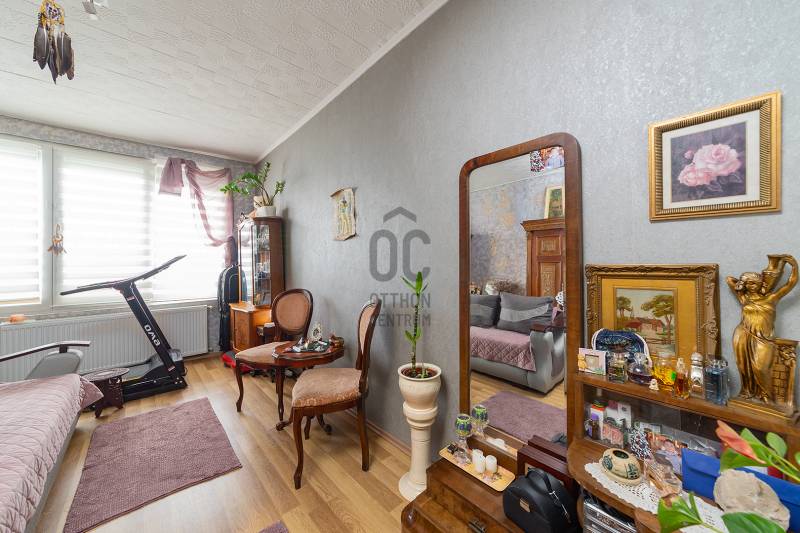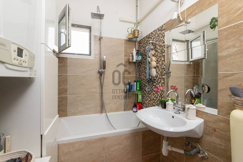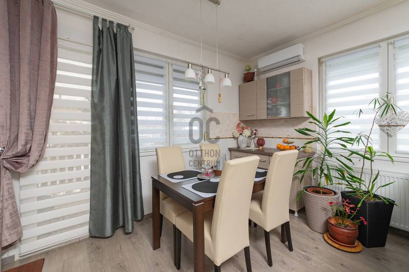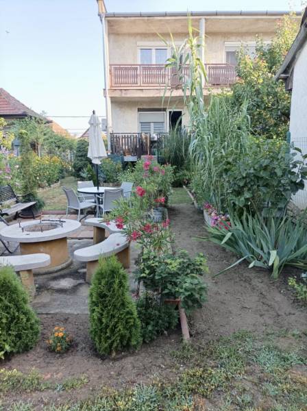 XVII. kerületben Rákoscsaba kertvárosi, családi házas részén (Szent László telep) csendes mellékutcában kínáljuk megvásárlásra egy kétlakásos társasház FELÚJÍTOTT földszinti, 83 nm-es, nappali-konyha-étkező + 3 egész szobás, kertkapcsolatos, napfényes lakását. Az ingatlanhoz 260 nm-es kizárólagos használatú, leválasztott kert, valamint a pinceszinten 1 kisebb személyautó parkolására alkalmas garázs és tároló tartozik (21nm), itt van víz és lefolyó, így mosókonyhaként is használható. Ezen kívül telken belül 1-2 autóval kényelmesen parkolhatunk a felszíni beállón. A lakás bejárata zárt lépcsőházból nyílik, a belső elrendezése kiváló, minden helyisége ablakos, fekvésénél fogva körbesüti a nap, ennek köszönhetően gyönyörű világos. A tágas előszobából nyílik a teraszon át kertkapcsolatos konyha-étkező nappali újszerű, modern bútorral, továbbá 3 külön bejáratú egész szoba, fürdőszoba, külön WC. A nappali D-DK-i tájolású, tartozik hozzá egy 16 nm-es terasz, ahonnan közvetlenül a kertbe jutunk. A szobák frissen parkettázottak (laminált padló), a többi helyiség járólappal burkolt, a fűtést és a használati melegvizet egy kondenzációs kazán adja. A fűtésrendszert, a vízcsöveket, az elektromos hálózatot felújították, a nyílászárókat cserélték korszerű, hőszigetelt üvegezésű műanyag ablakokra redőnyökkel és szúnyoghálóval felszerelve, ezzel együtt a burkolatok, szaniterek is megújultak. A biztonságról riasztó gondoskodik, a nyári melegben a kellemes hőmérsékletről pedig a nappaliban lévő légkondicionáló. Az ingatlan kifogástalan állapotban van, nem igényel felújítást. A falakon egyedi, kézzel készült gyönyörű festés található, mely igazi éke a lakásnak. Fiatalos, modern, letisztult stílus, harmonikus színek. A környék kifejezetten csendes, buszmegálló, bevásárlási lehetőség (Pesti úti Aldi, Lidl) pár perces sétával elérhető. |